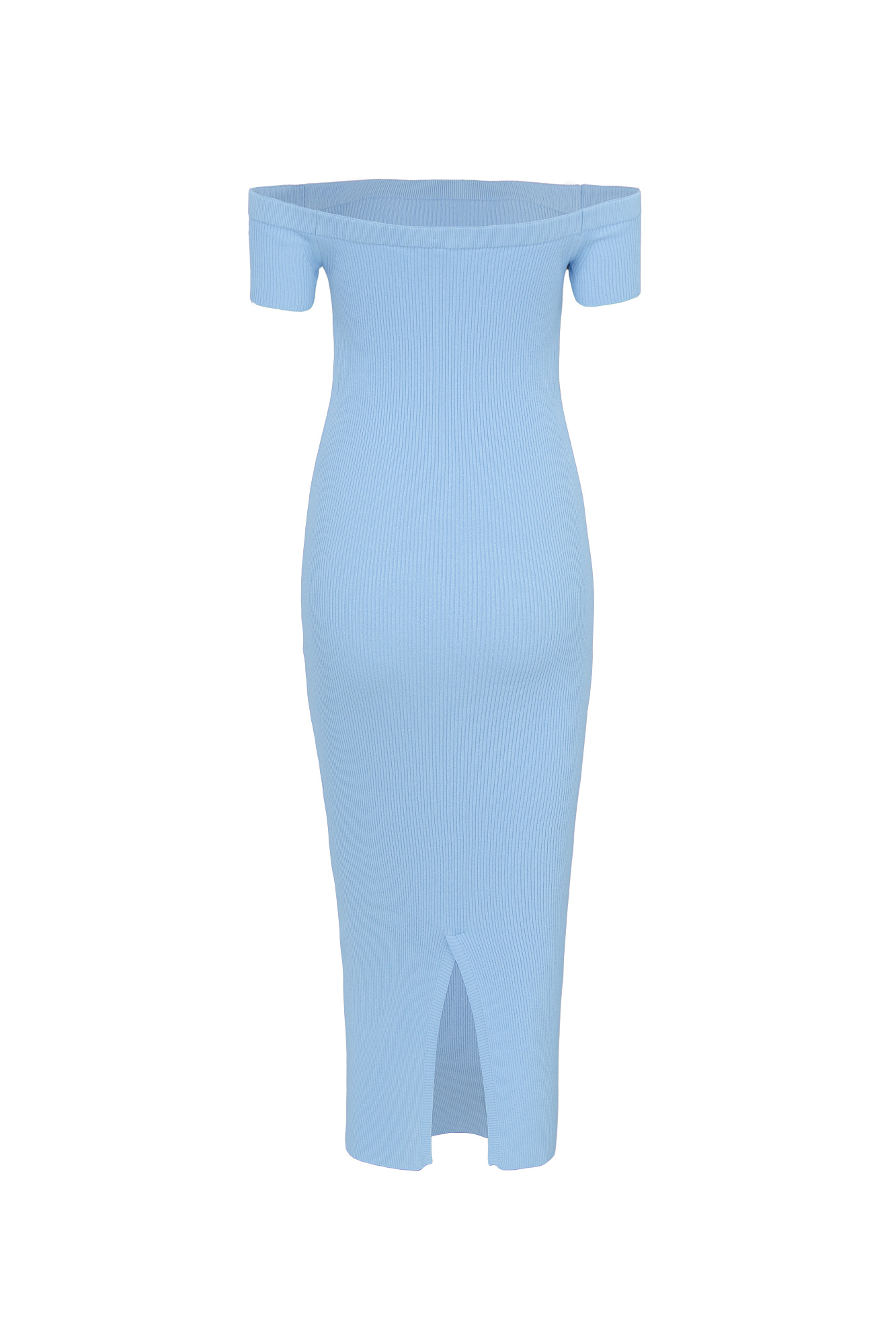 Трикотажное платье из вискозы. Модель приталенного силуэта длины миди, с открытой линией плеч и разрезом сзади.