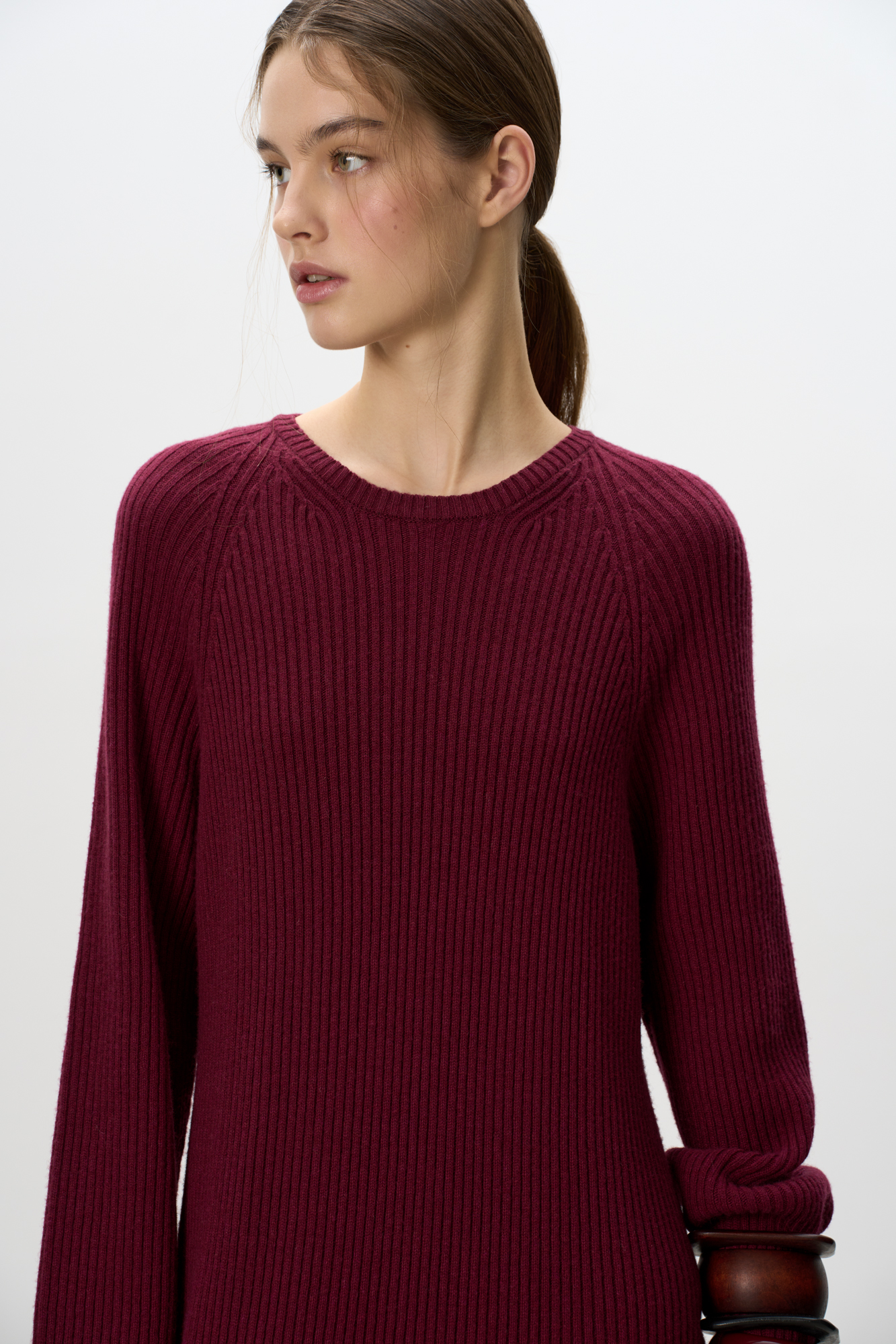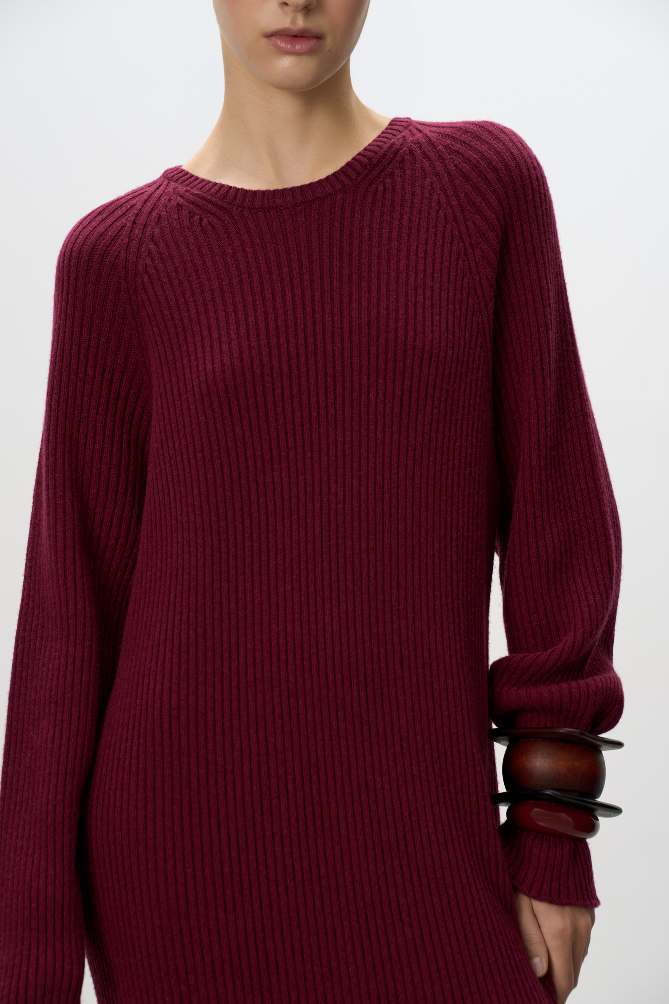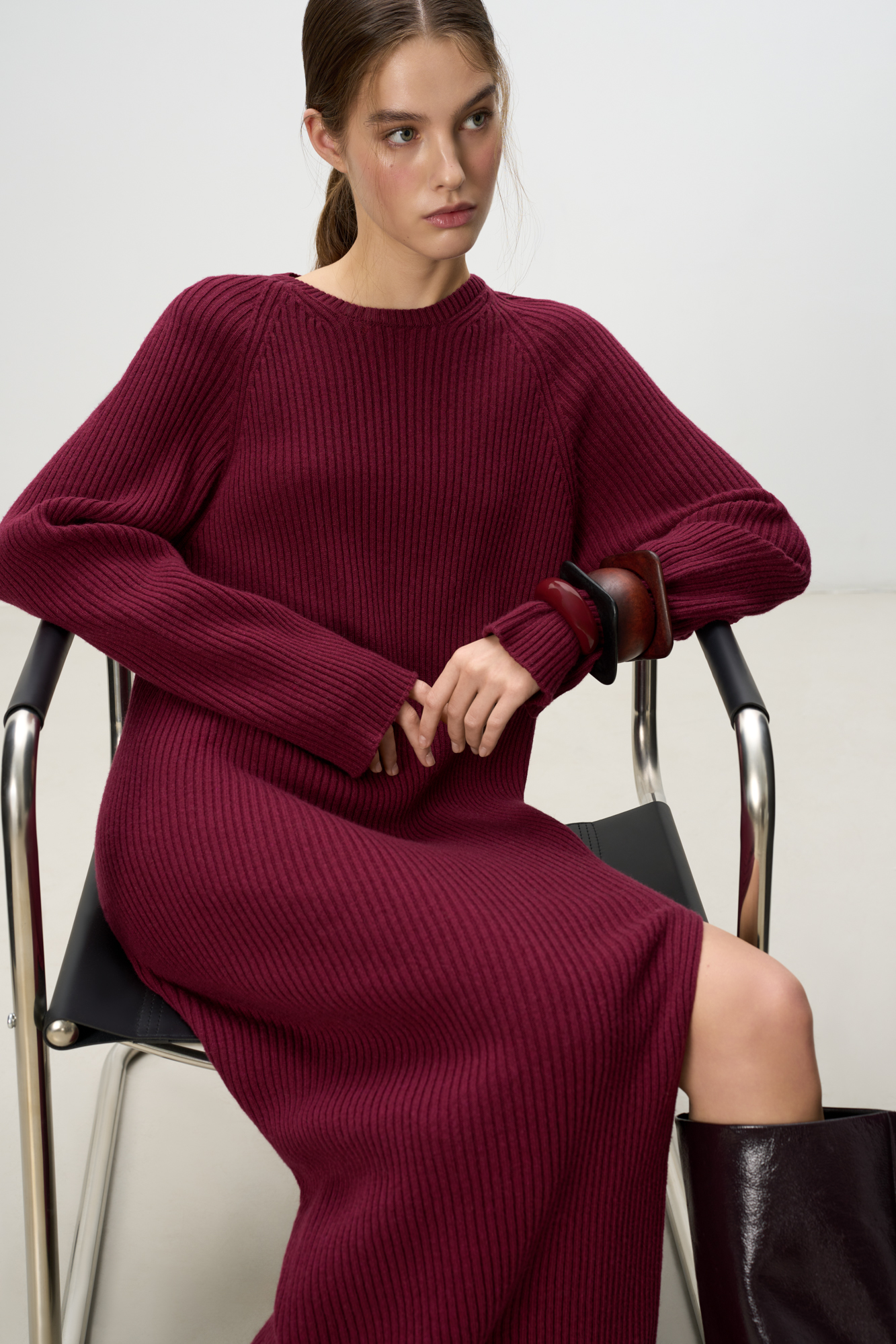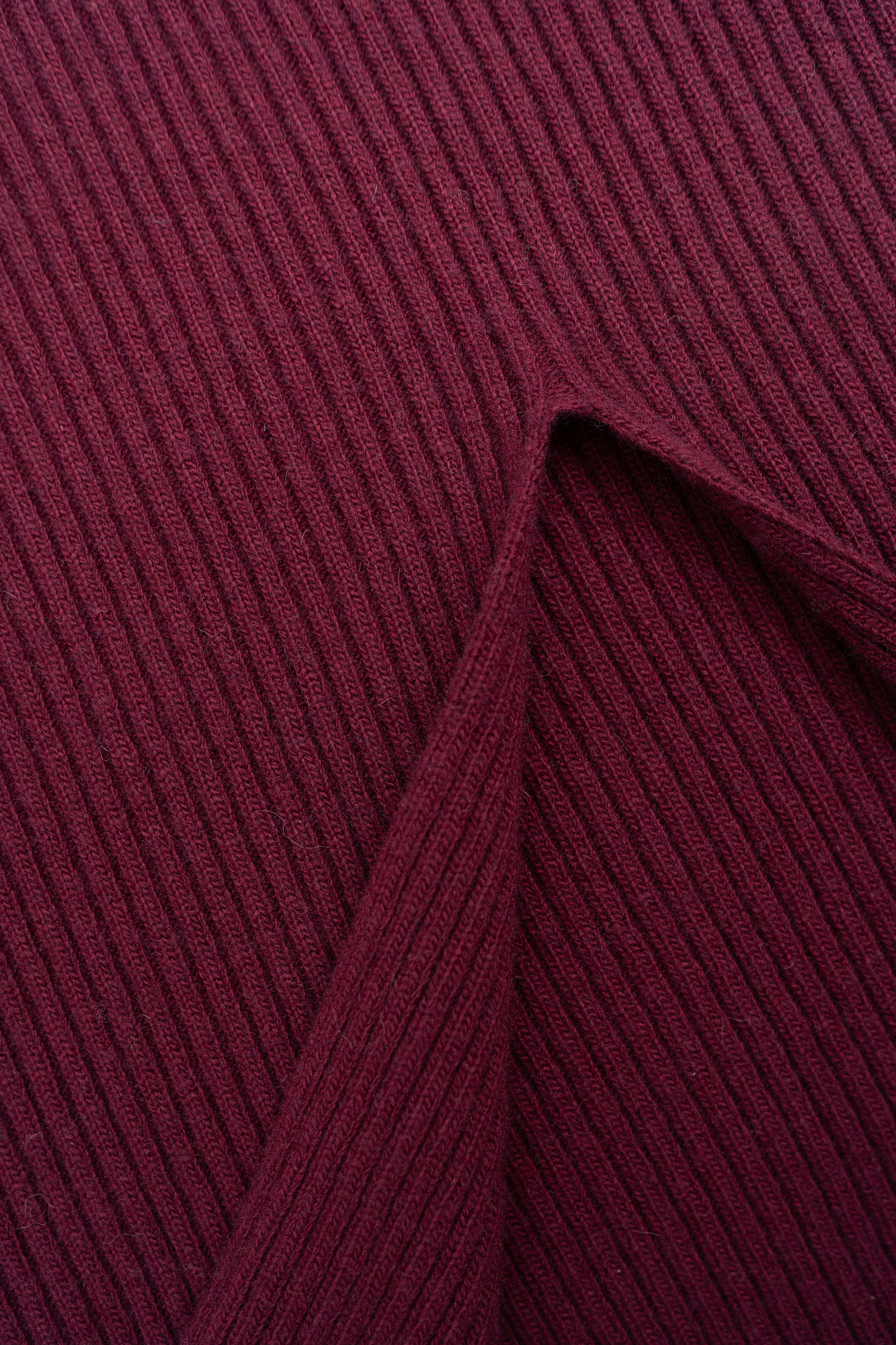 Трикотажное платье из шерсти и кашемира. Модель свободного силуэта в широкий рубчик с разрезом спереди и спущенной линией плеча.