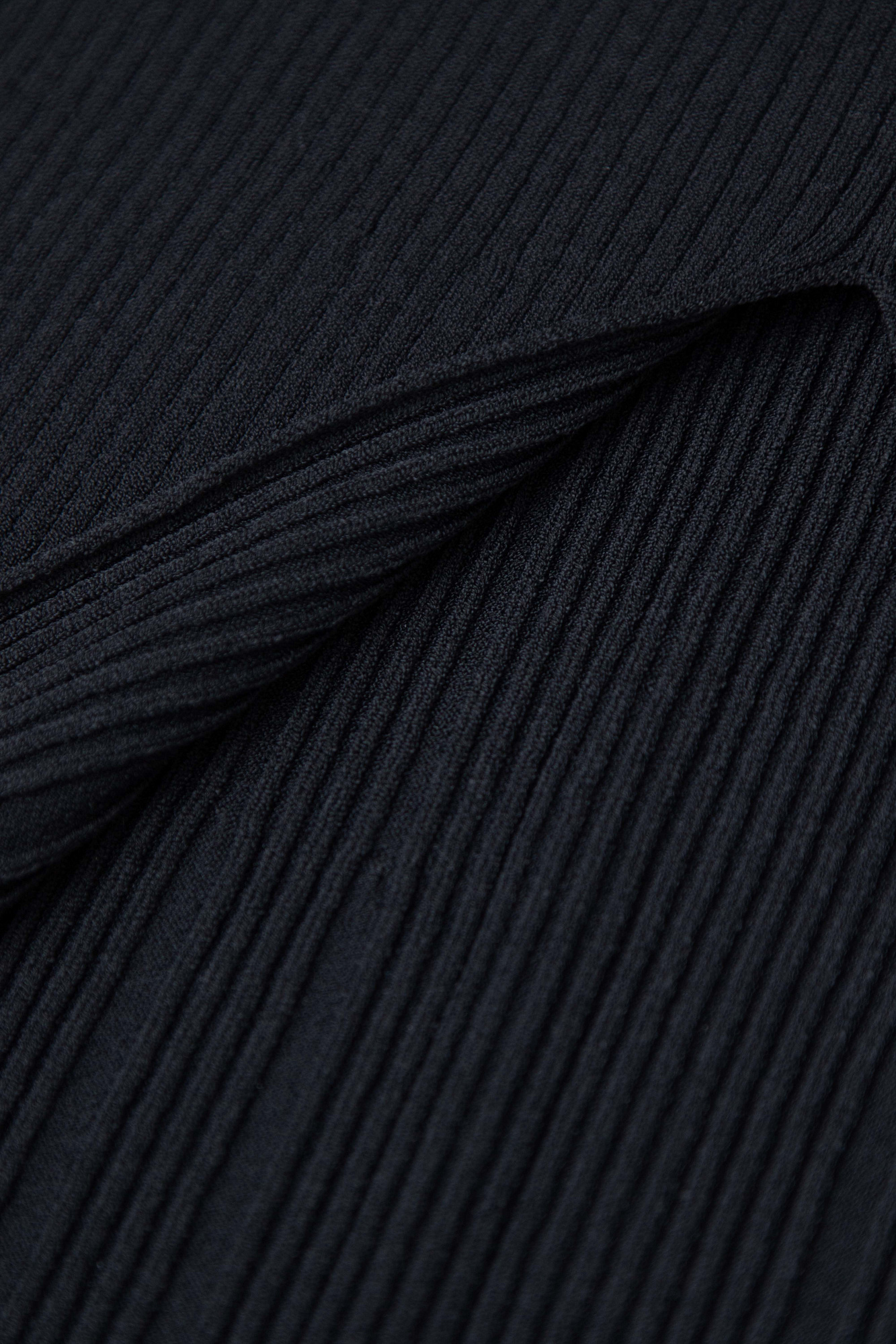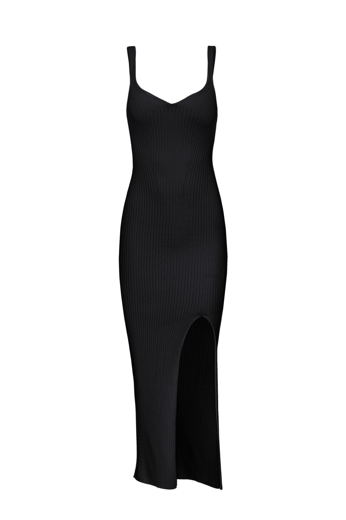 Трикотажное платье длины миди из вискозы. Модель по фируге, на тонких бретельках, с вывязанным фактурным лифом и высоким разрезом спреди. Изделие выполнено в широких рубчик.