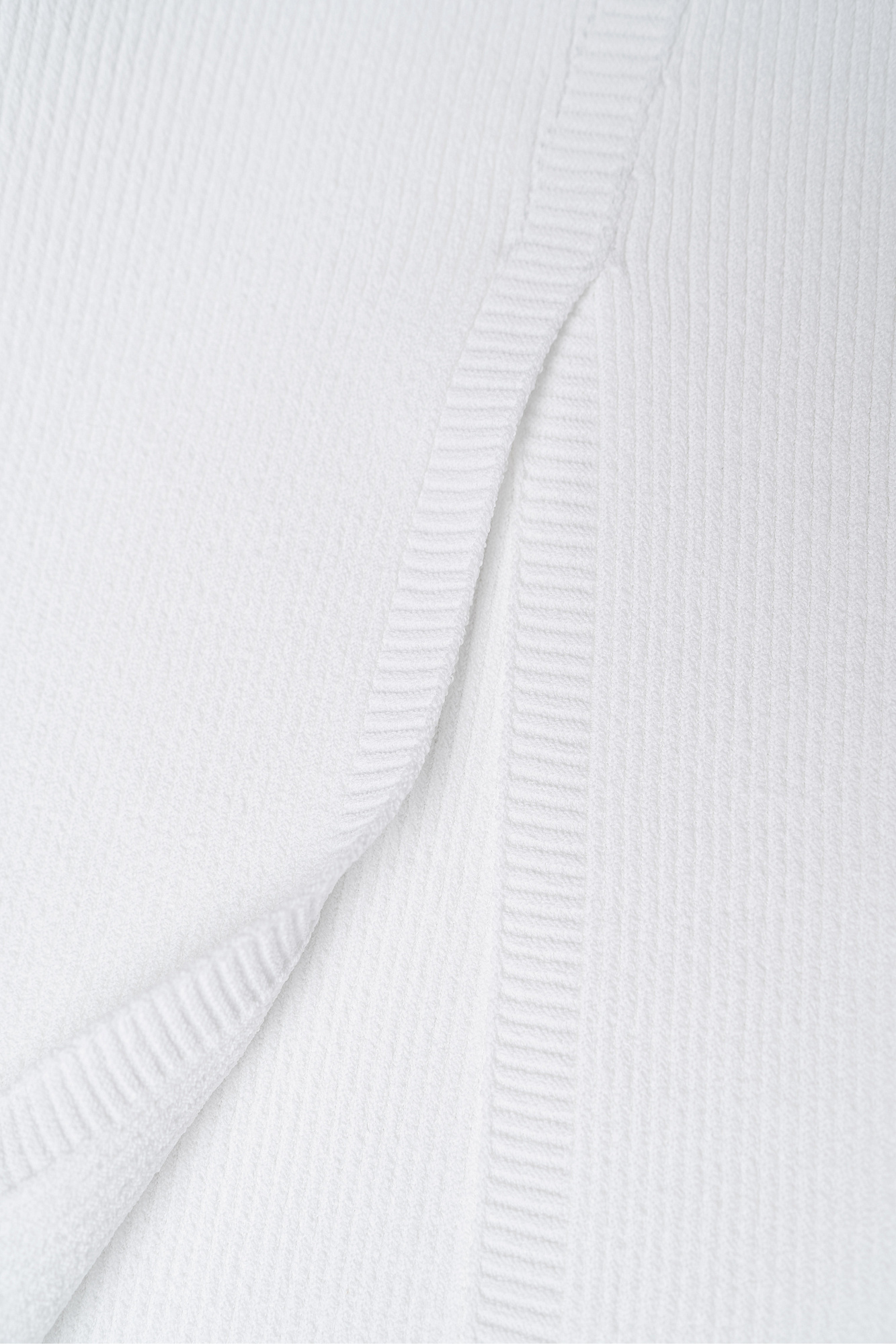 Облегающее трикотажное платье длины миди из вискозы. Модель приталенного силуэта, с короткими рукавами, круглым вырезом горловины, вырезом на спине и высоким разрезом сбоку.