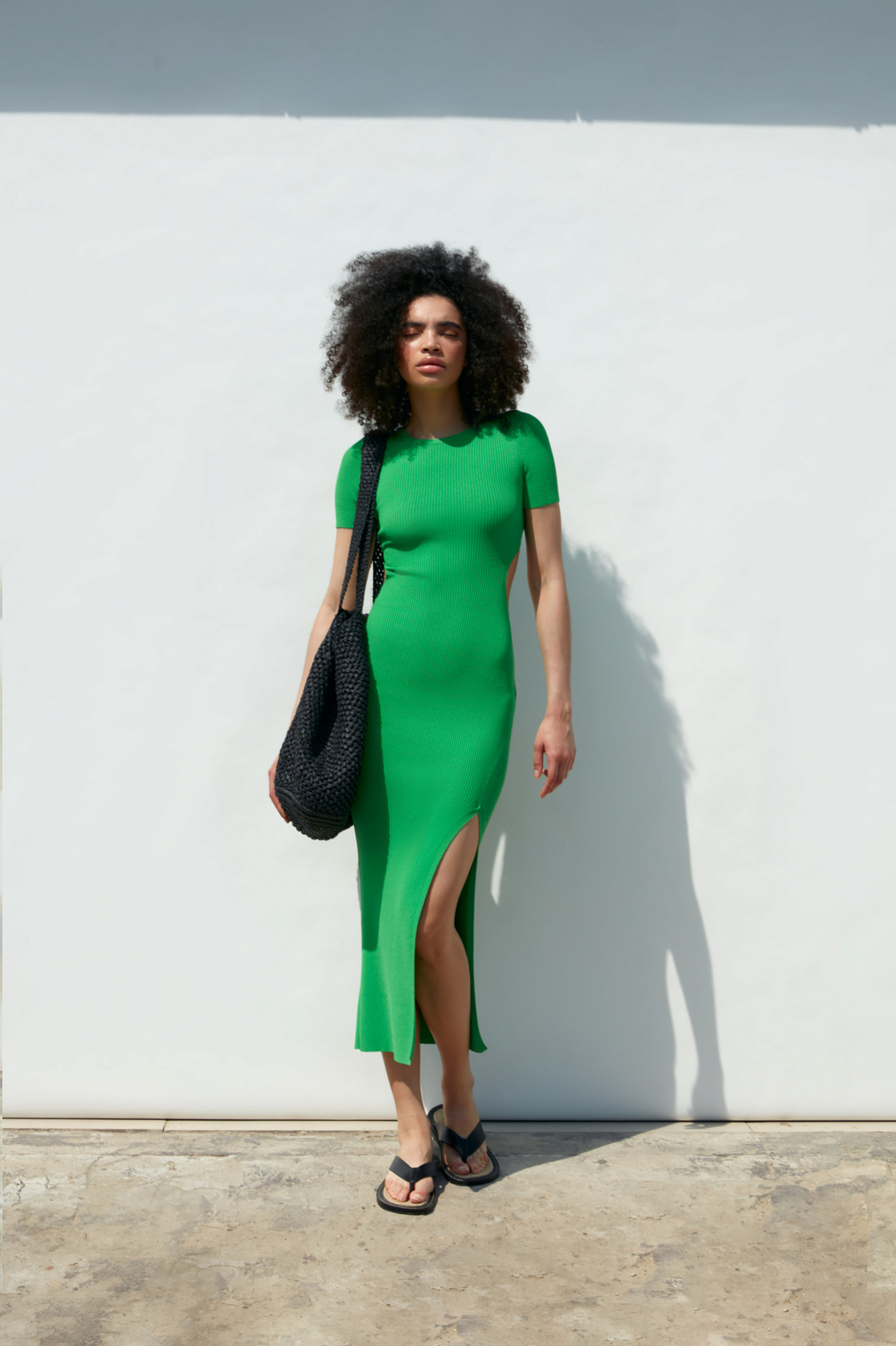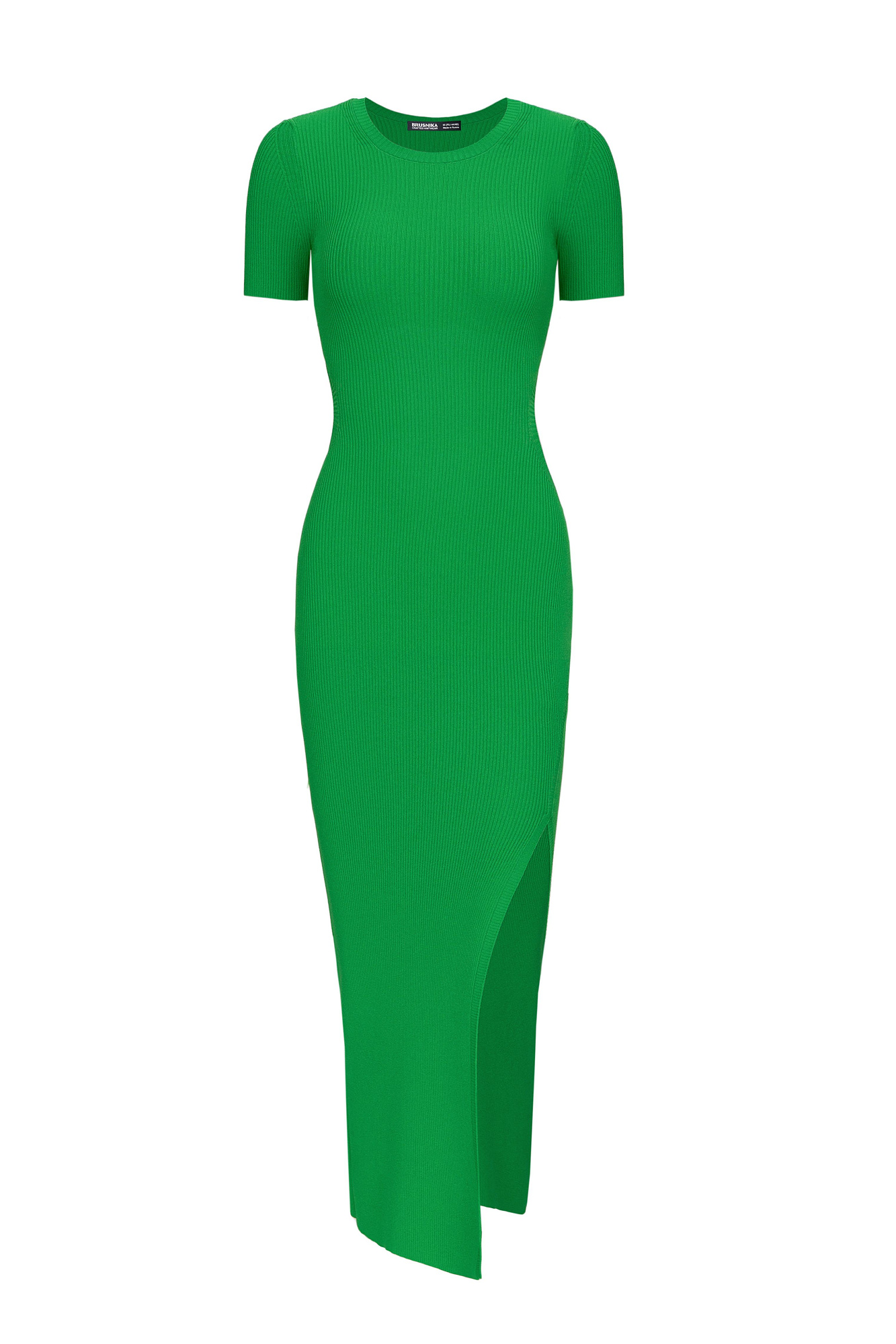 Облегающее трикотажное платье длины миди из вискозы. Модель приталенного силуэта, с короткими рукавами, круглым вырезом горловины, вырезом на спине и высоким разрезом сбоку.