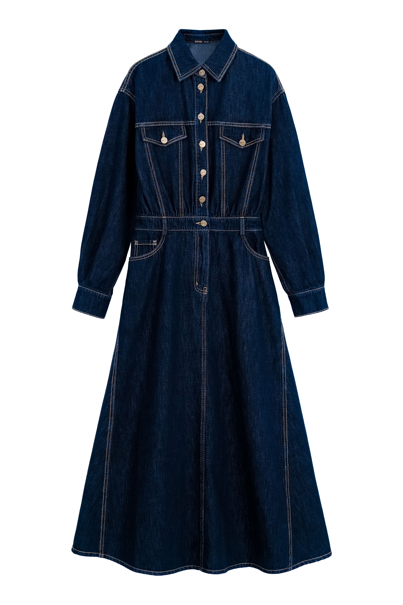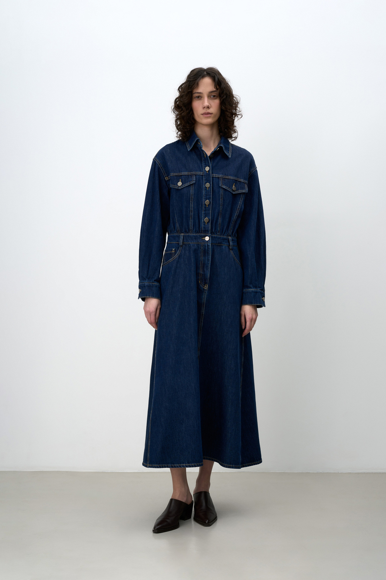 Джинсовое платье из 100% хлопка с рубашечнымм верхом и юбкой А-силуэта. Модель с длинными рукавами с манжетами, отложным воротником, карманами на груди с клапанами, шлевками на поясе для ремня, боковыми и задними карманами. Застежка на металлические пуговицы. Изделие декорировано вытачками контрастного цвета.