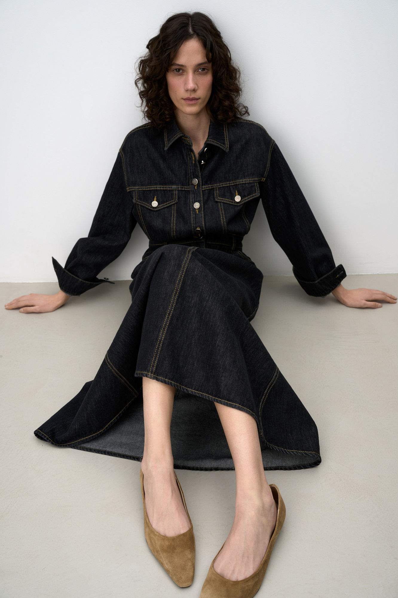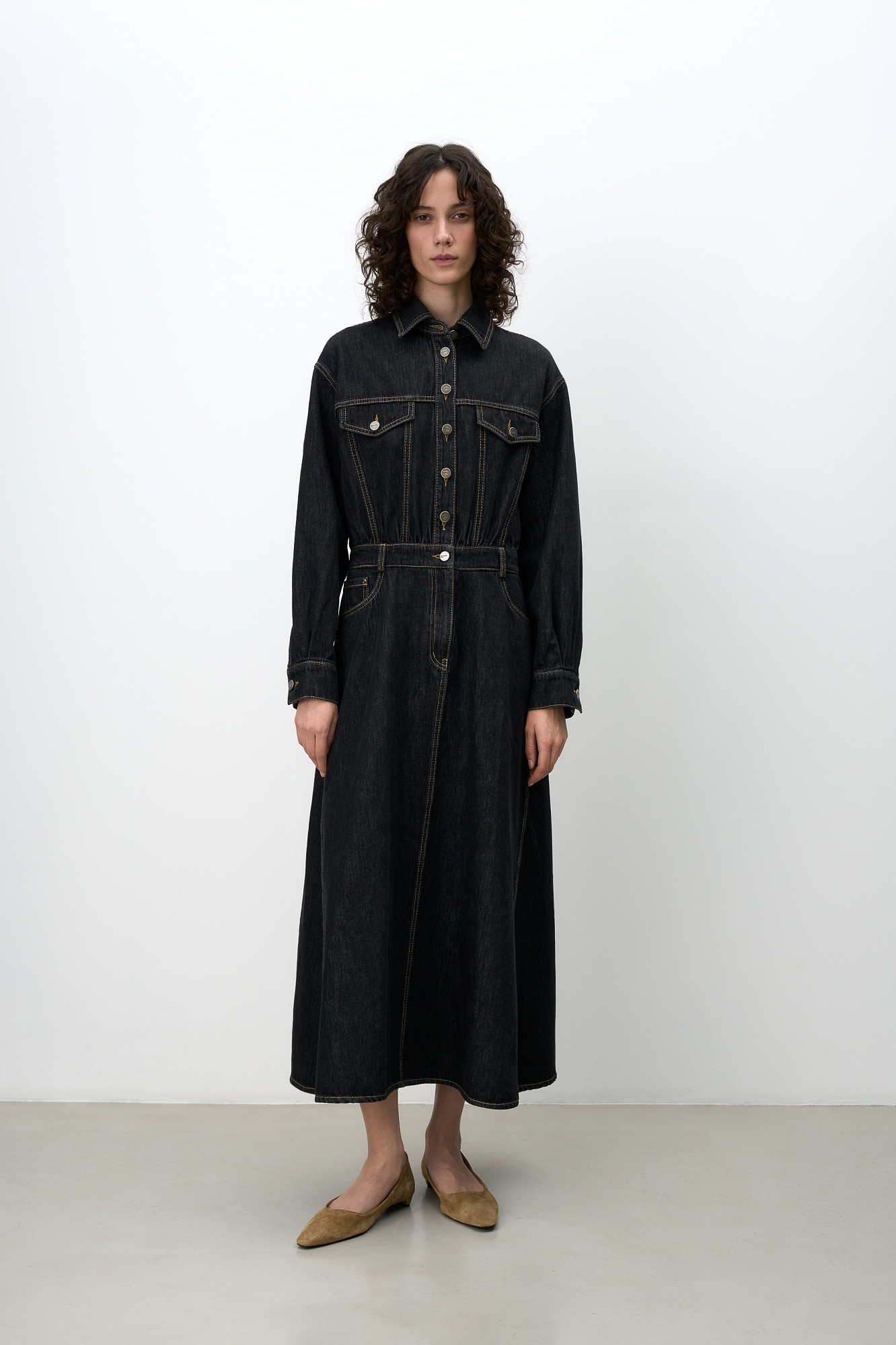 Джинсовое платье из 100% хлопка с длинным рукавом. Модель свободного силуэта с карманами на груди. Застежка на пуговицы.