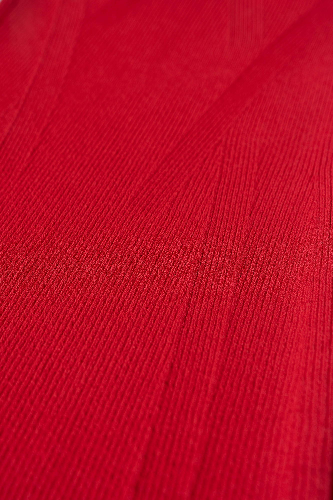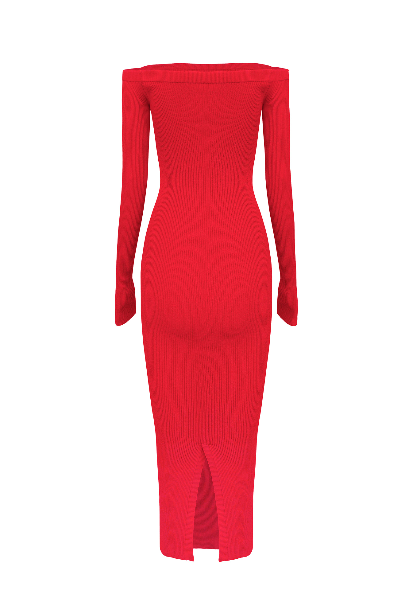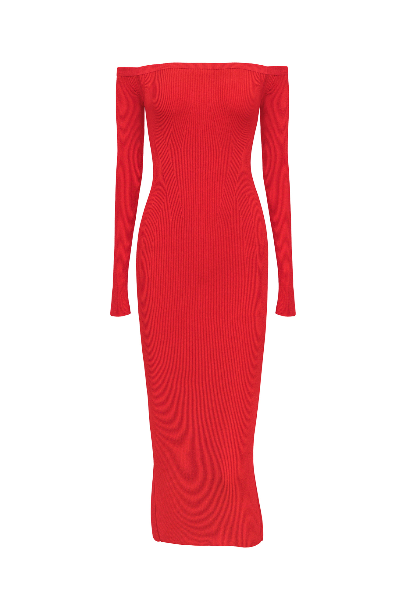 Трикотажное платье из вискозы с открытой линией плеч. Модель приталенного силуэта с разрезом сзади.