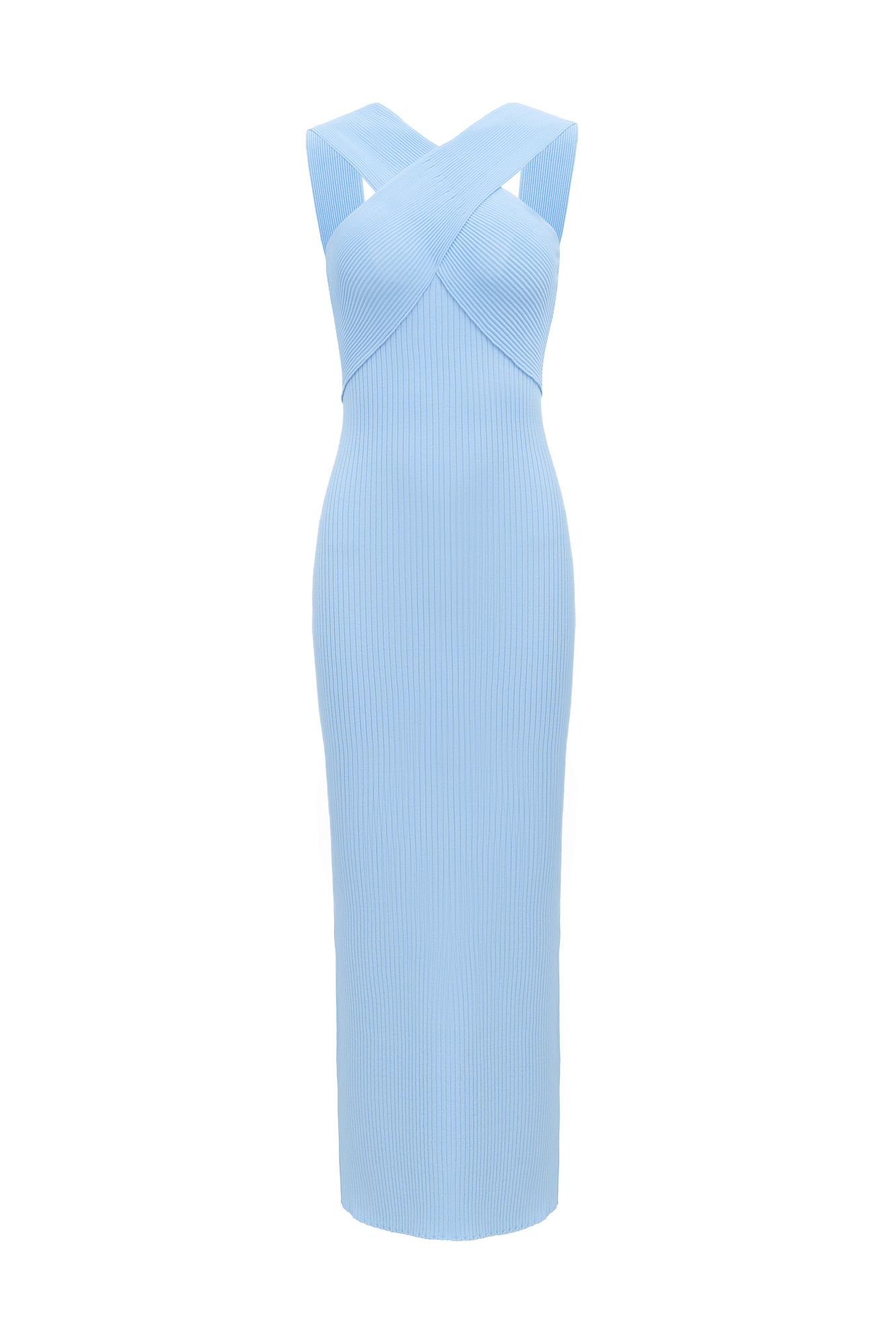 Облегающее длинное трикотажное платье в мелкий рубчик. Изделие декорировано вывязанной перекрещенной деталью на лифе и небольшим разрезом сзади.