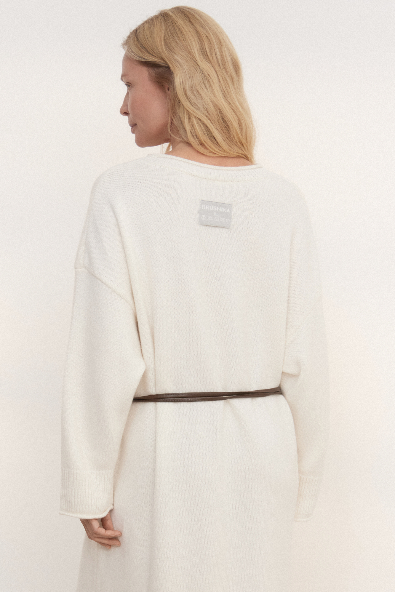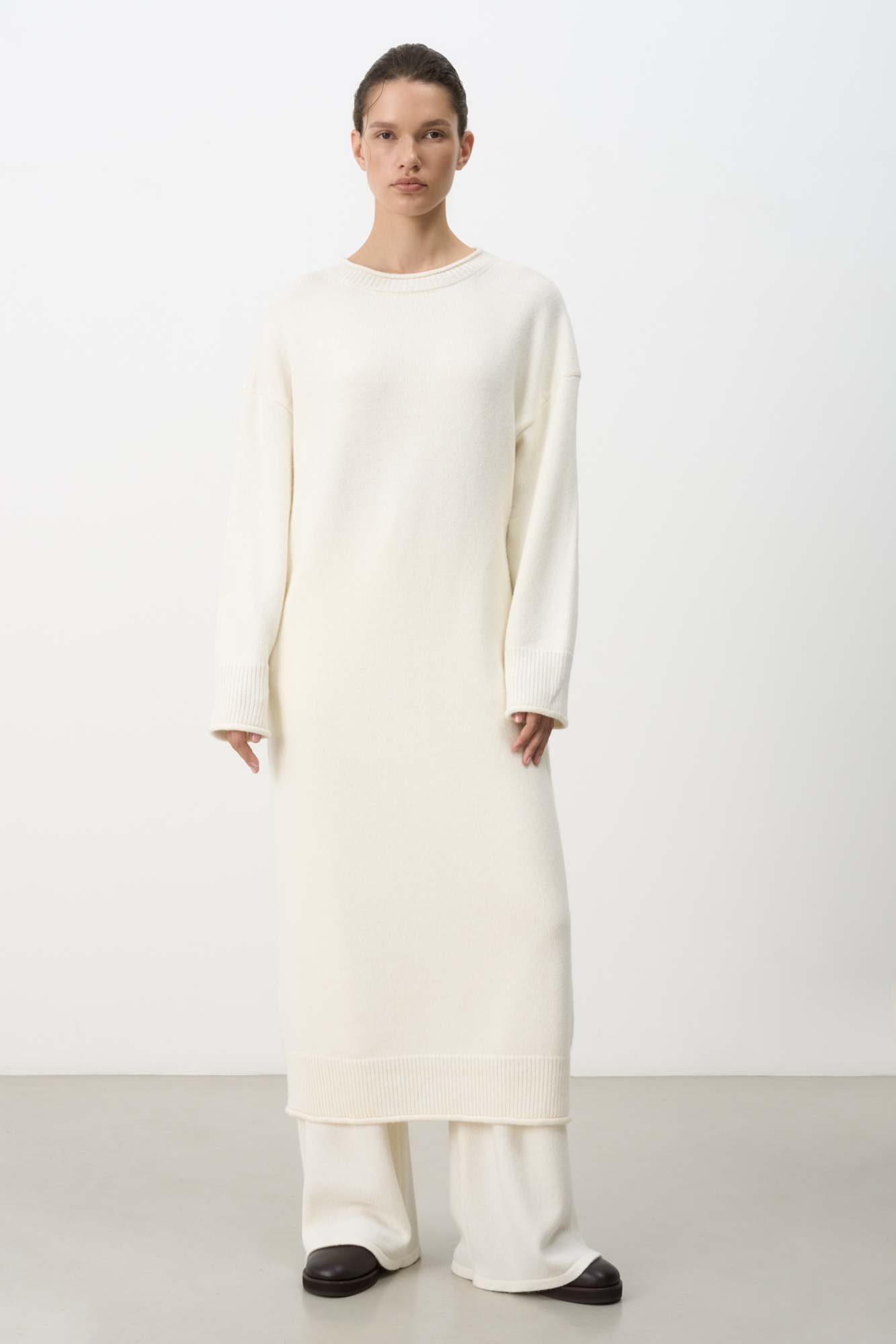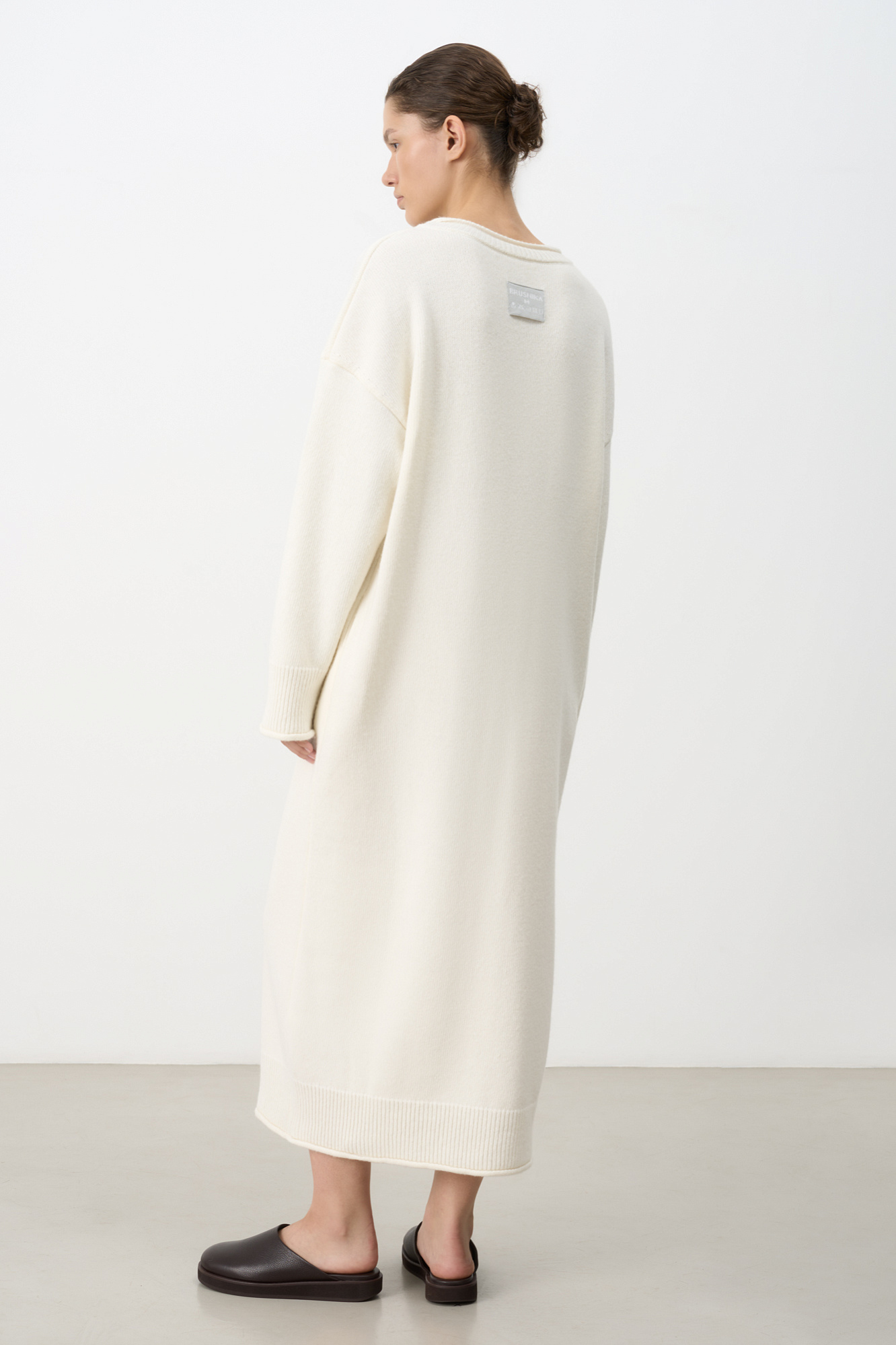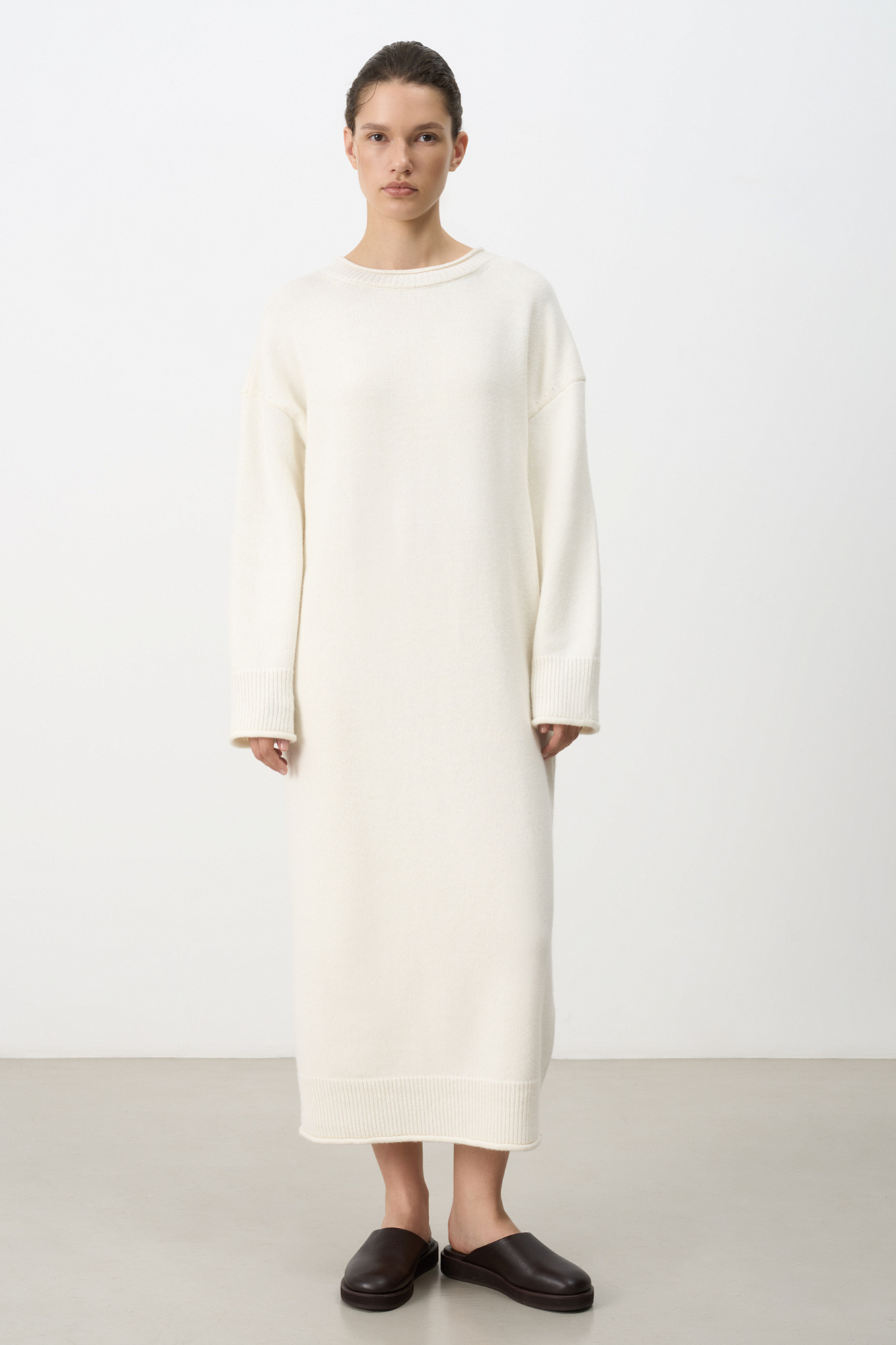 Трикотажное платье длины макси из смесовой шерсти с добавлением кашемира. Модель свободного силуэта со спущенной линией плеча и карманами. Края изделия выполнены в рубчик. Брендированный ярлык на спине.