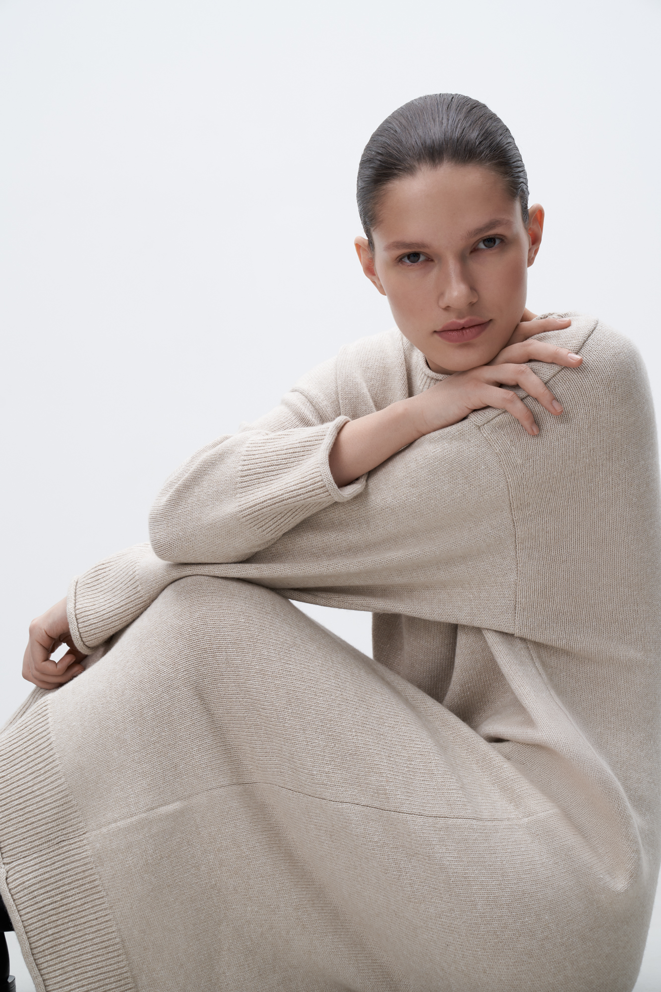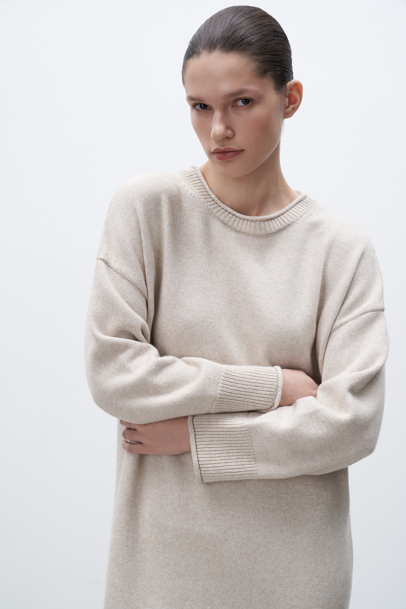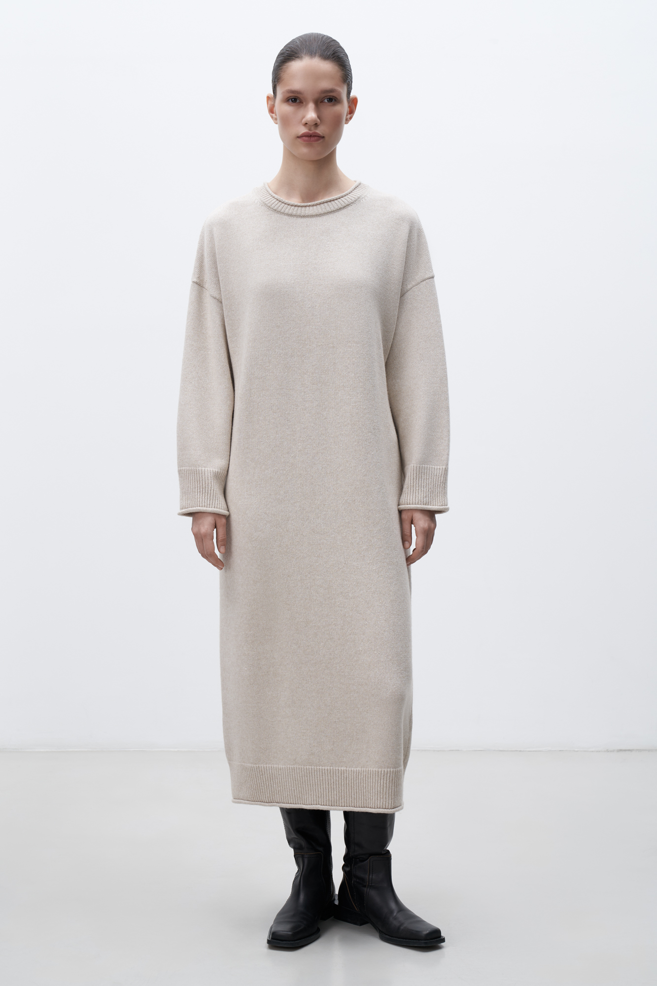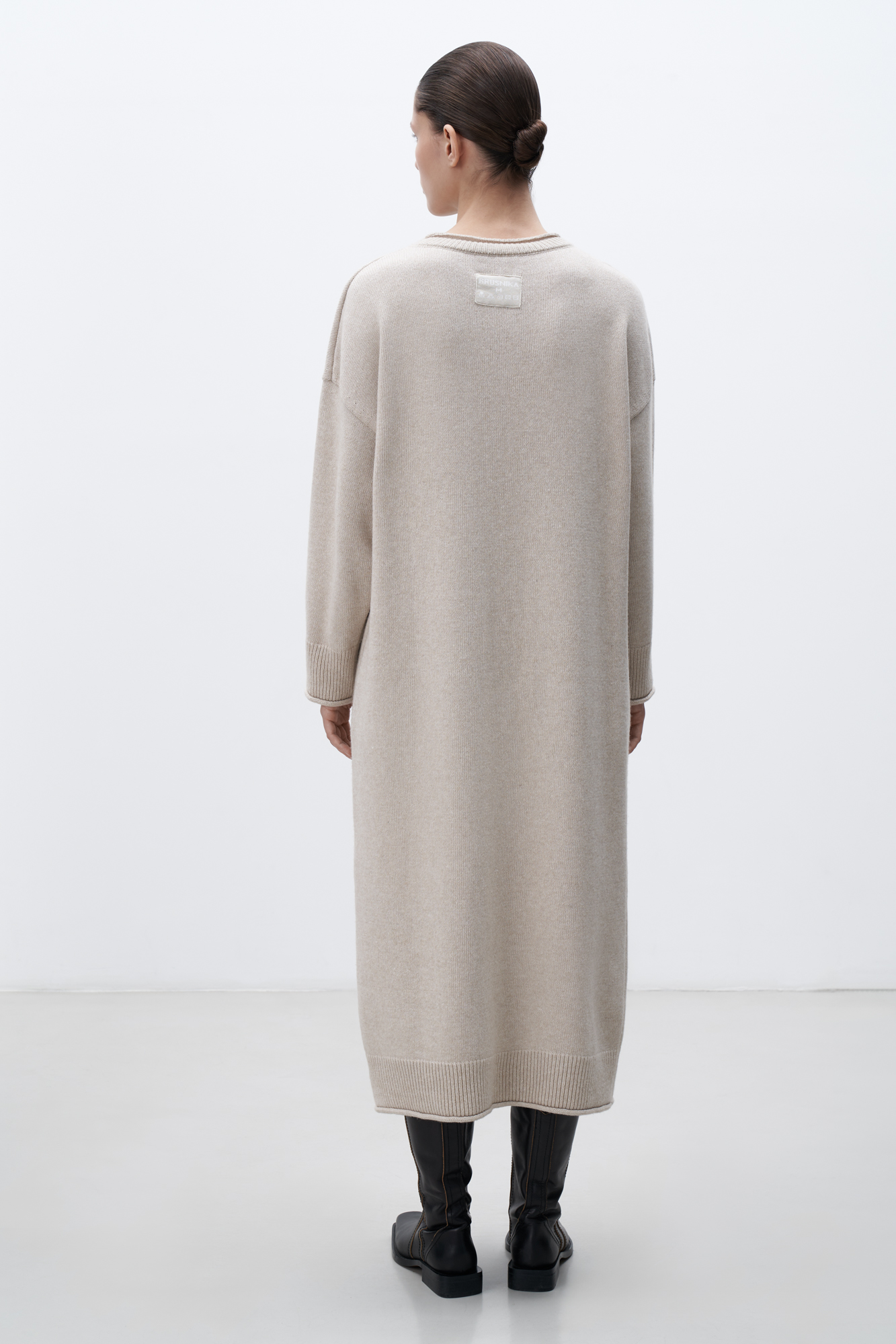 Трикотажное платье длины макси из смесовой шерсти с добавлением кашемира. Модель свободного силуэта со спущенной линией плеча и карманами. Края изделия выполнены в рубчик. Брендированный ярлык на спине.
