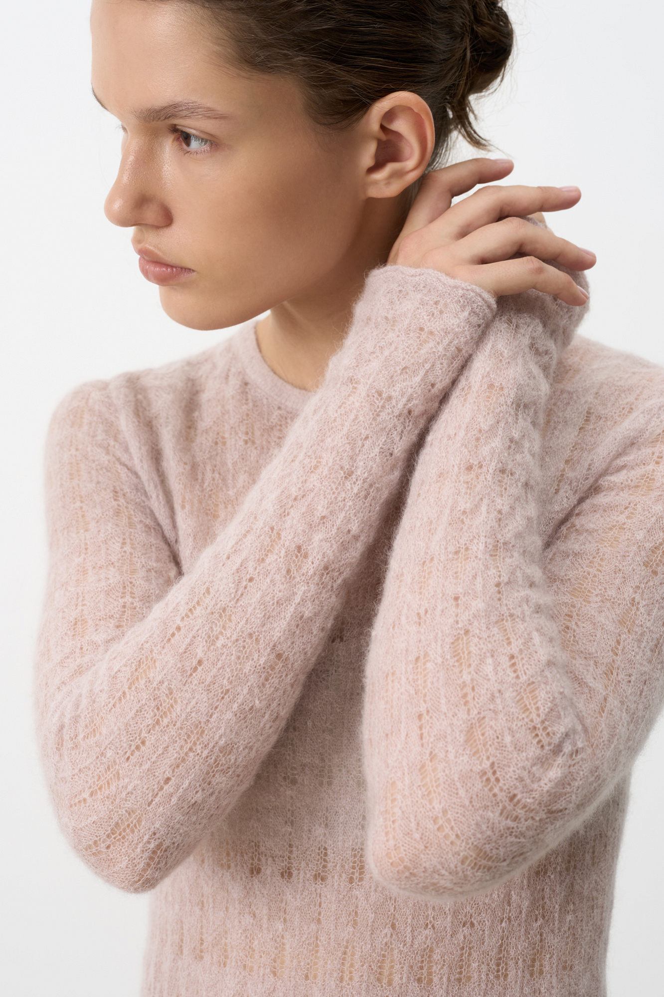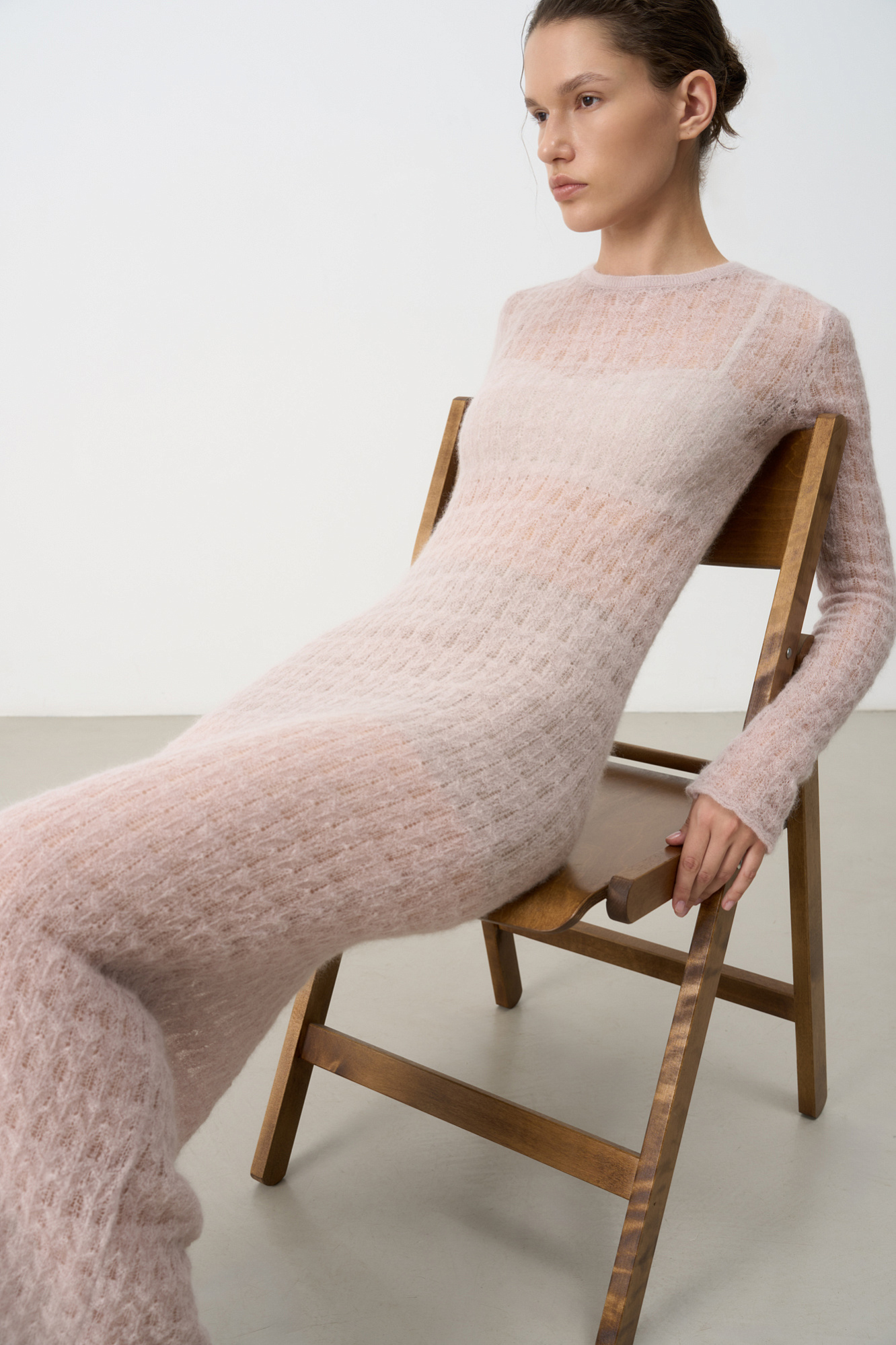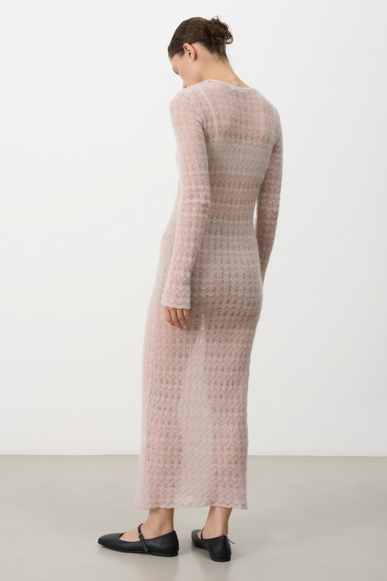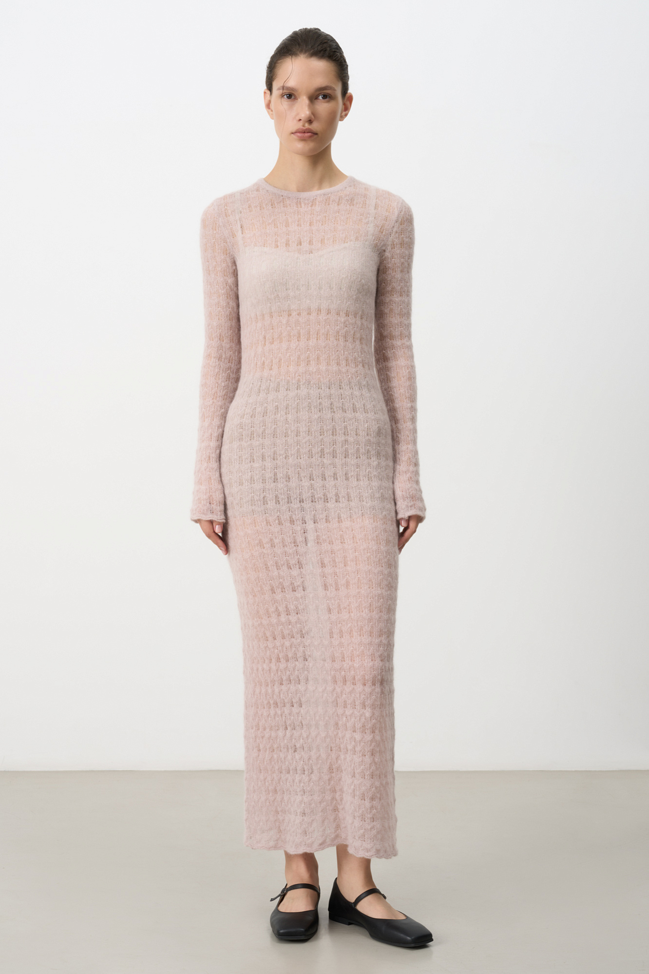 Ажурное платье длины миди из тонкой пряжи супер кид мохера и беби альпака. Модель приталенного силуэта, с длинными рукавами и круглым вырезом горловины. Платье-комбинация из вискозы в комплекте.