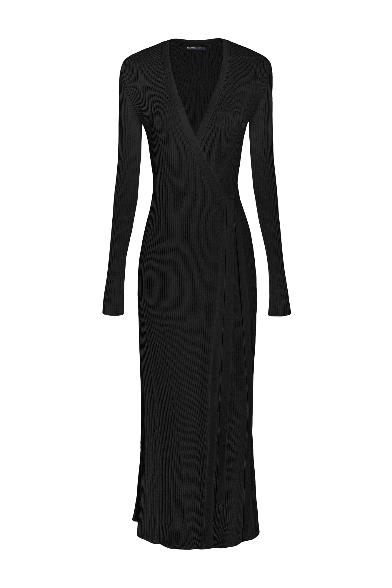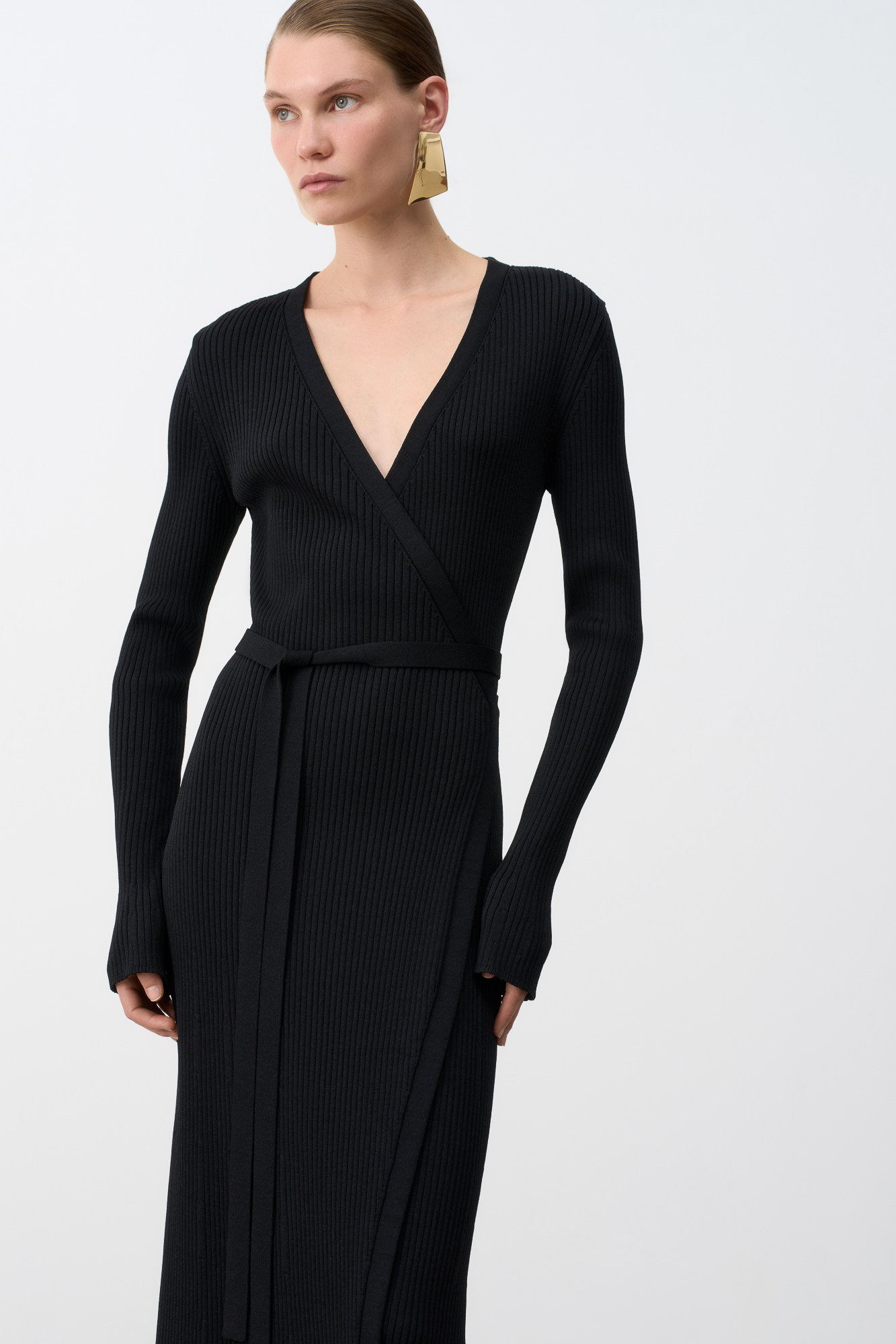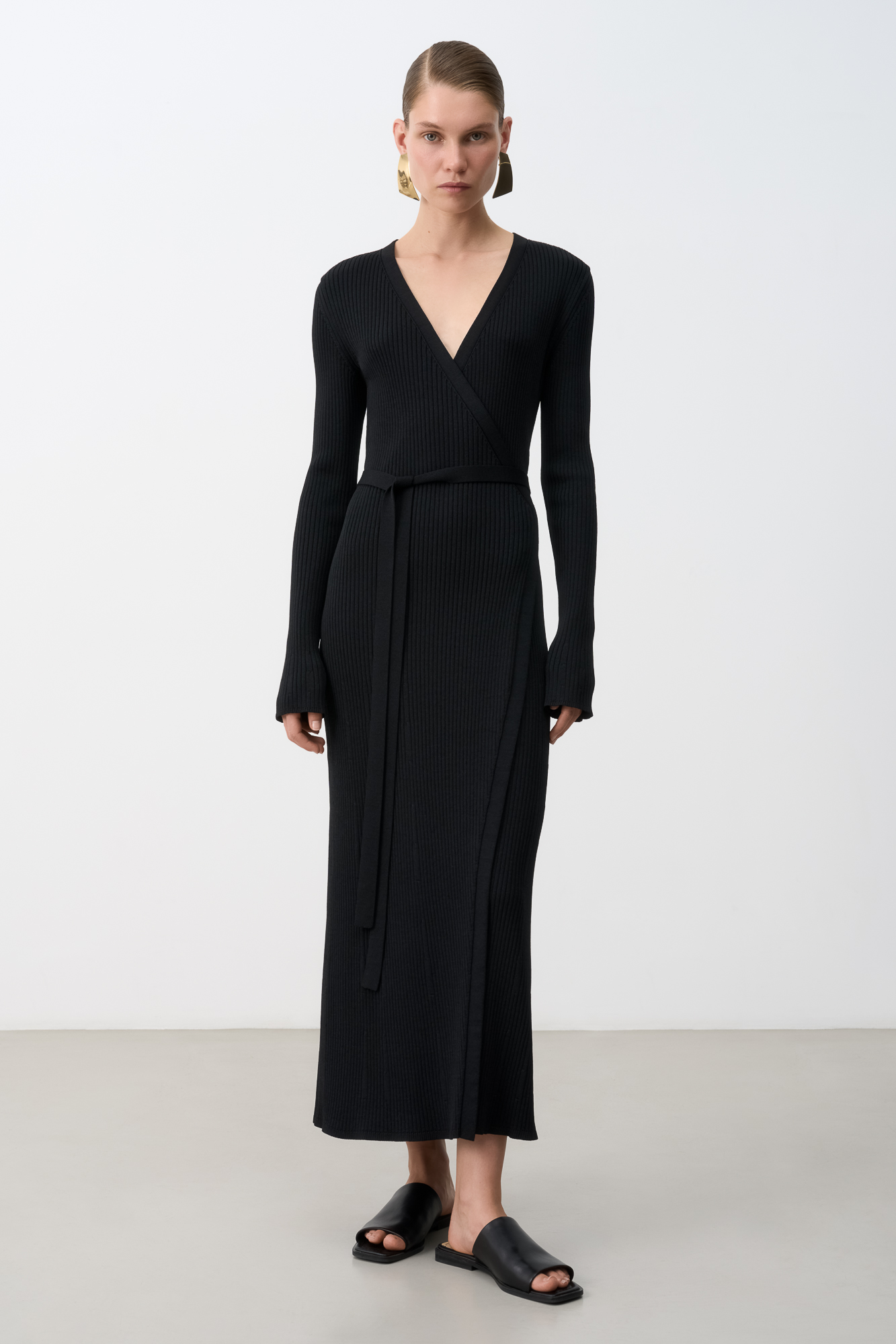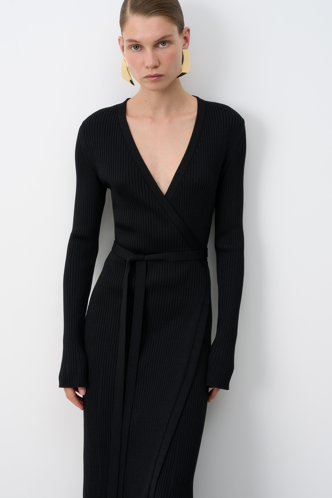 Длинное платье на запах из плотной вискозы с длинными расклешенными рукавами и поясом.