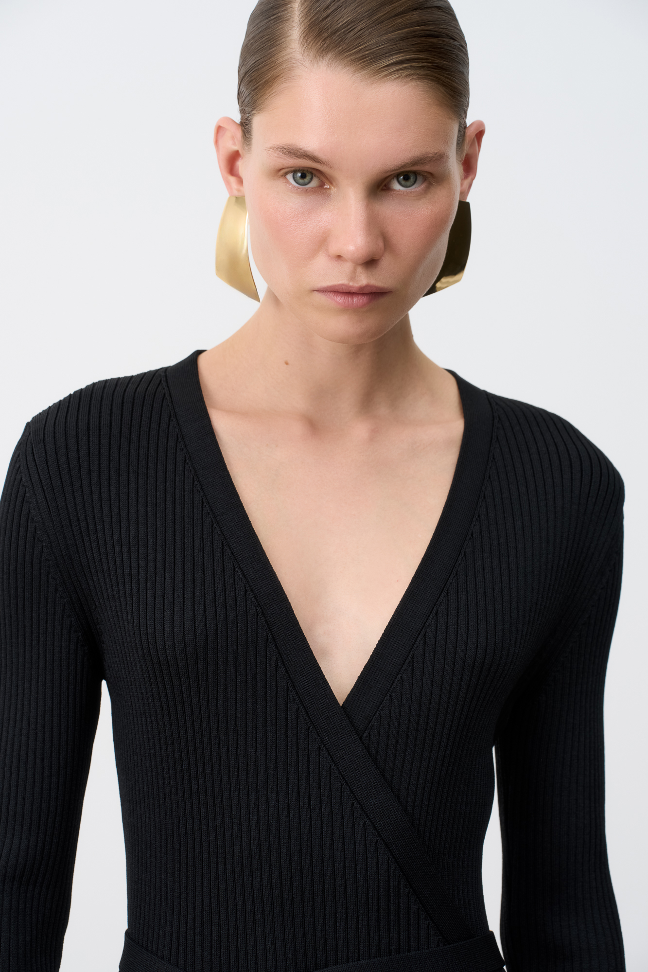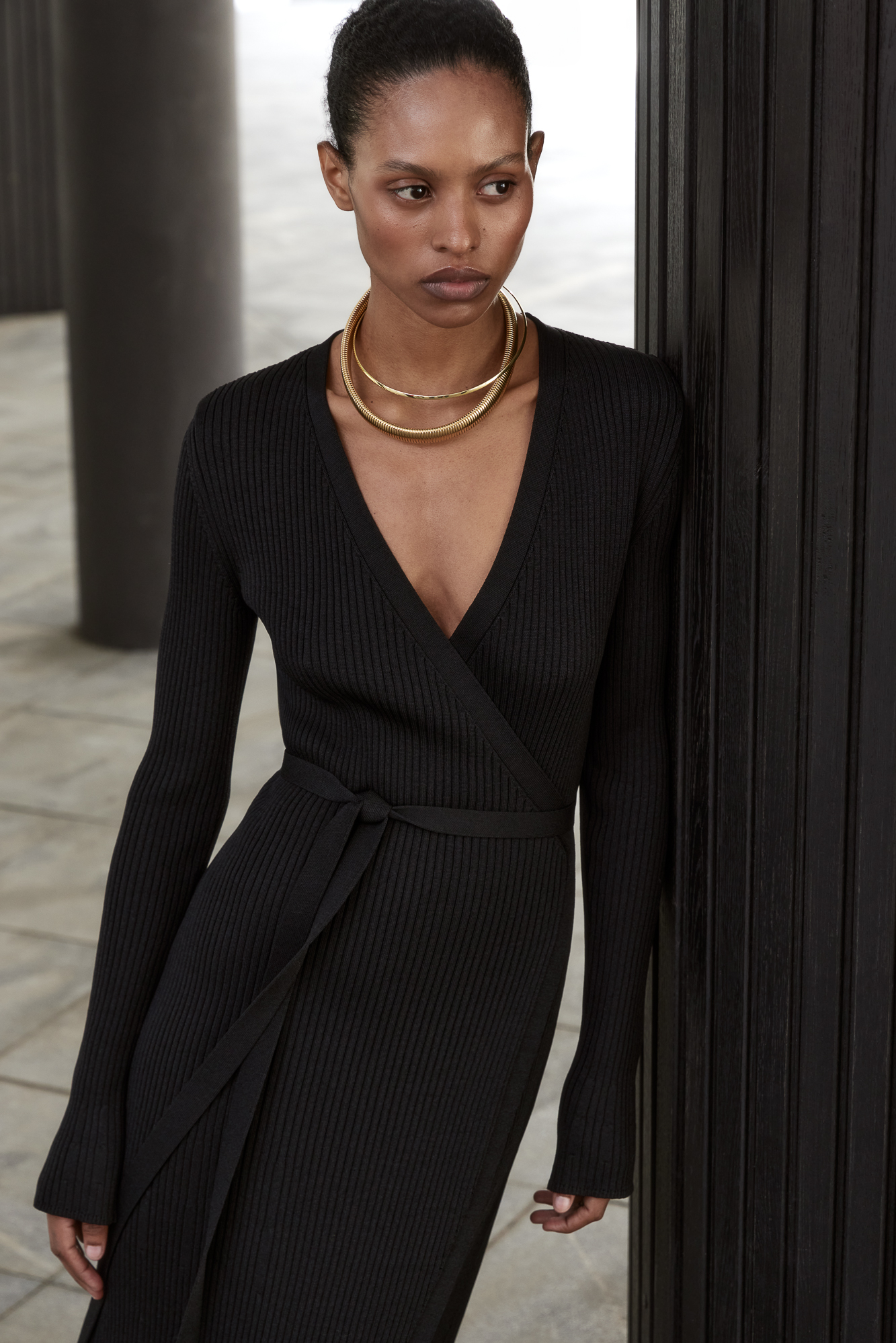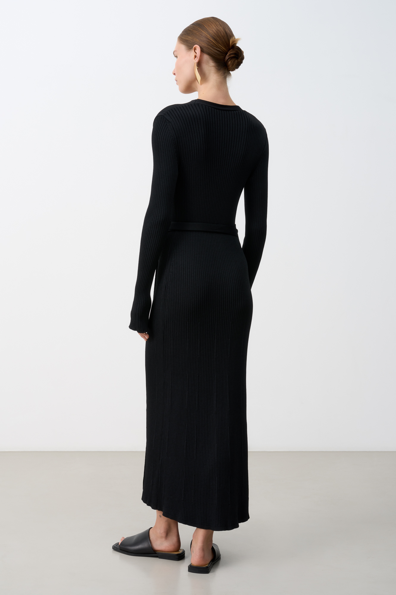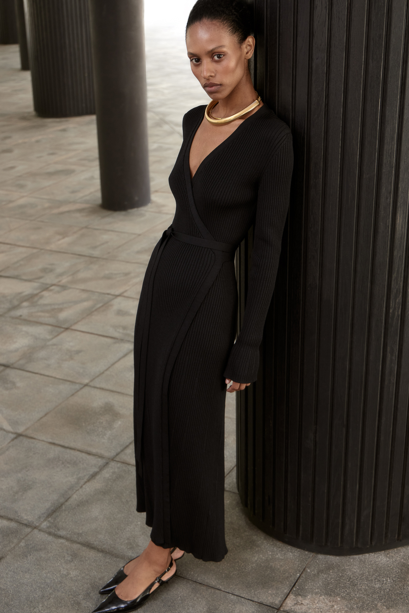 Длинное платье на запах из плотной вискозы с длинными расклешенными рукавами и поясом.