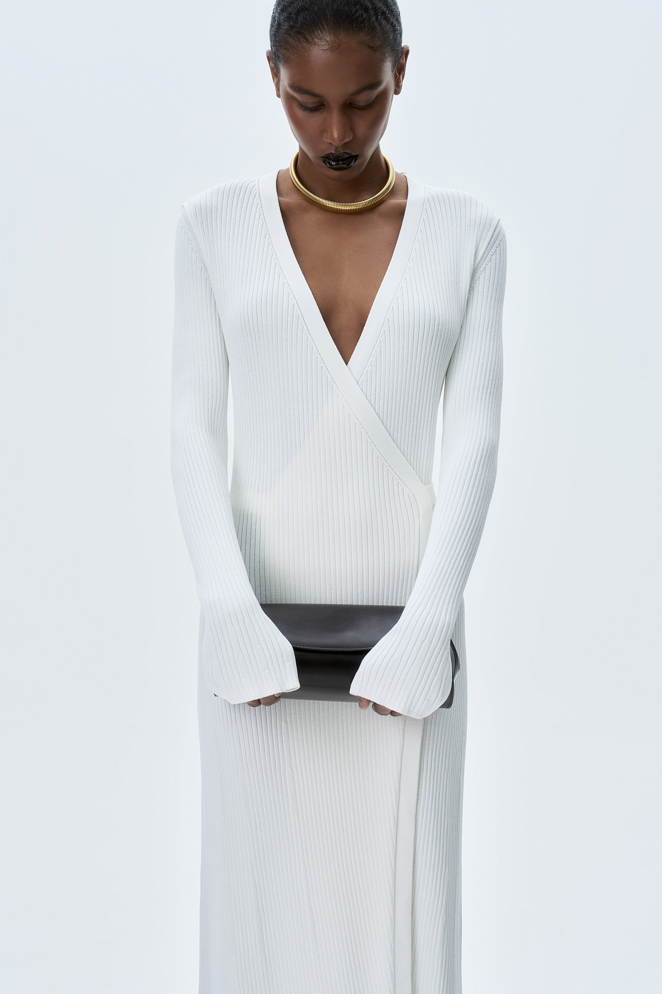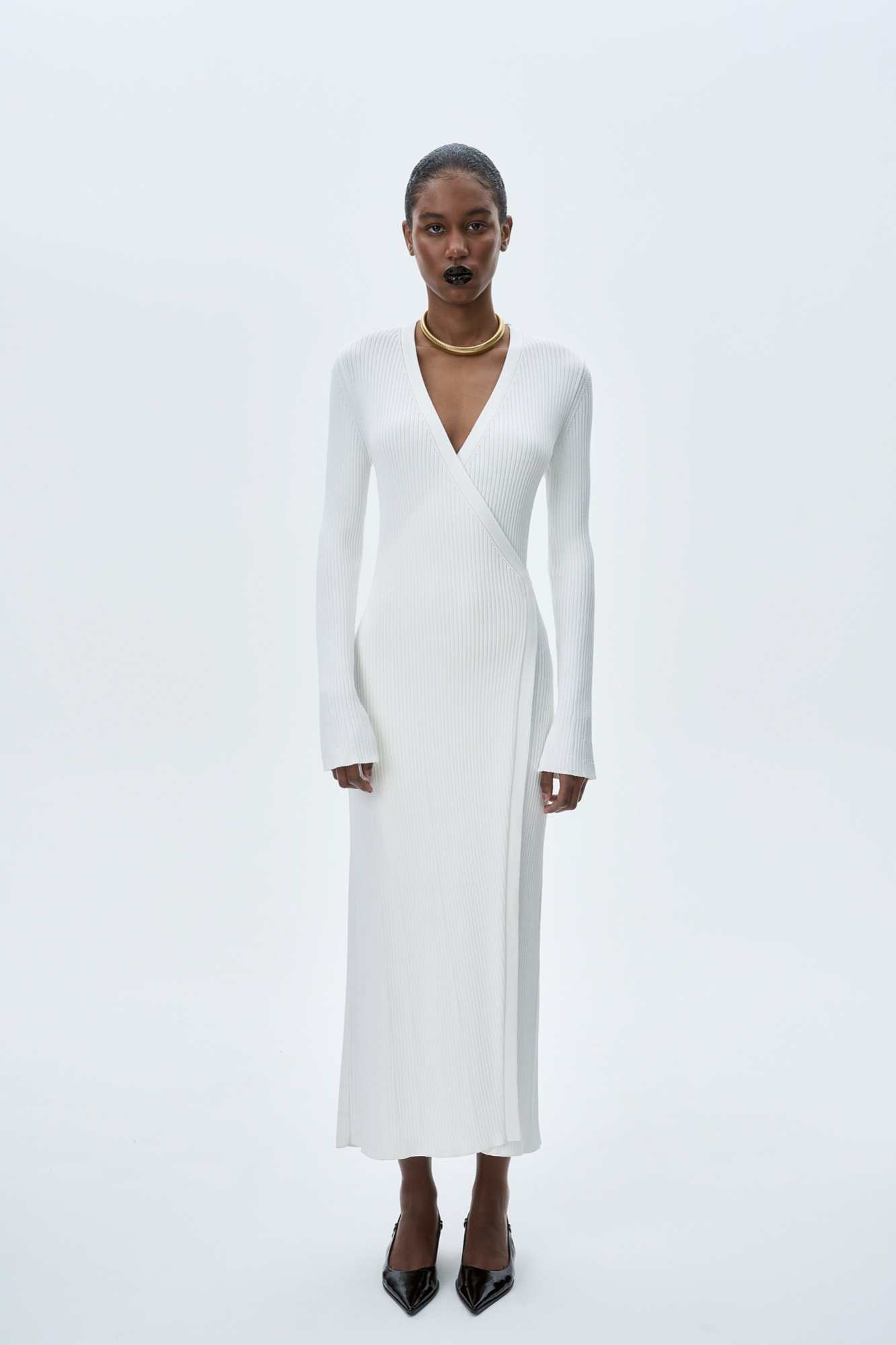 Длинное платье на запах из плотной вискозы с длинными расклешенными рукавами и поясом.