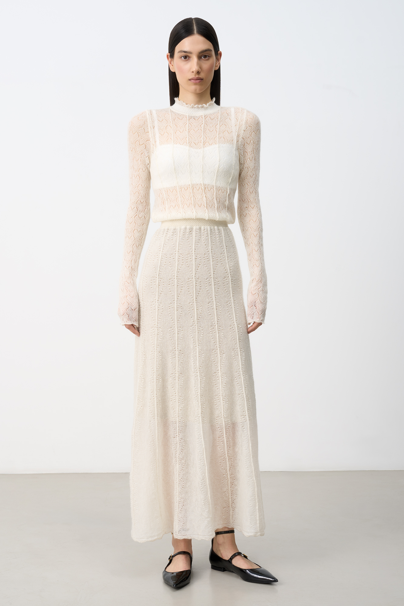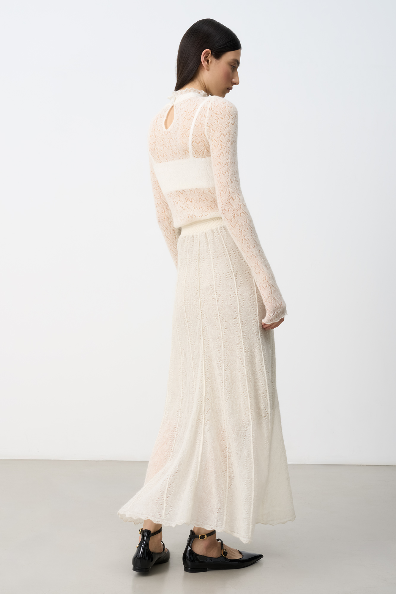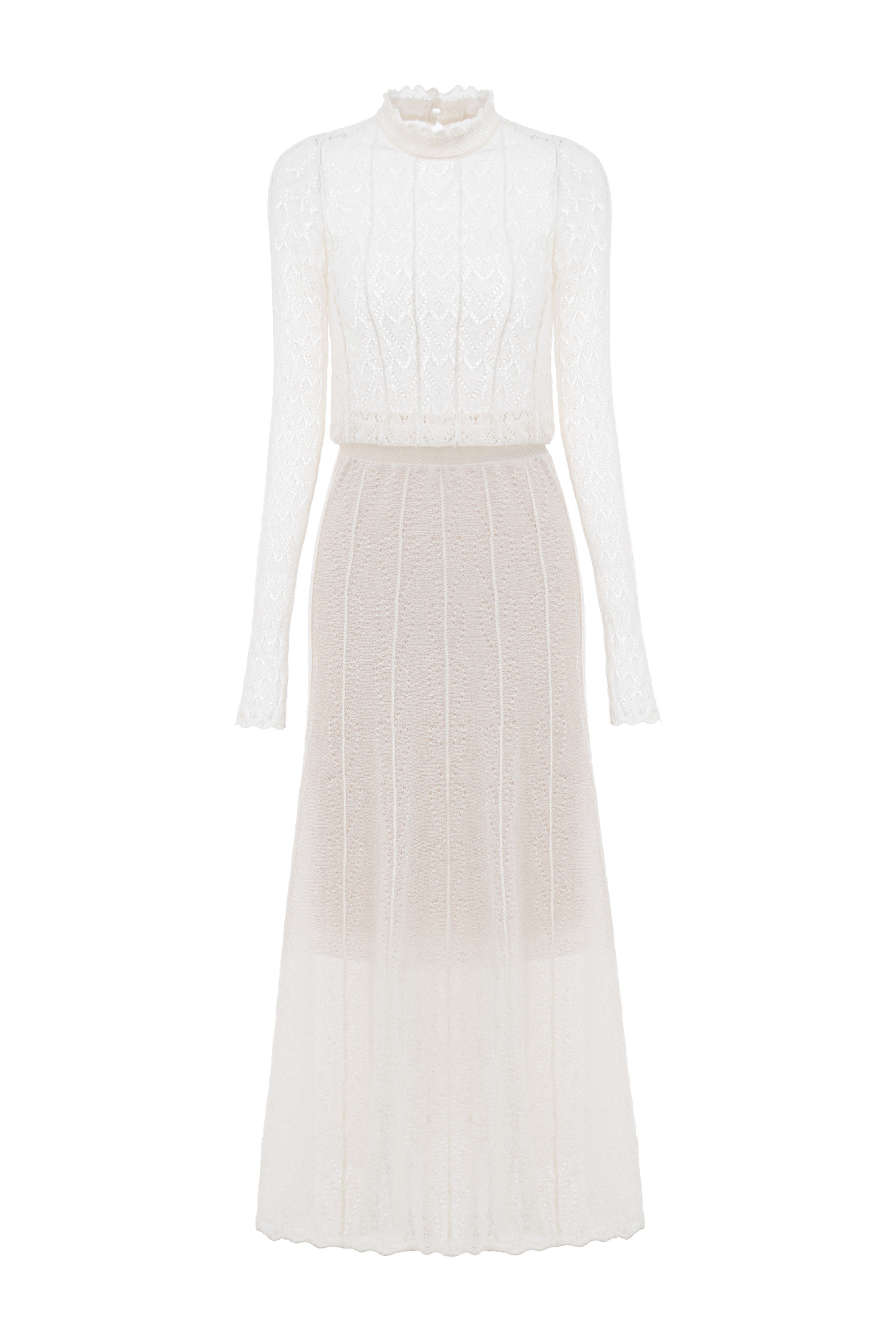 Трикотажное платье длины миди из полупрозрачного кружева с подъюбником из смесовой шерсти. Модель с длинными рукавами, невысоким воротником со сборкой и эластичным поясом. Застежка на пуговицу сзади. Платье выполнено из мягкой пряжи кид мохера и беби альпака, что позволит чувствовать себя в нем комфортно и тепло.