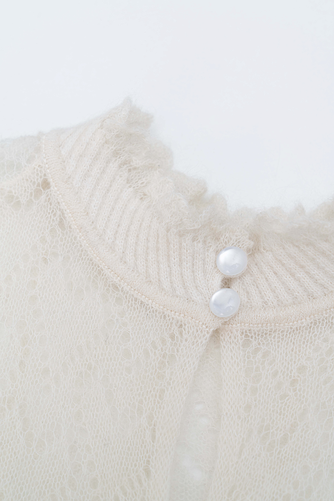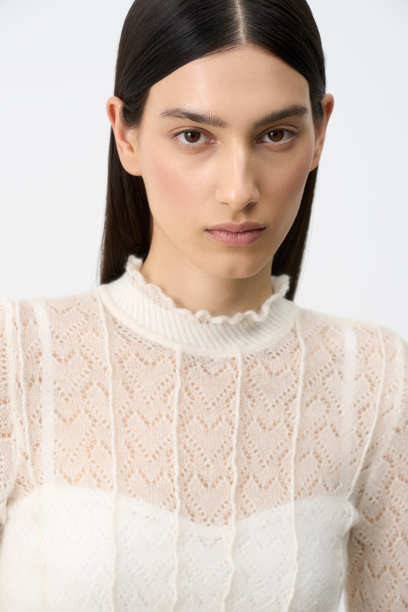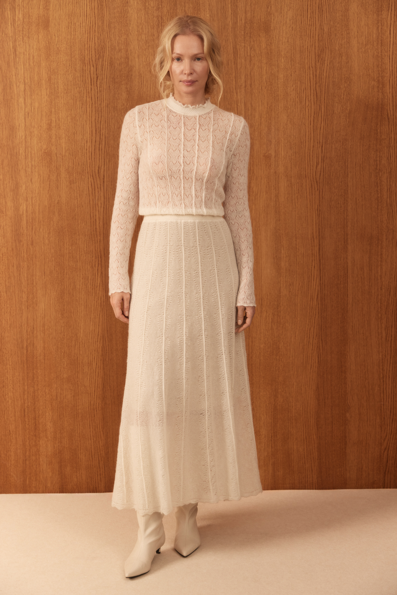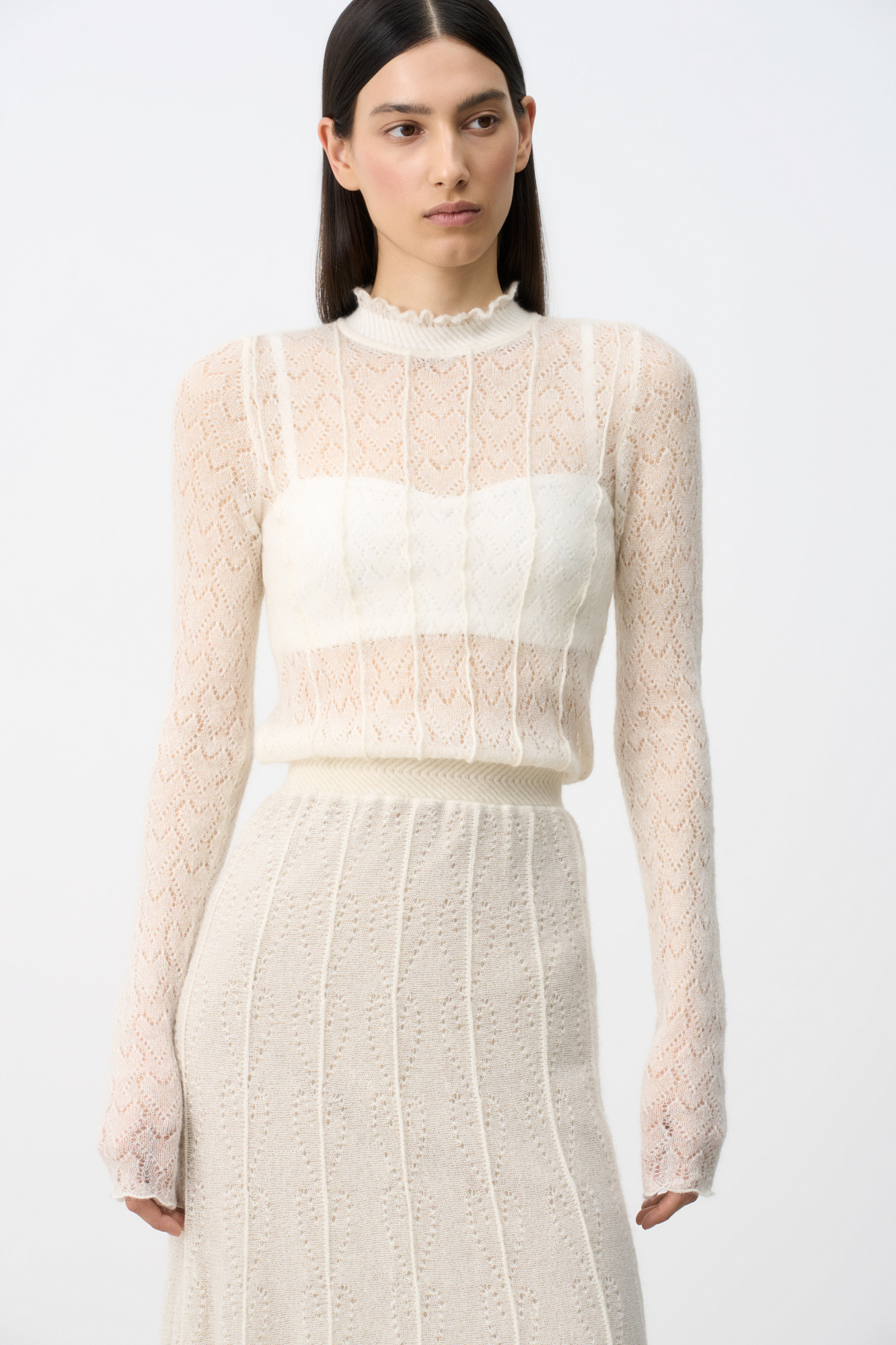 Трикотажное платье длины миди из полупрозрачного кружева с подъюбником из смесовой шерсти. Модель с длинными рукавами, невысоким воротником со сборкой и эластичным поясом. Застежка на пуговицу сзади. Платье выполнено из мягкой пряжи кид мохера и беби альпака, что позволит чувствовать себя в нем комфортно и тепло.