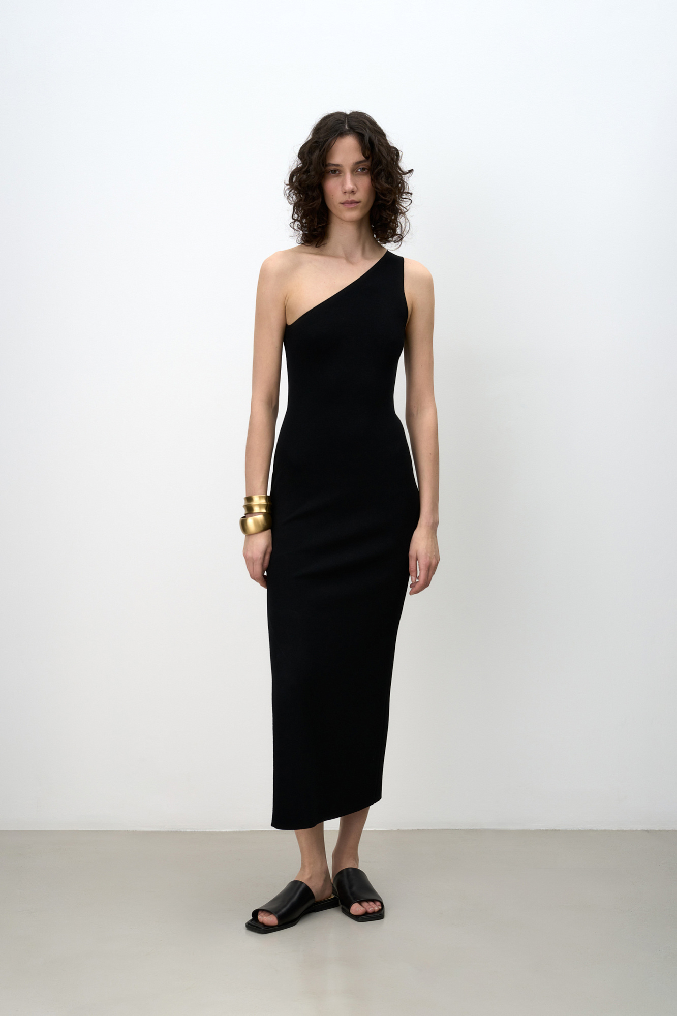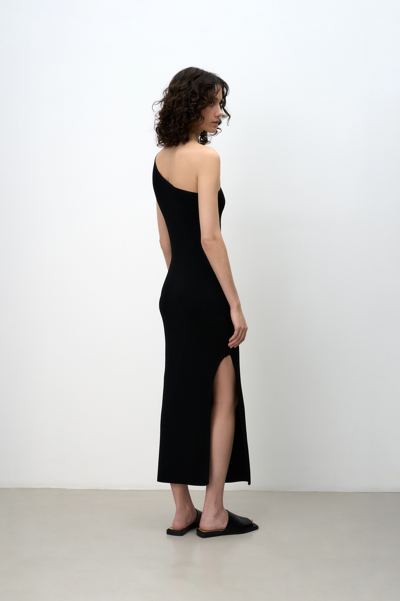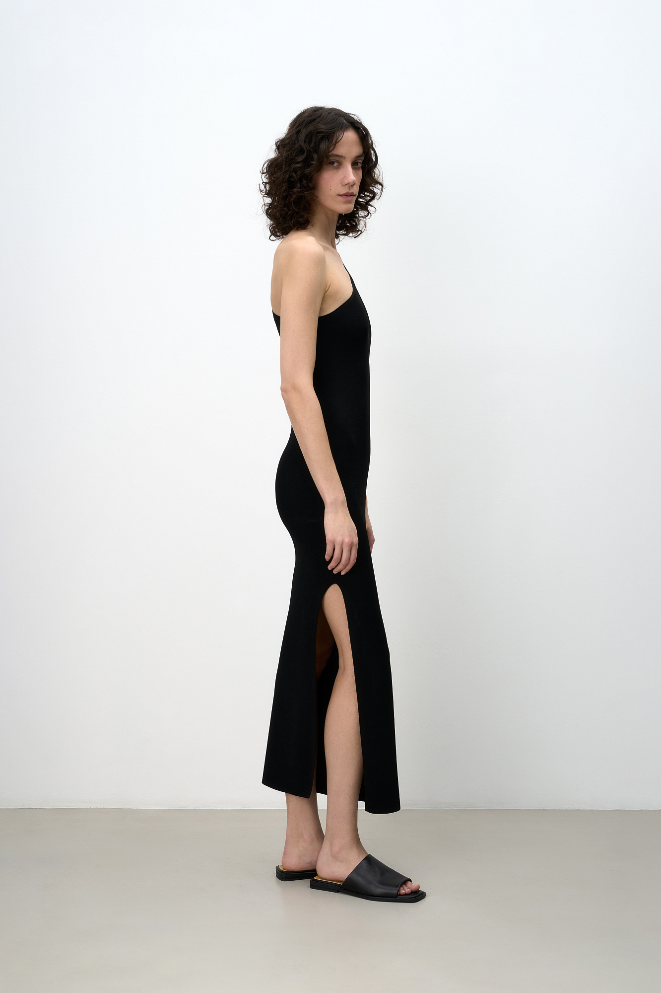 Трикотажное платье из вискозы длины миди. Модель приталенного силуэта, без рукавов, с широкой лямкой на одно плечо и разрезом сбоку.