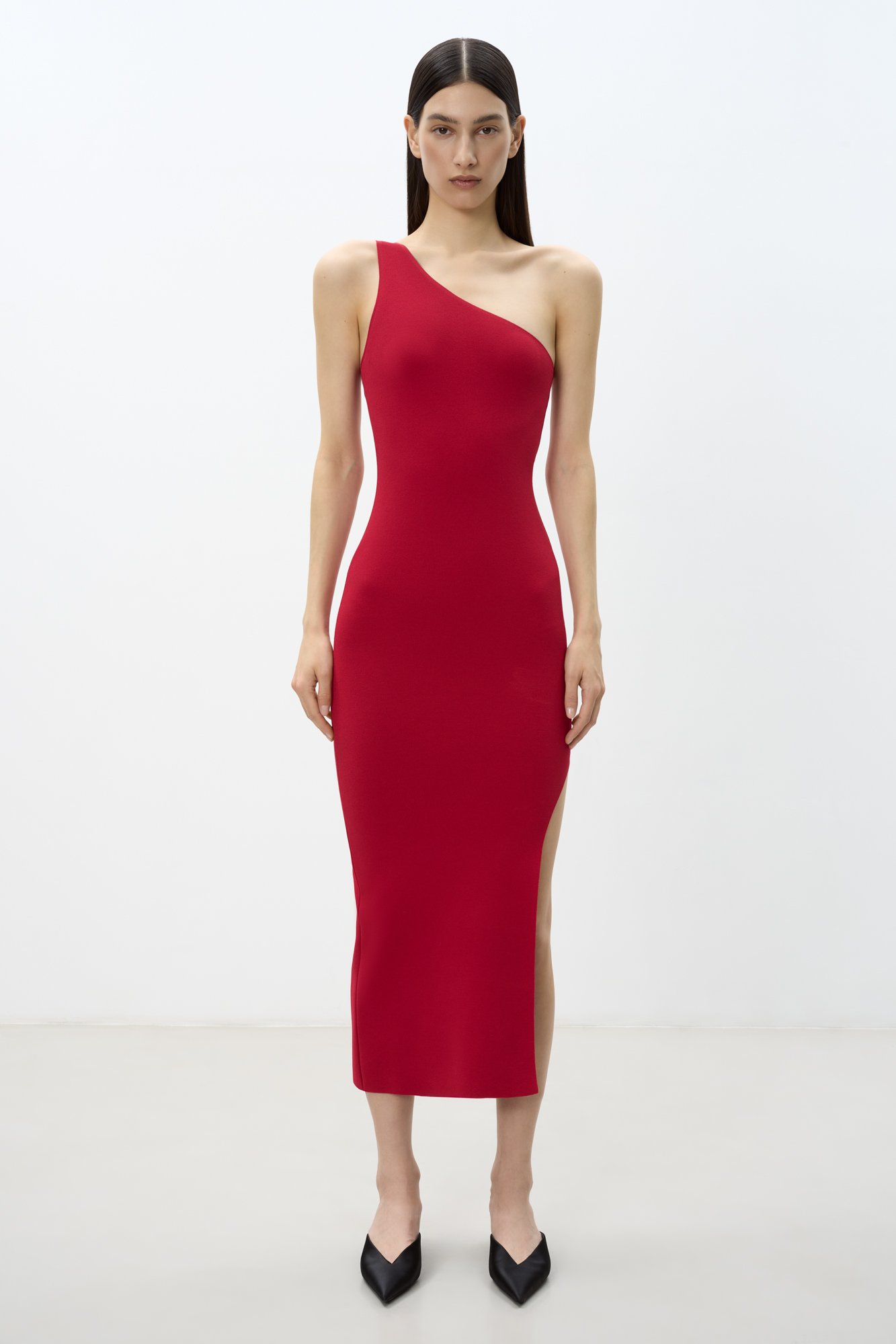 Трикотажное платье из вискозы длины миди. Модель приталенного силуэта, без рукавов, с широкой лямкой на одно плечо и разрезом сбоку.