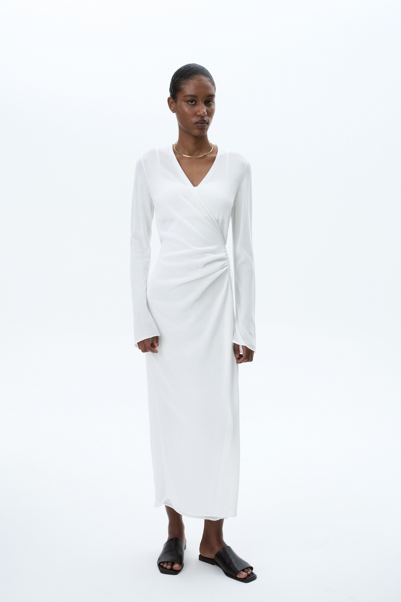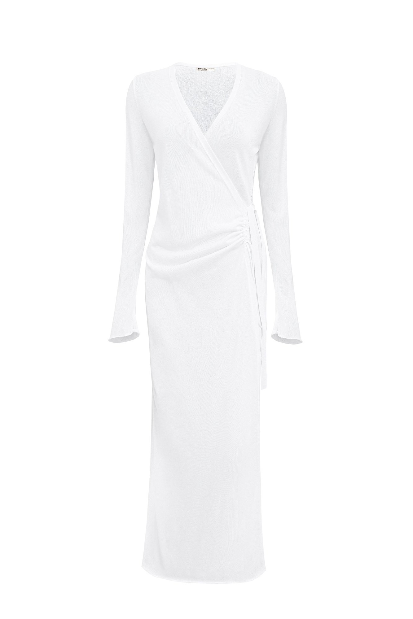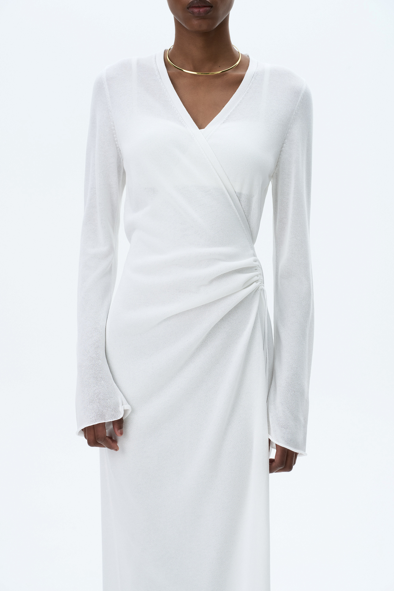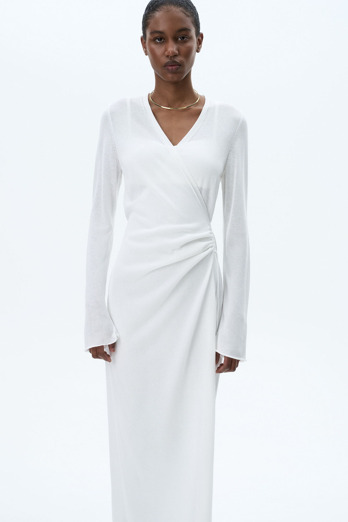 Трикотажное платье длины миди из тонкой вискозы. Модель приталенного силуэта на запах, с V-образным вырезом горловины, длинными расклешенными рукавами и кулиской на талии.