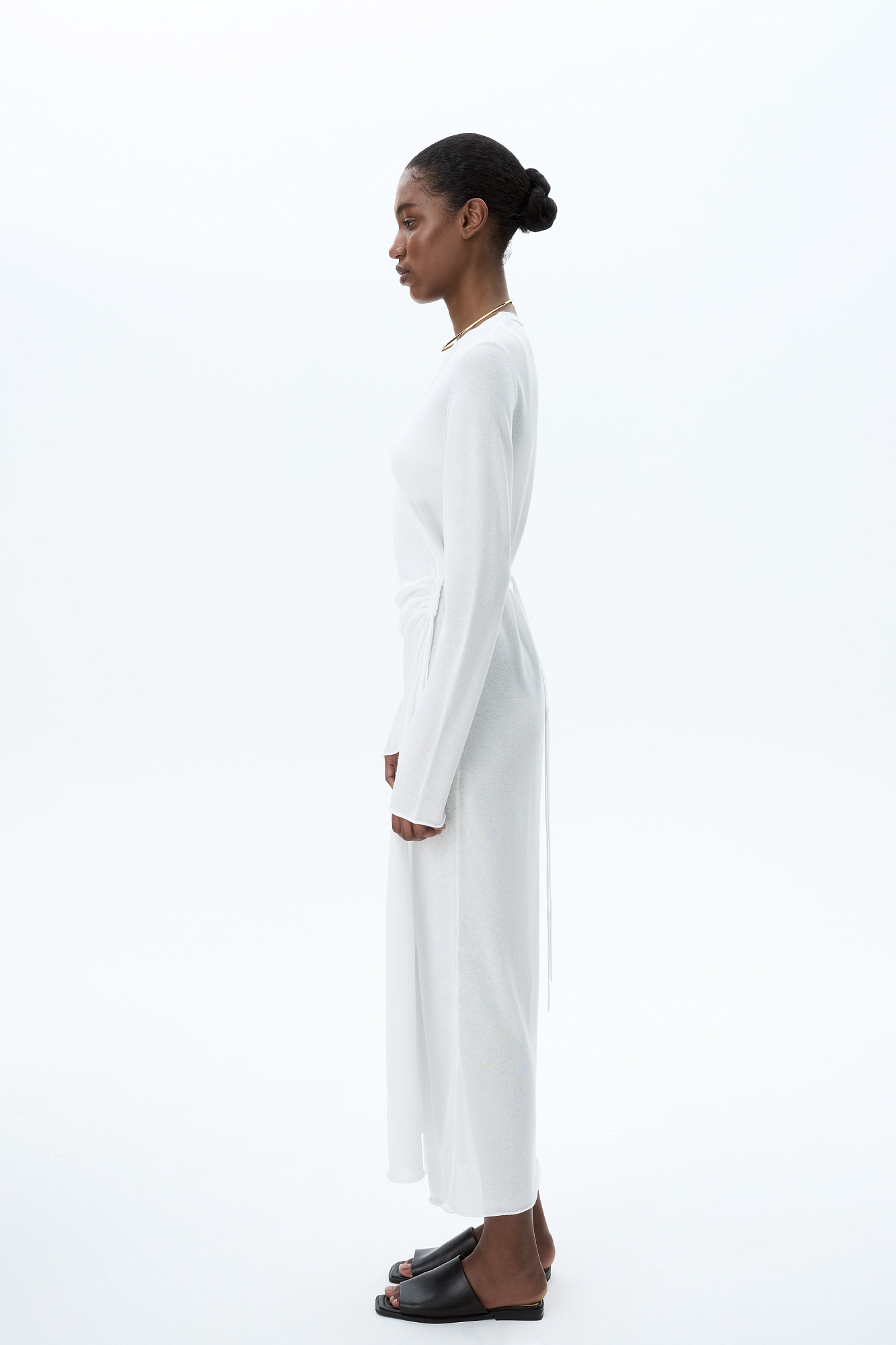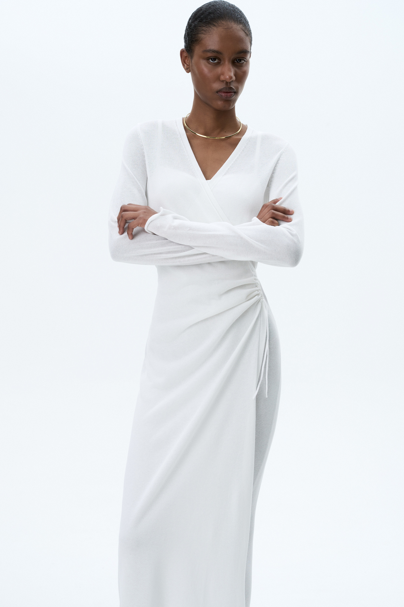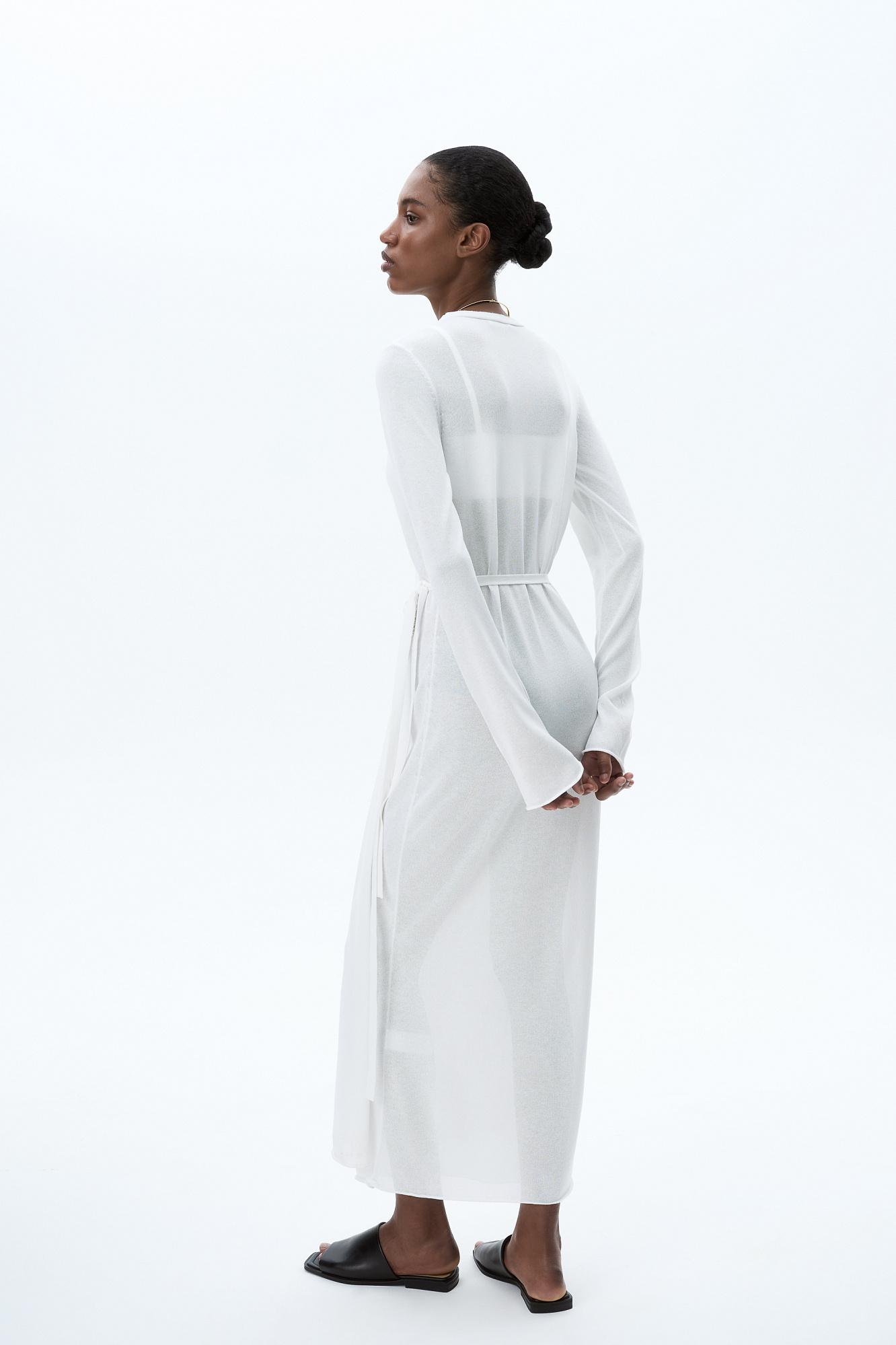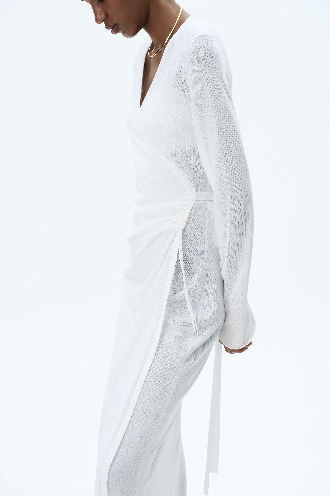 Трикотажное платье длины миди из тонкой вискозы. Модель приталенного силуэта на запах, с V-образным вырезом горловины, длинными расклешенными рукавами и кулиской на талии.