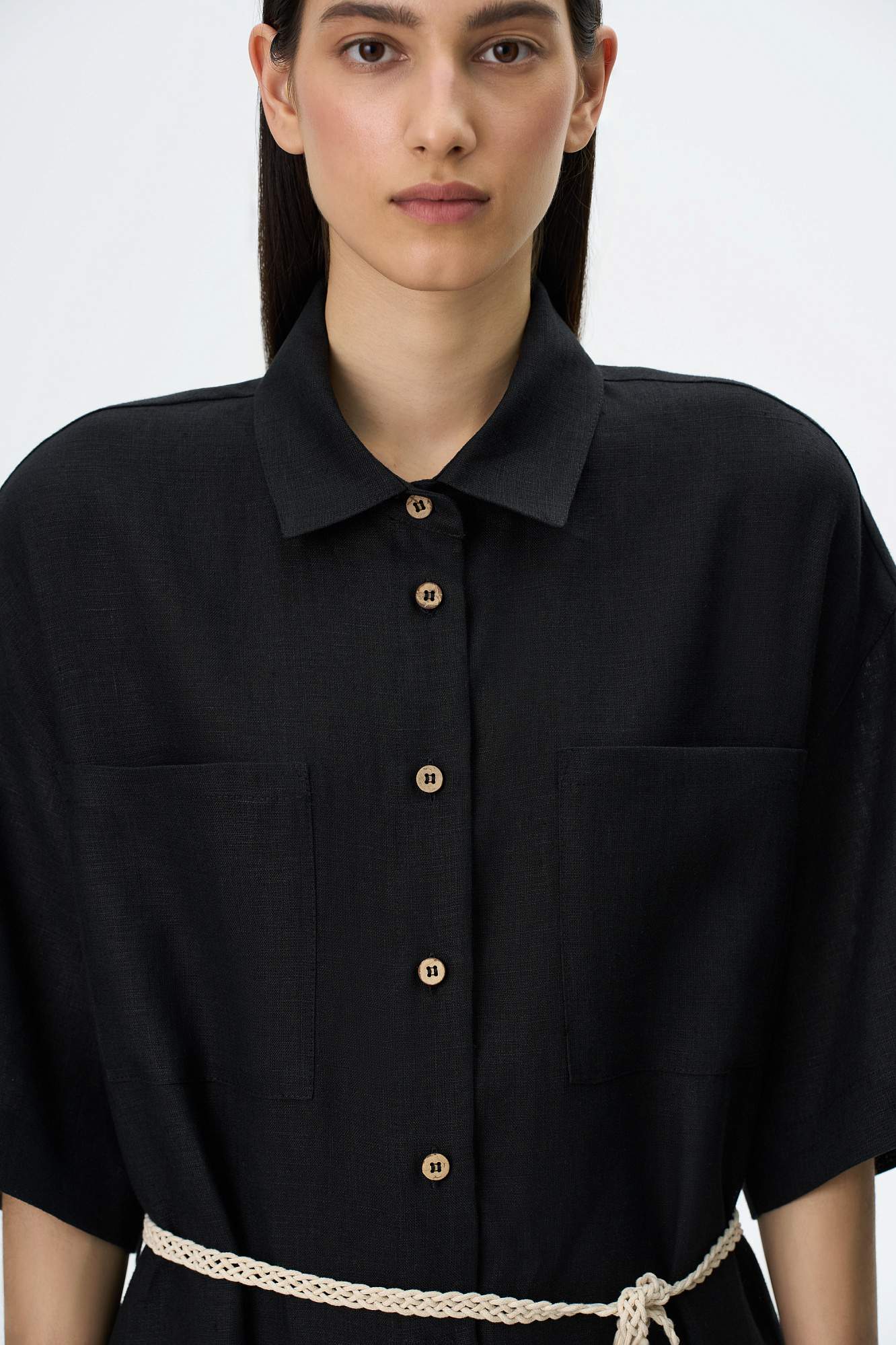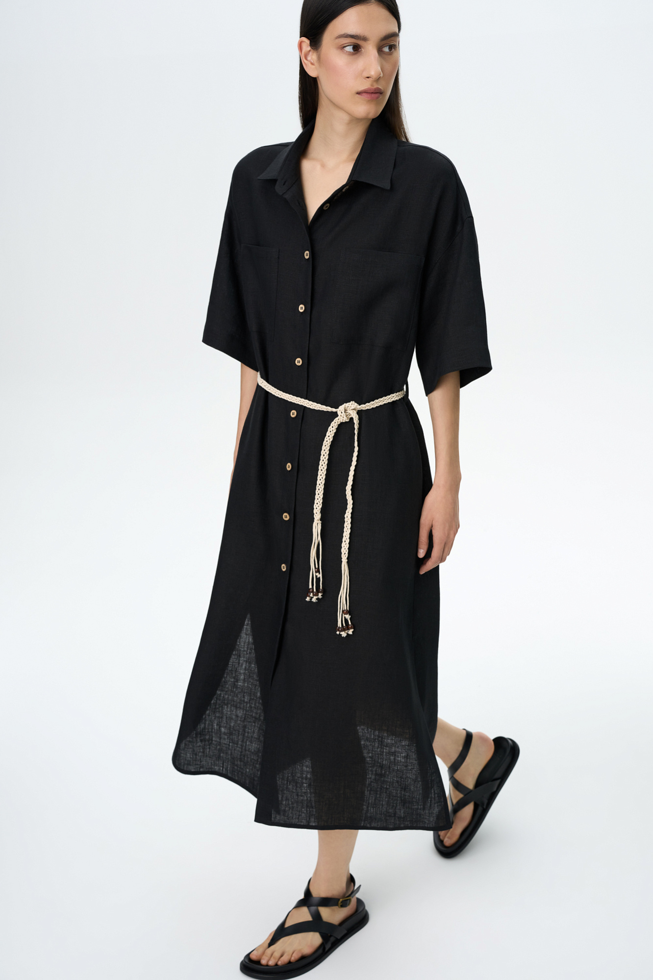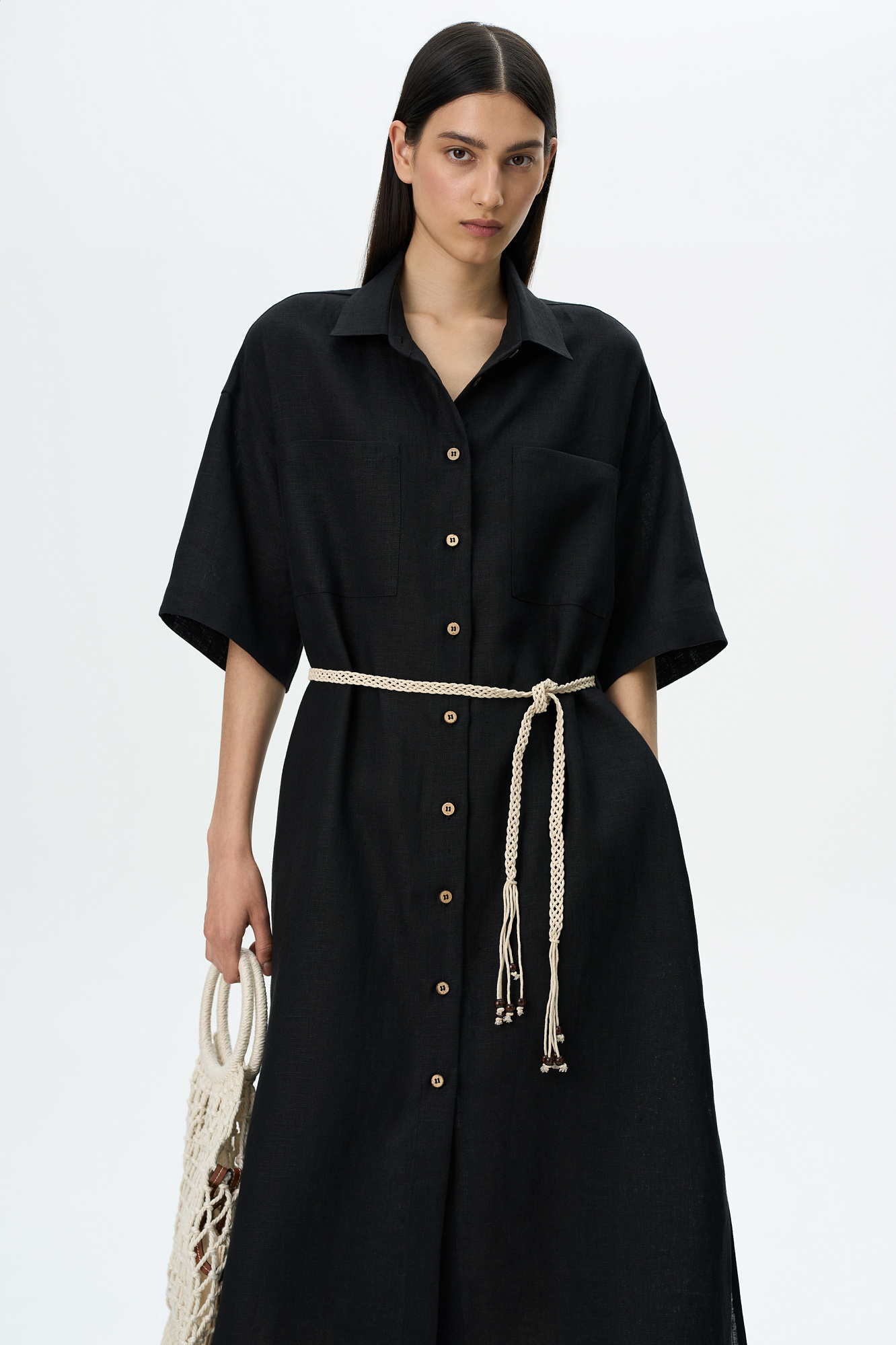 Платье-рубашка длины миди из 100% льна. Модель свободного силуэта, с коротким рукавом, спущенной линией плеча и накладными карманами на груди. Плетенный пояс в этническом стиле в комплекте.