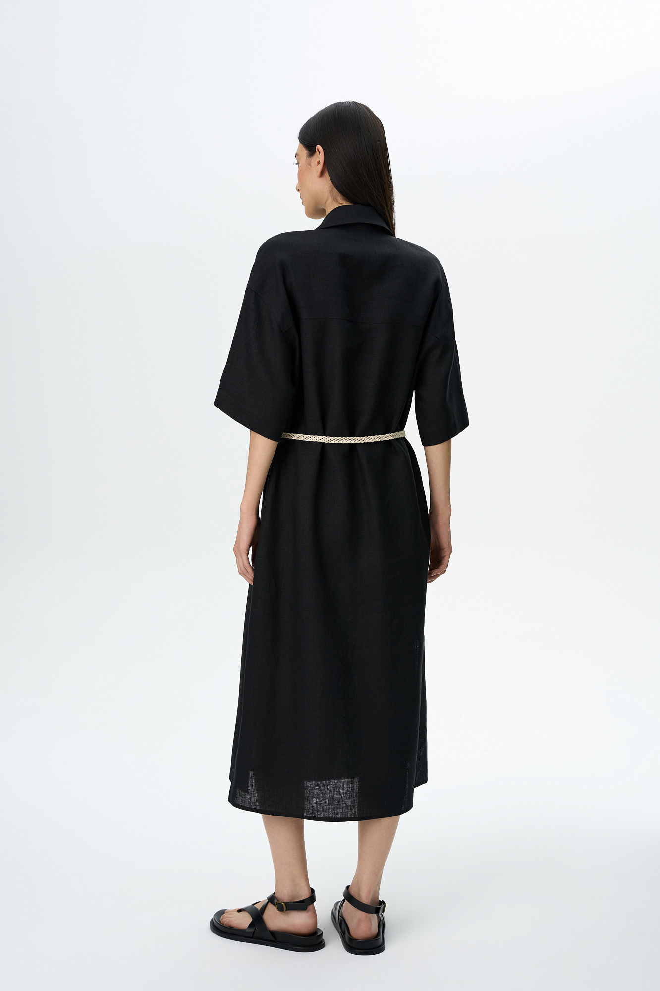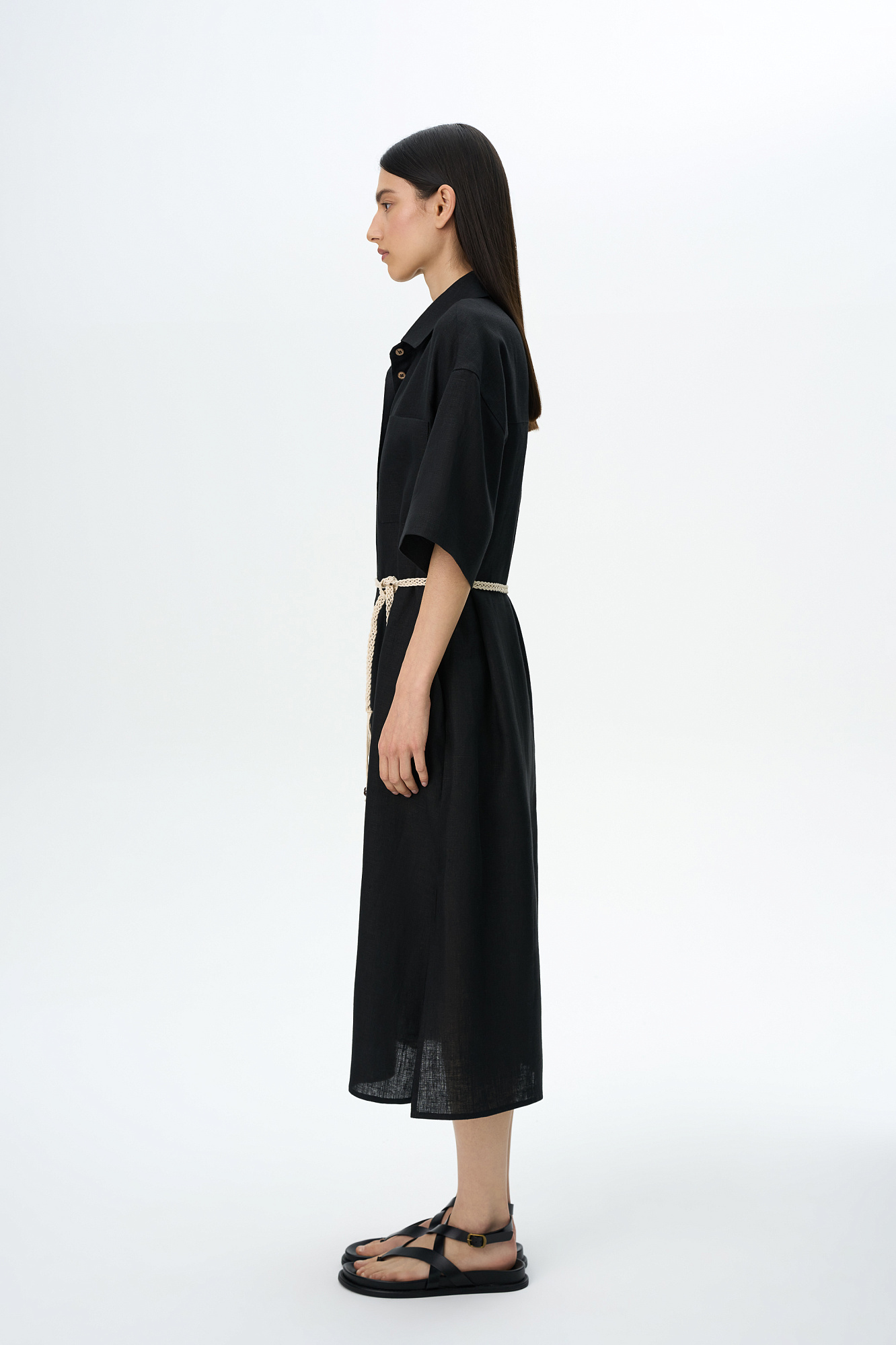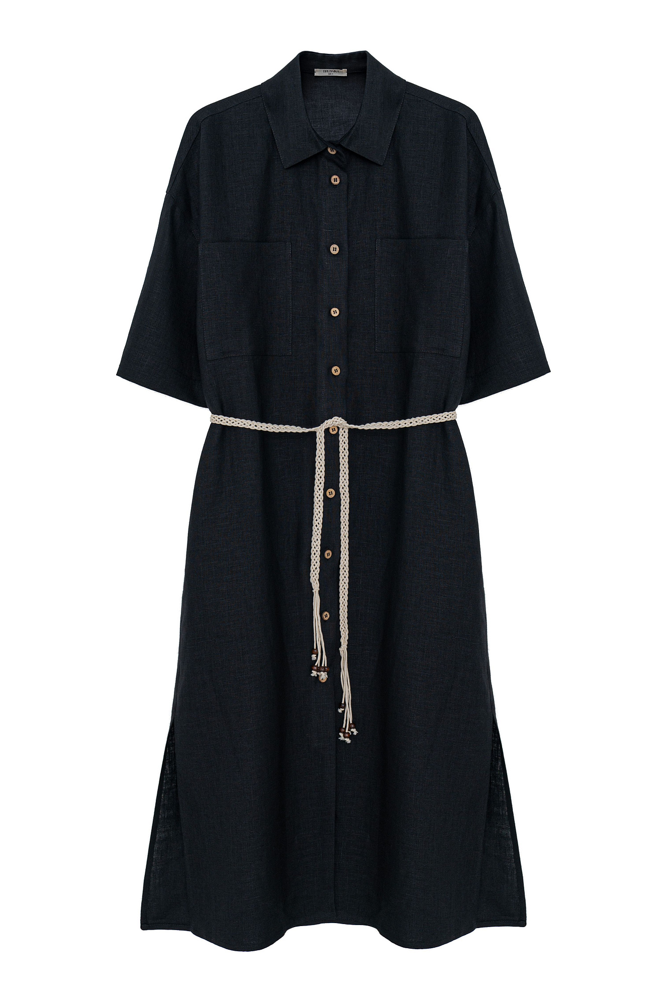Платье-рубашка длины миди из 100% льна. Модель свободного силуэта, с коротким рукавом, спущенной линией плеча и накладными карманами на груди. Плетенный пояс в этническом стиле в комплекте.