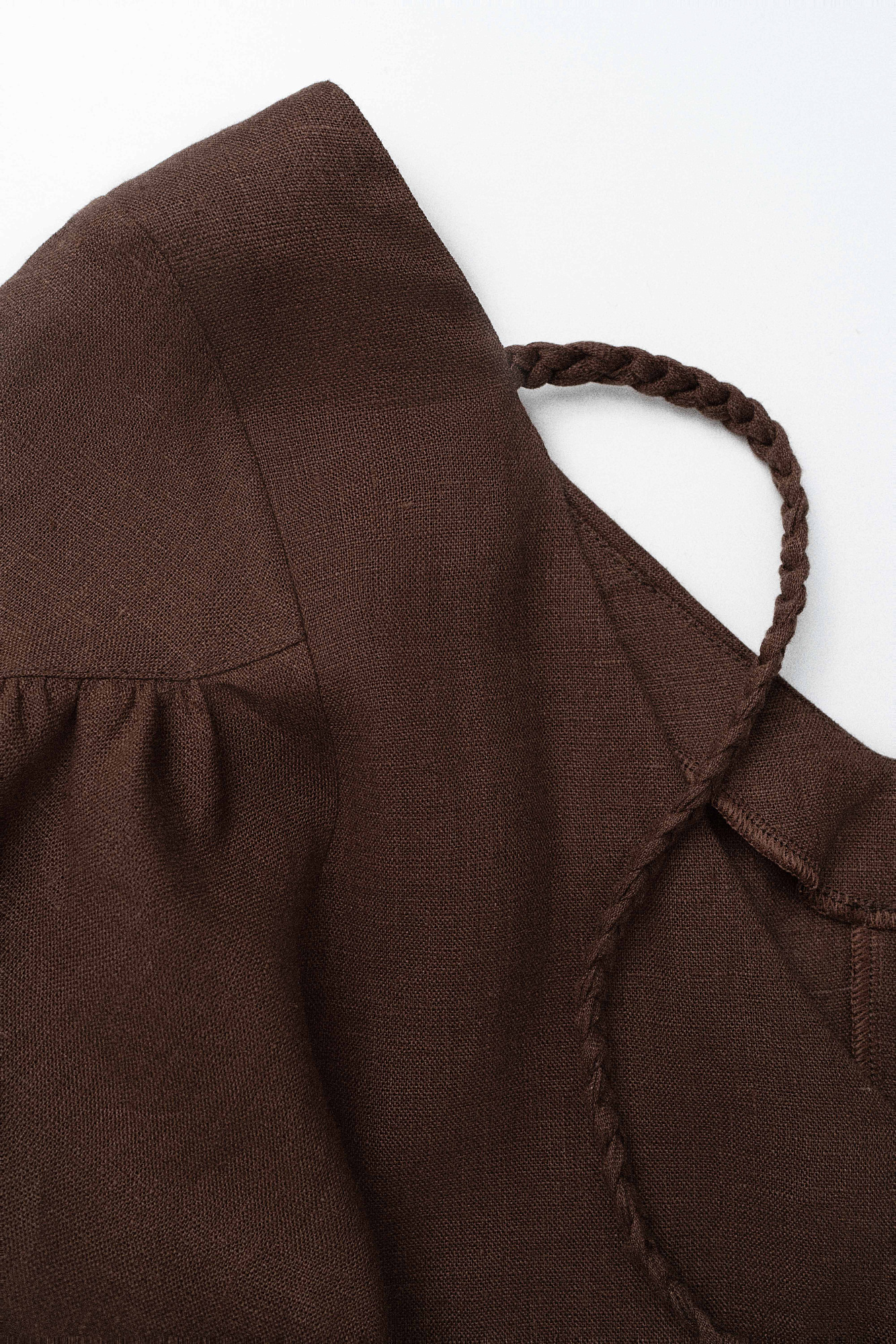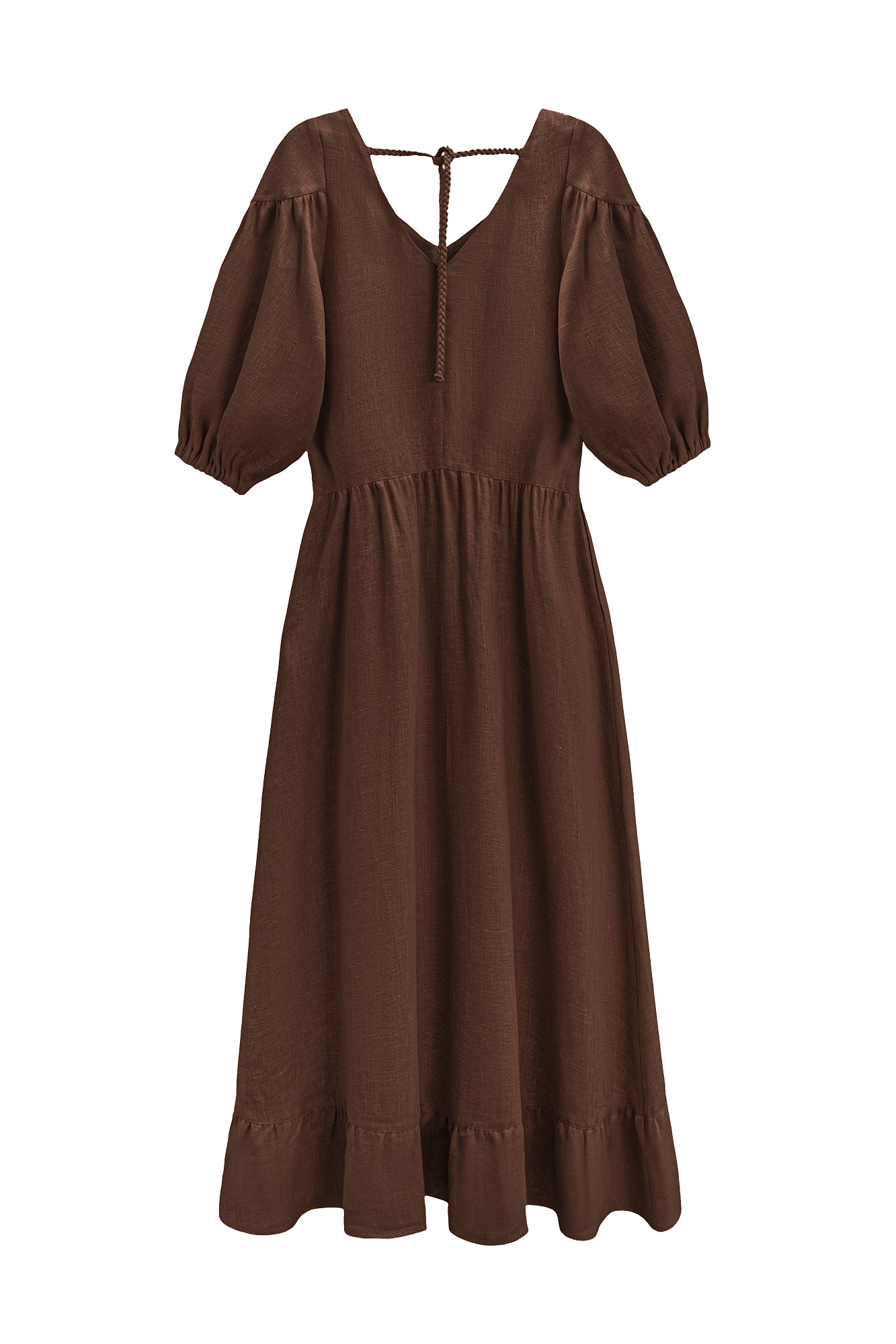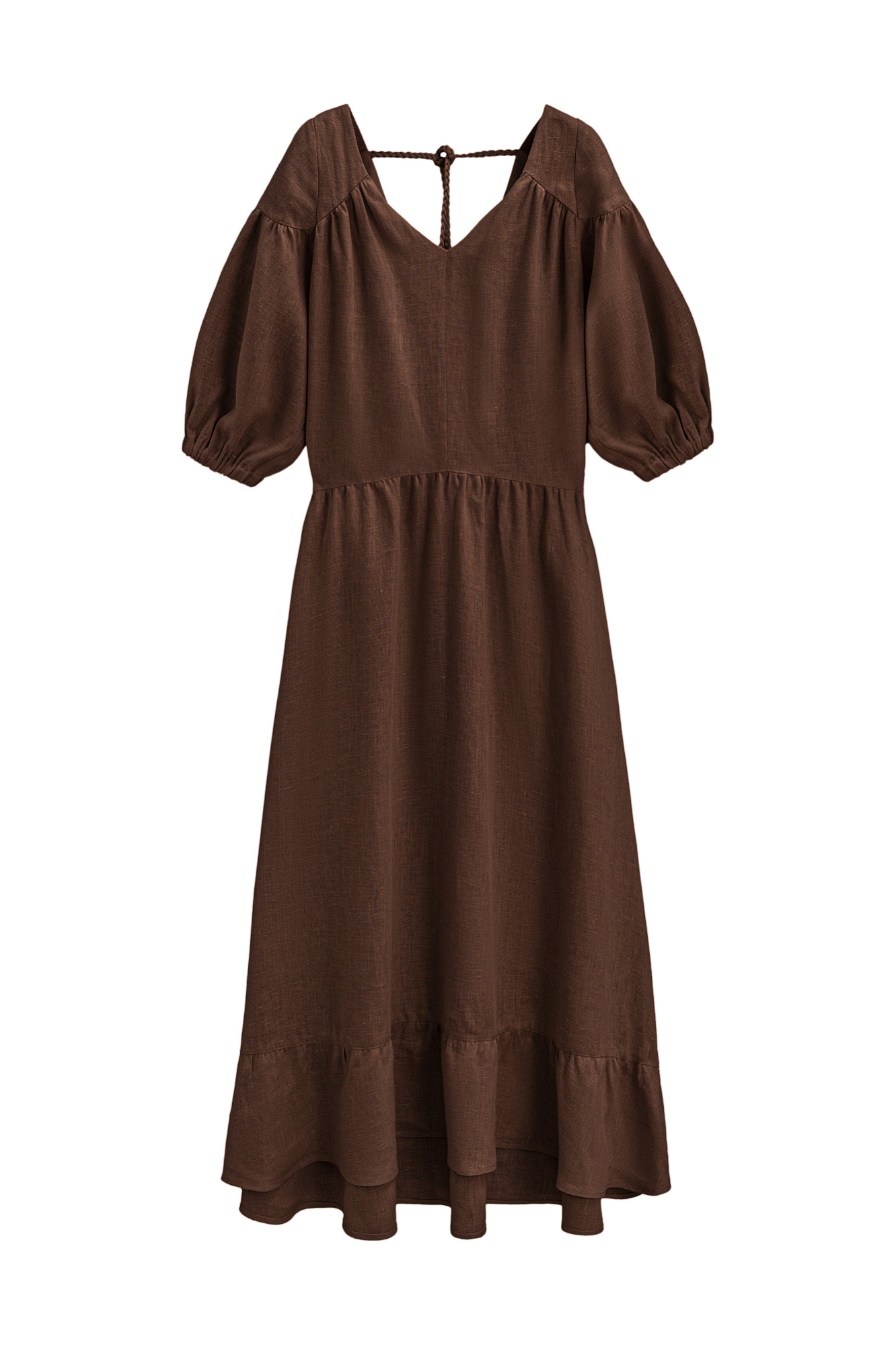 Длинное платье из 100% льна с расклешением от талии и широким асимметричным воланом внизу. Короткий рукав на резинке. V-образный вырез с завязками на спине.