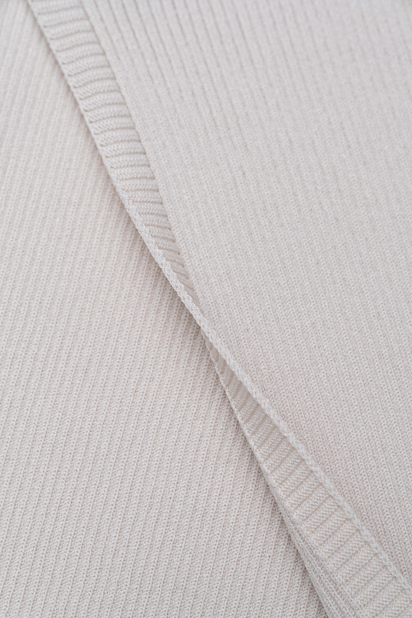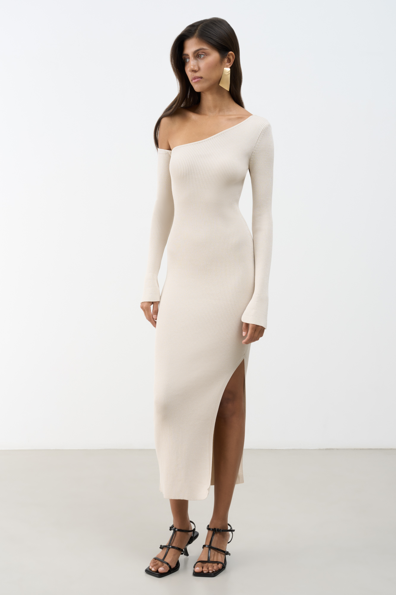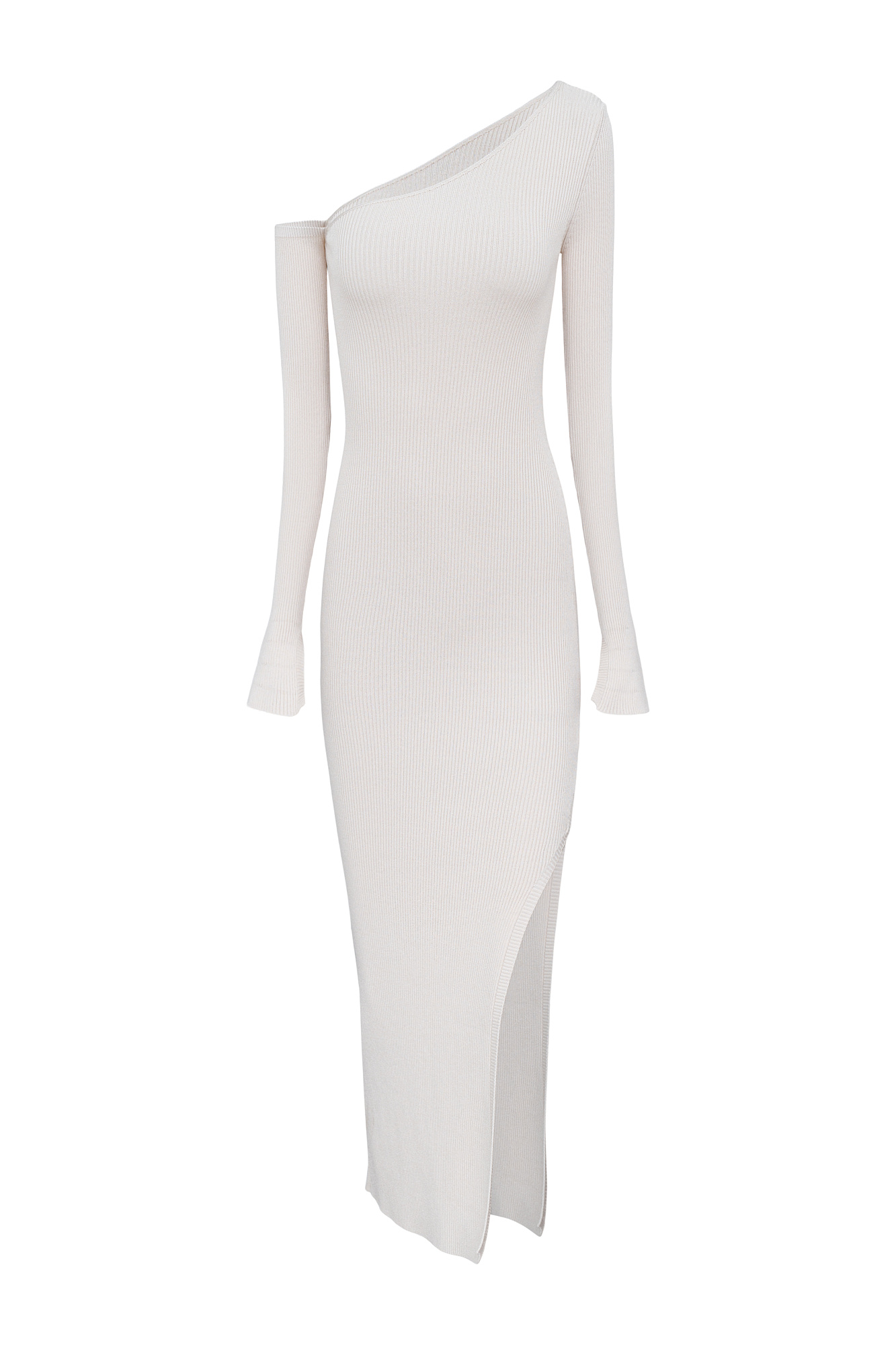 Трикотажное платье длины миди из вискозы в рубчик. Модель с асимметричным вырезом горловины, откытым плечом, длинными рукавами и разрезом сбоку.