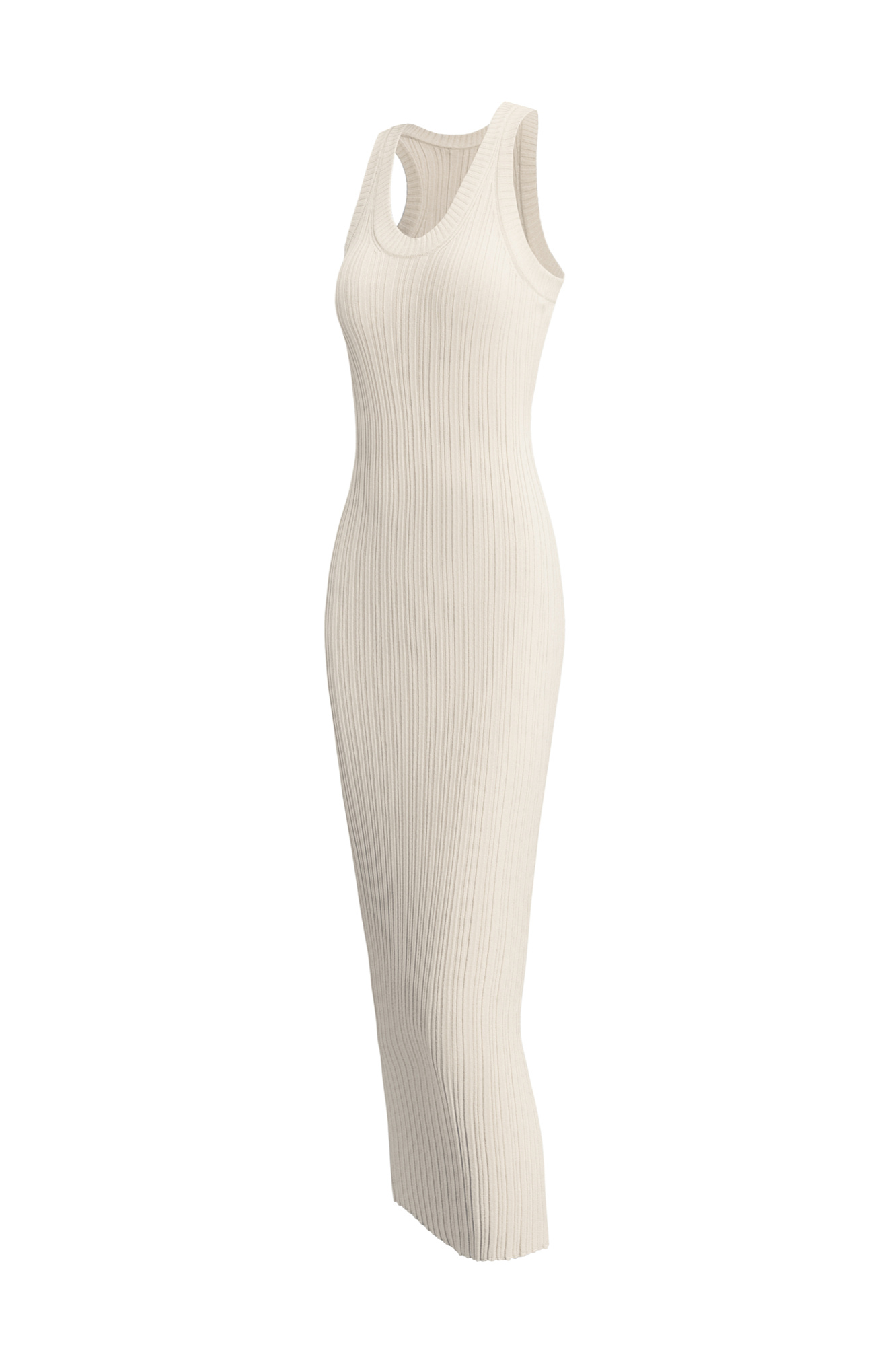 Трикотажное платье миди из тонкой вискозы. Модель приталенного силуэта, без рукавов, с глубокой проймой и U-вырезом горловины. Изделие выполнено в широкий рубчик.