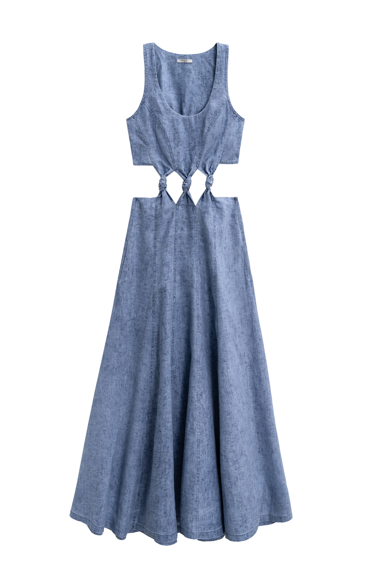 Платье длины миди из 100% льна. Модель приталенного силуэта с расклешенной юбкой, без рукавов, на широких бретельках и U-вырезом горловины. Изделие декорировано вертикальными швами и объемными узлами на талии.
