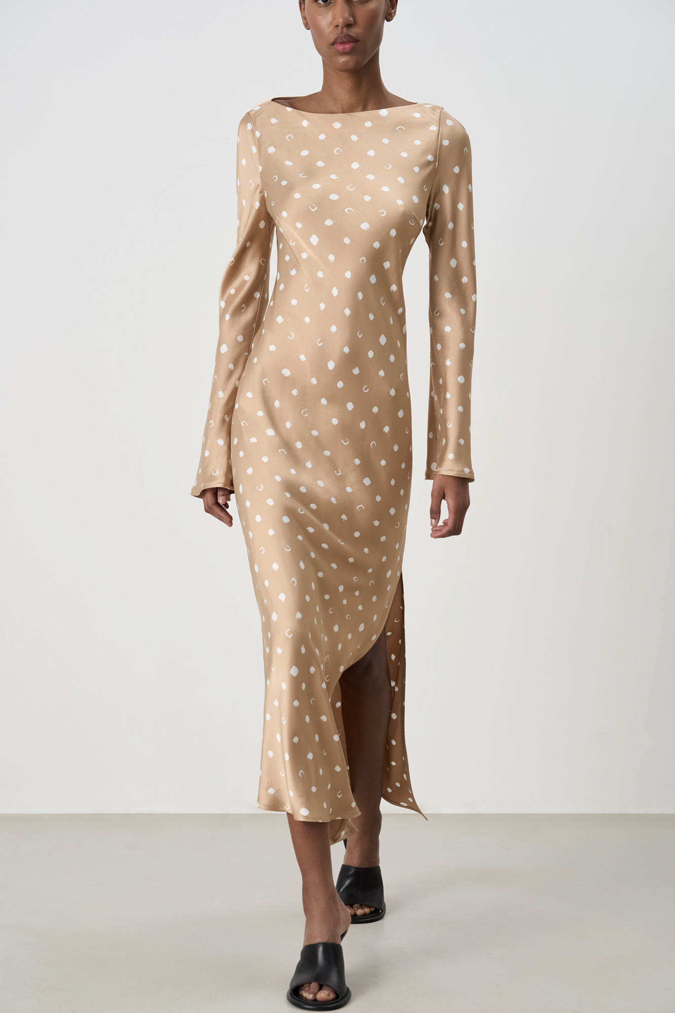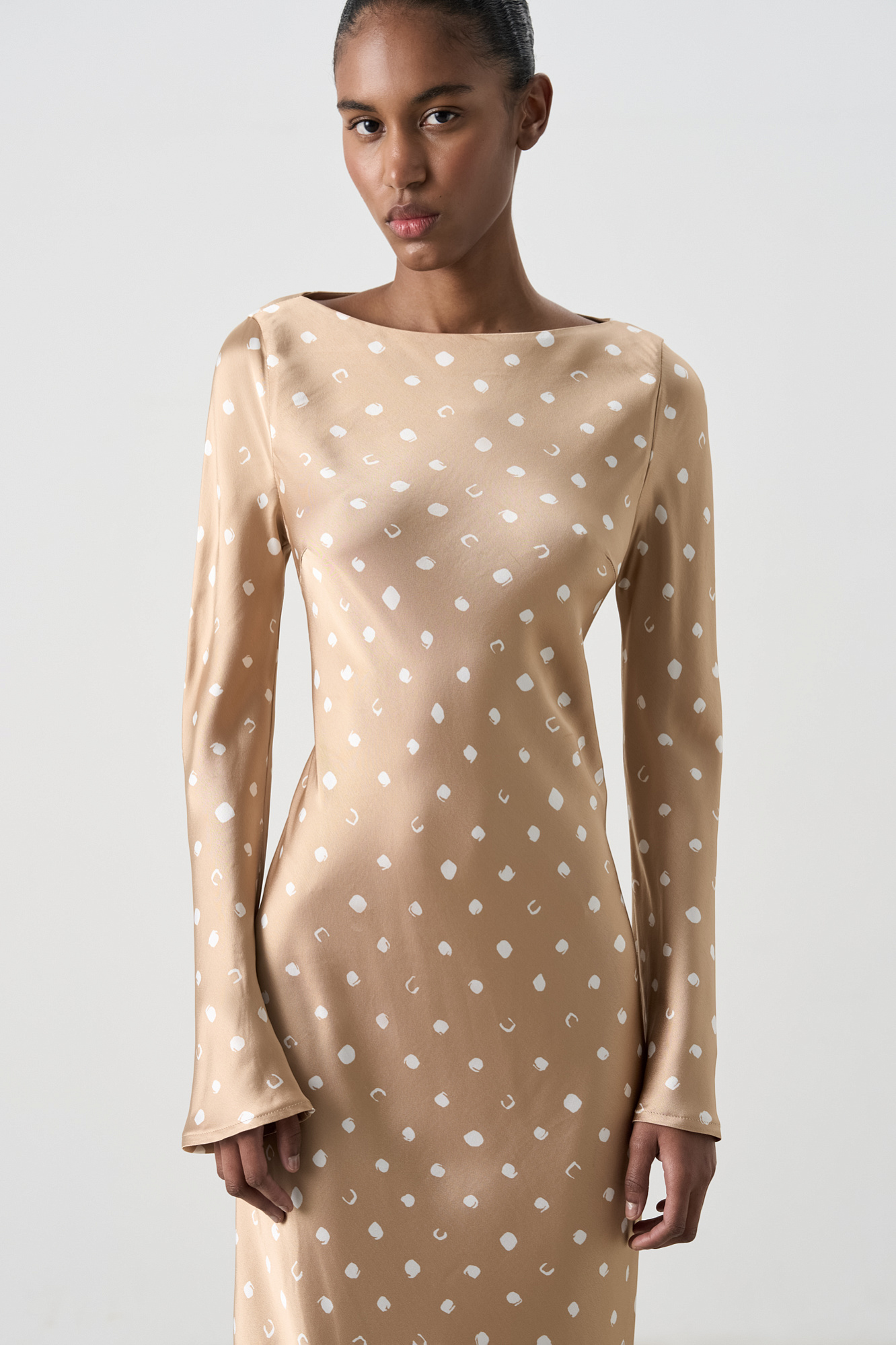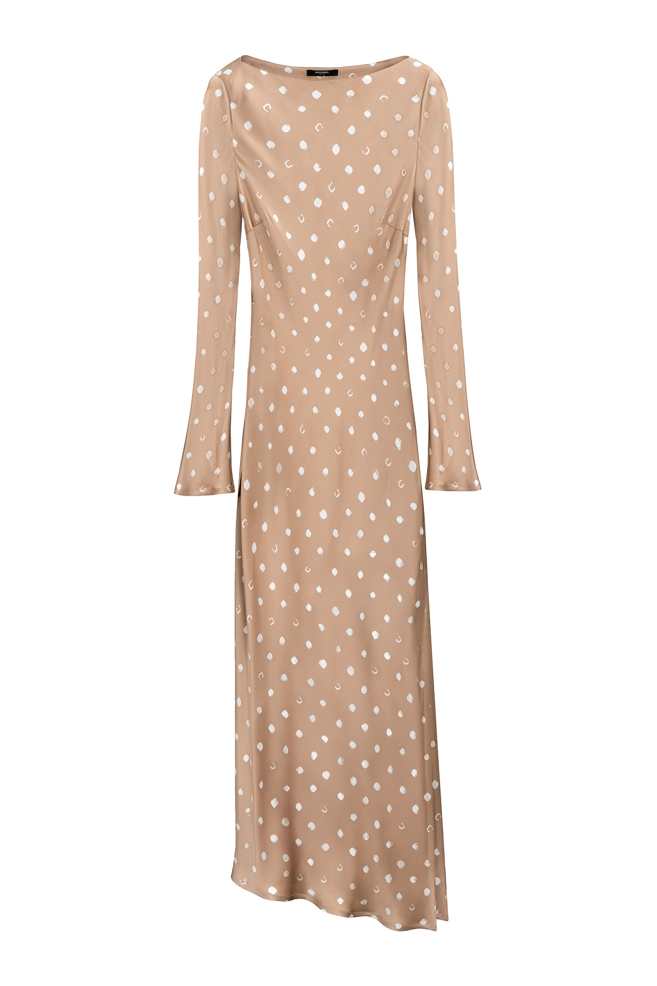 Платье длины миди из атласной 100% вискозы. Модель приталенного силуэта, с круглым вырезом горловины и длинными расклешенными рукавами. Боковой разрез. Застежка на потайную молнию сбоку.
