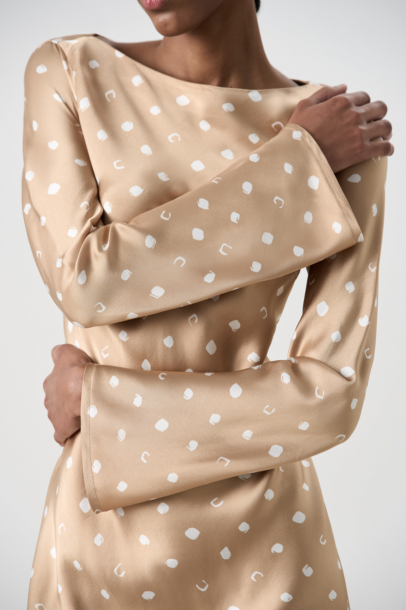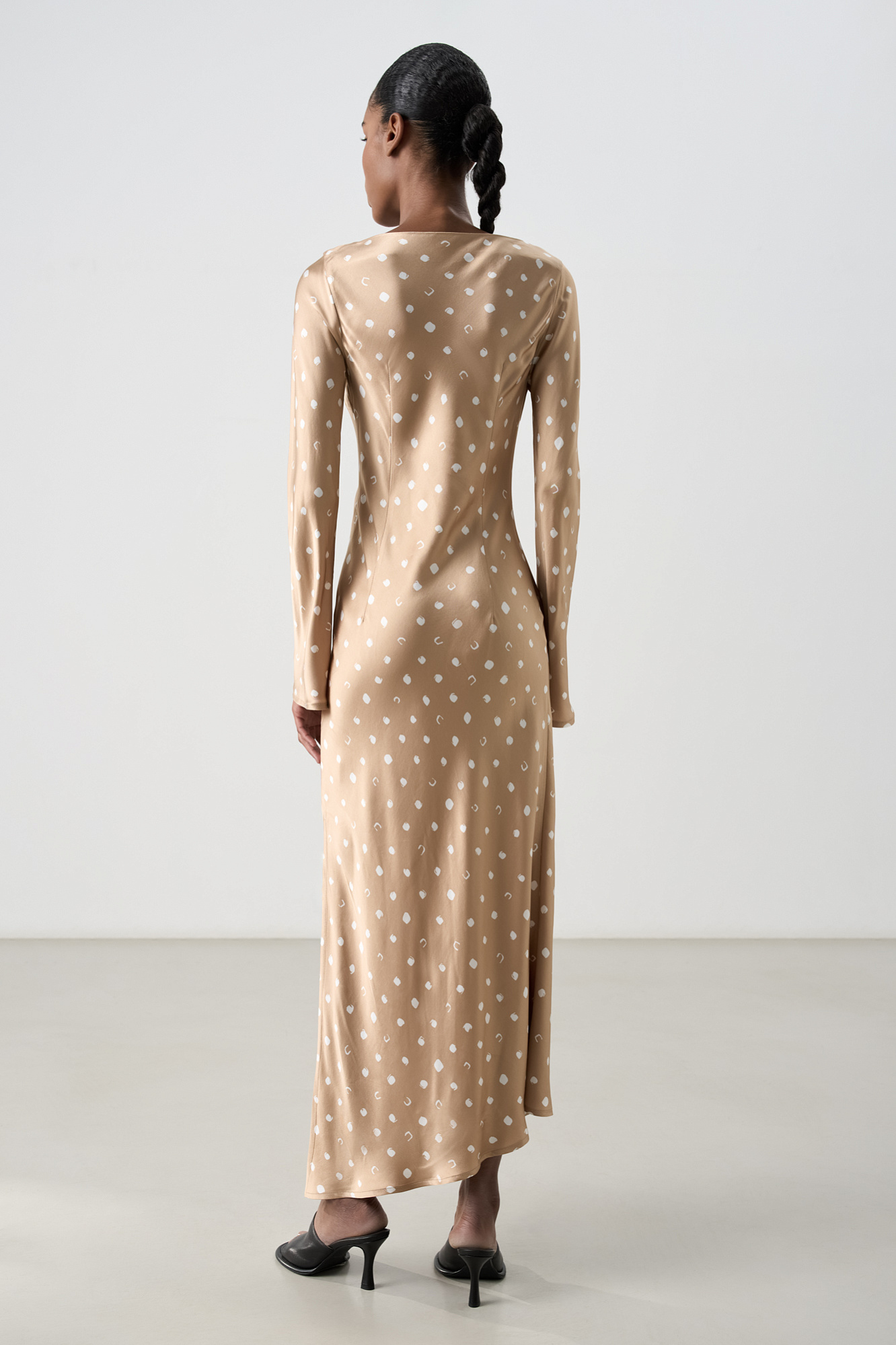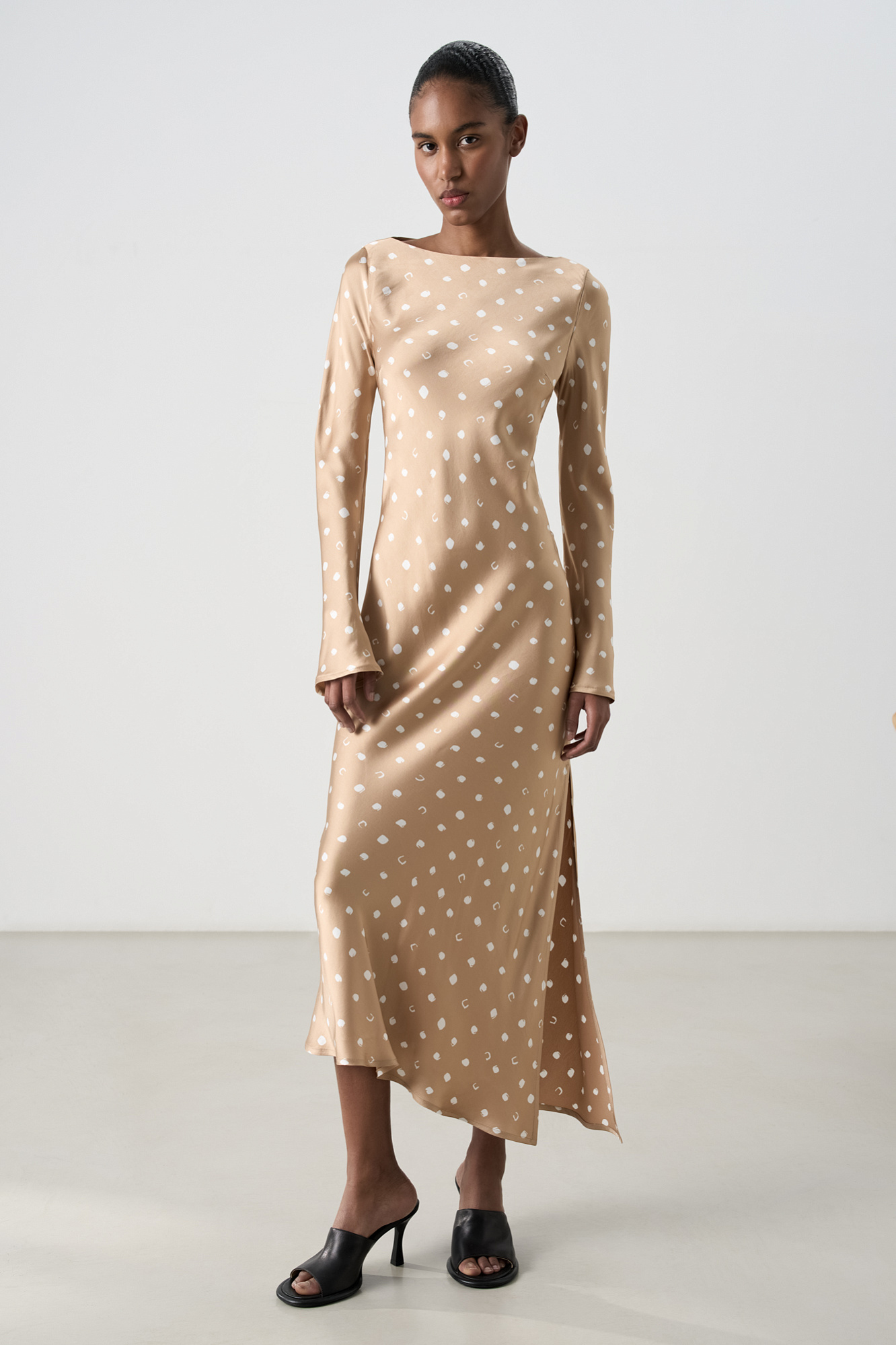 Платье длины миди из атласной 100% вискозы. Модель приталенного силуэта, с круглым вырезом горловины и длинными расклешенными рукавами. Боковой разрез. Застежка на потайную молнию сбоку.