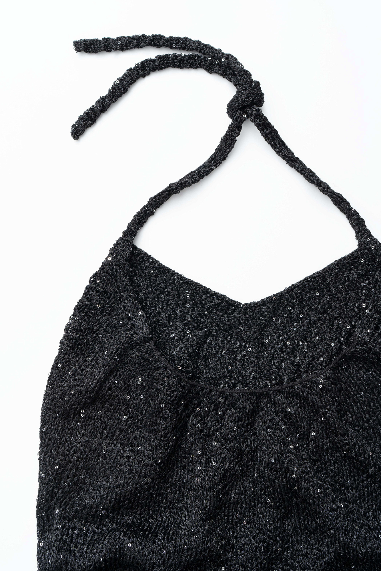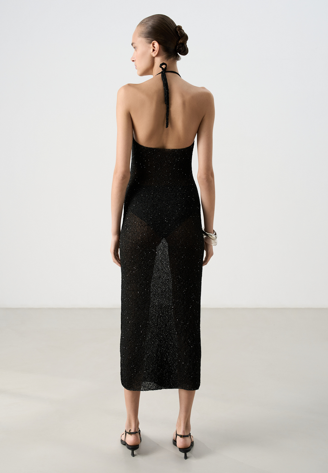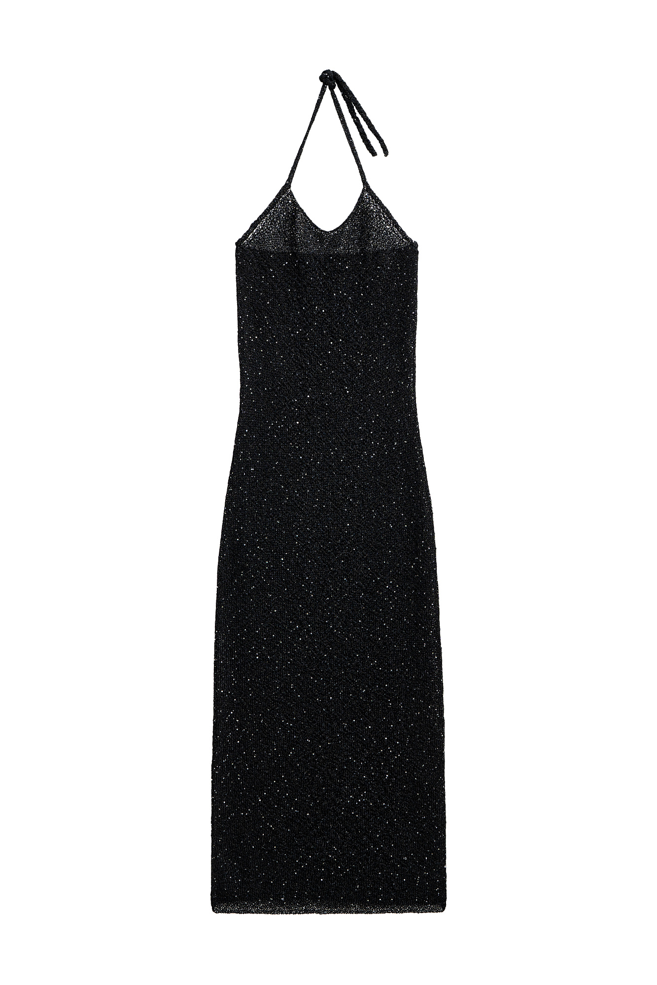 Трикотажное платье длины миди из хлопка с добавлением вискозы. Изделие декорировано мелкими пайетками. Модель прямого кроя с открытой спиной и двумя лямками-завязками на шее. Без подкладки.