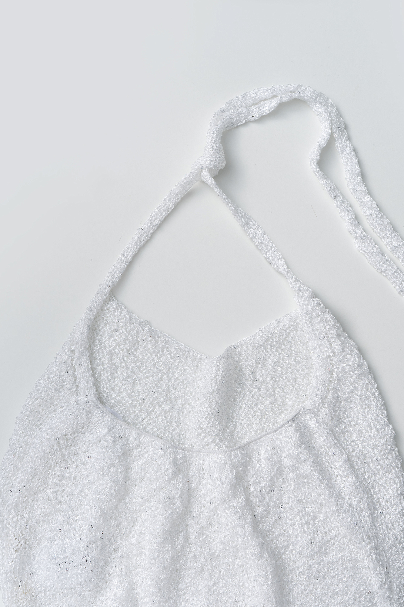 Трикотажное платье длины миди из хлопка с добавлением вискозы. Изделие декорировано мелкими пайетками. Модель прямого кроя с открытой спиной и двумя лямками-завязками на шее. Без подкладки.