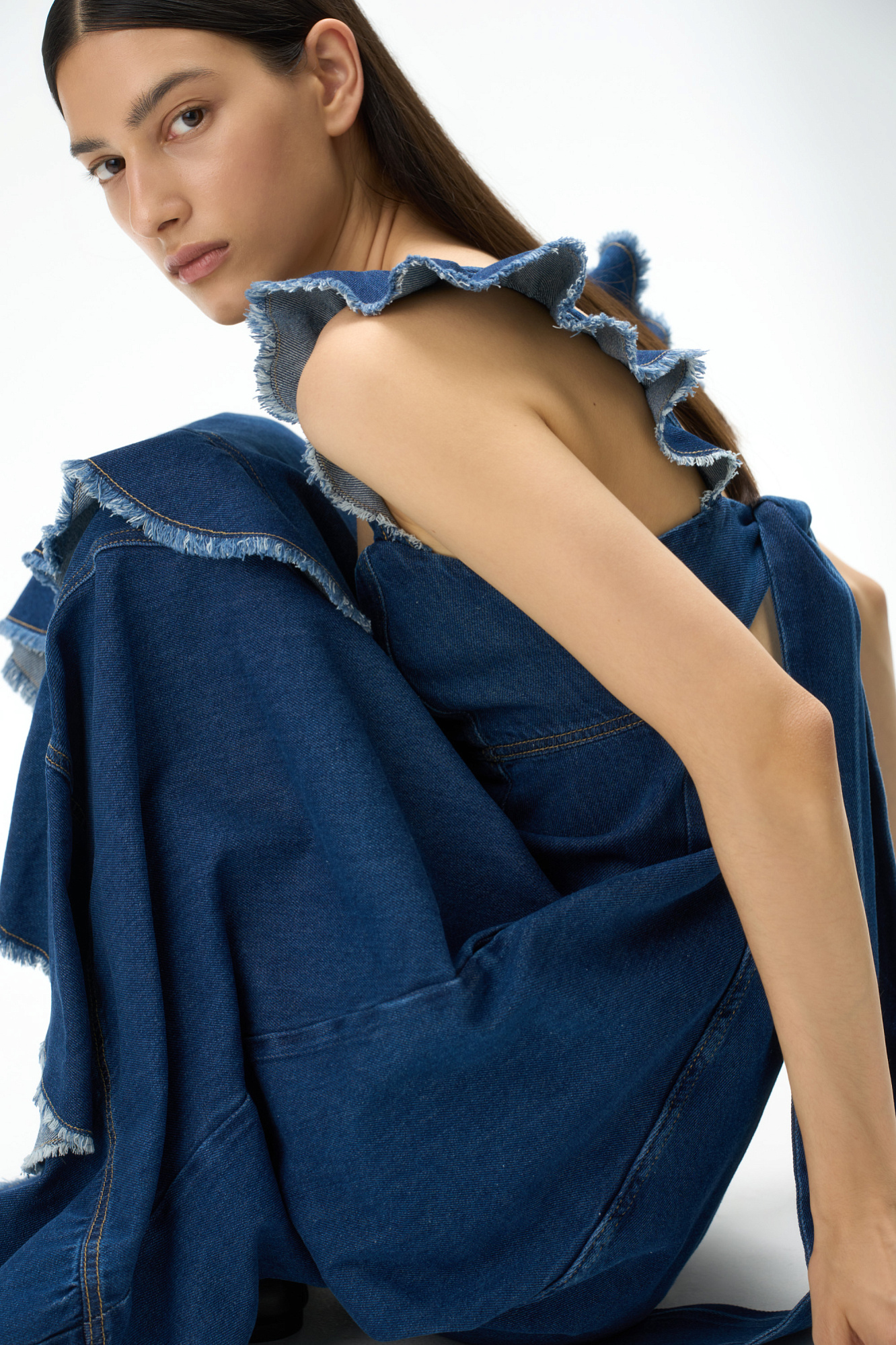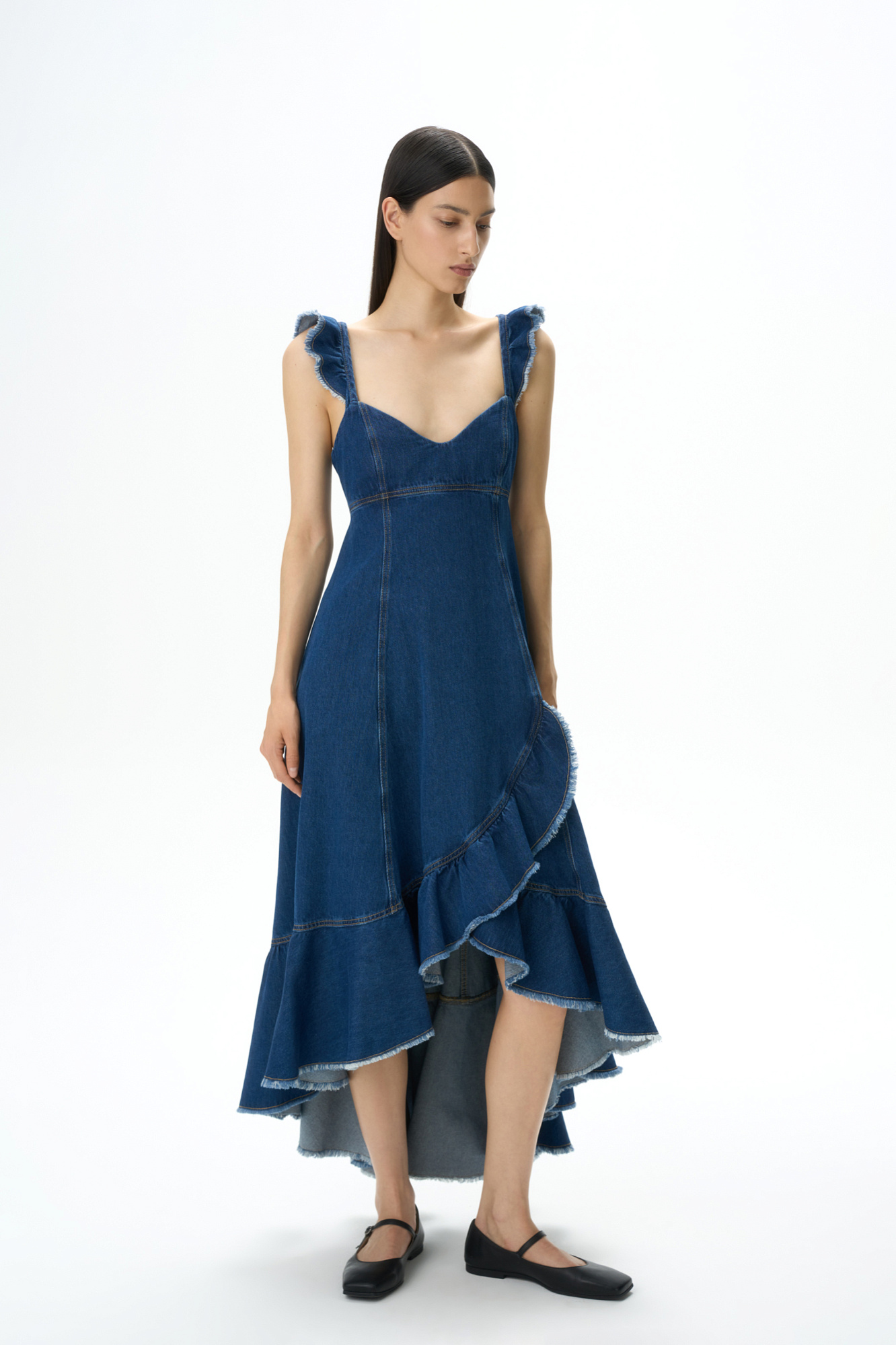 Джинсовый сарафан с завязками на спине, разрез с воланами на юбке, фигурный вырез, завышенная линия талии.