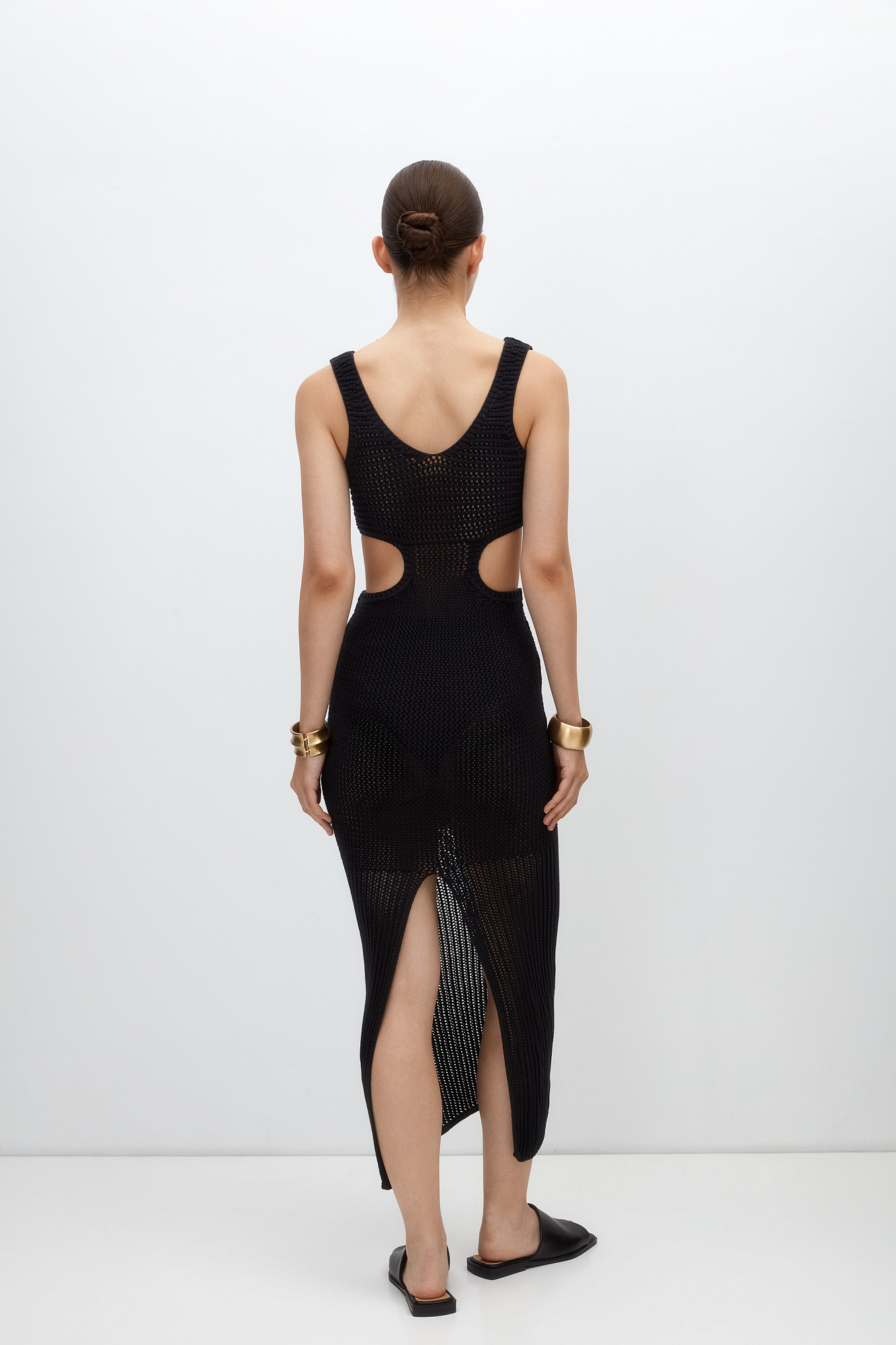 Трикотажный сарафан из 100% хлопка. Модель без рукавов, на широких бретельках, с глубоким вырезом декольте, декорированным металлической фурнитурой. Акцентные вырезы на талии и сзади изделия.