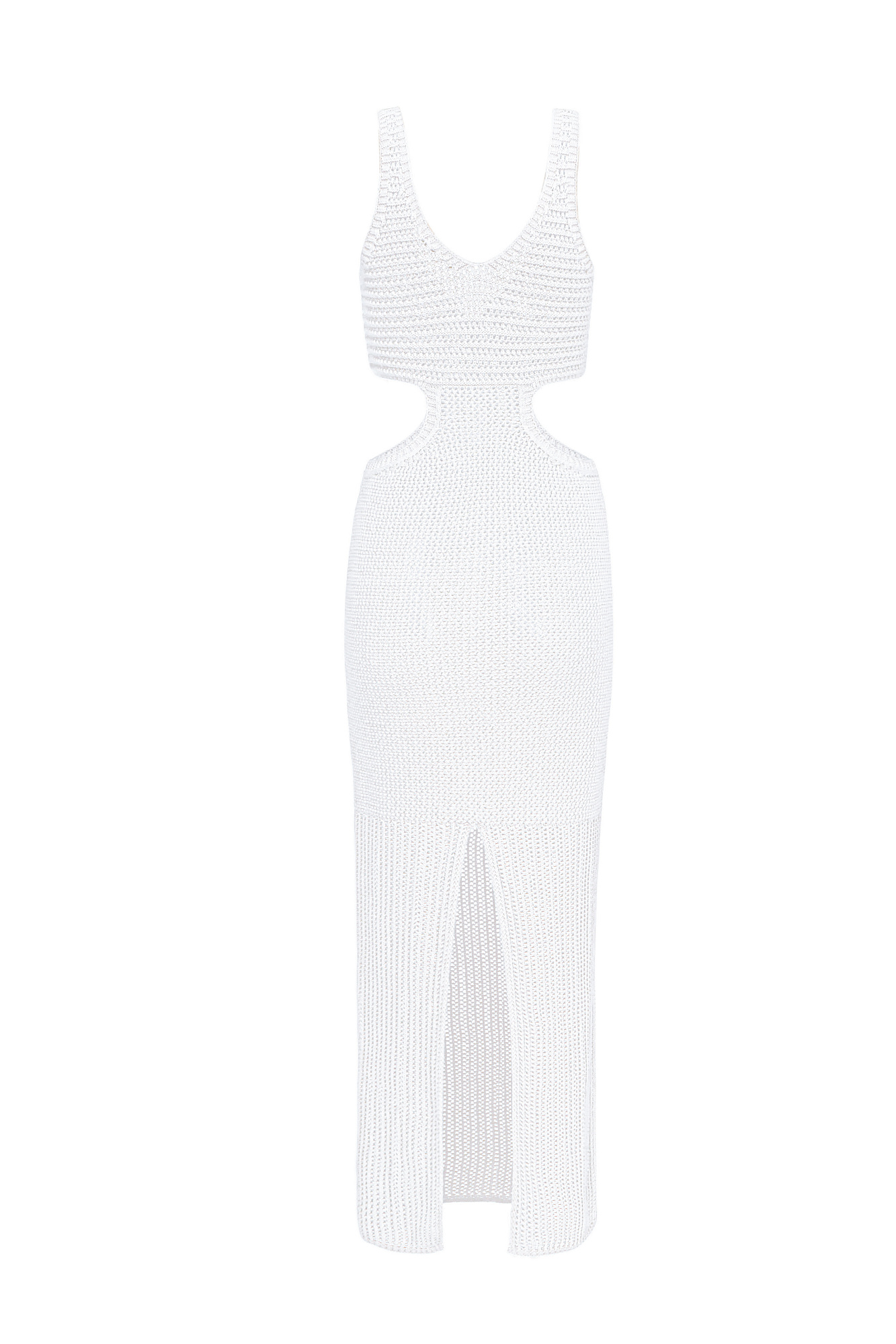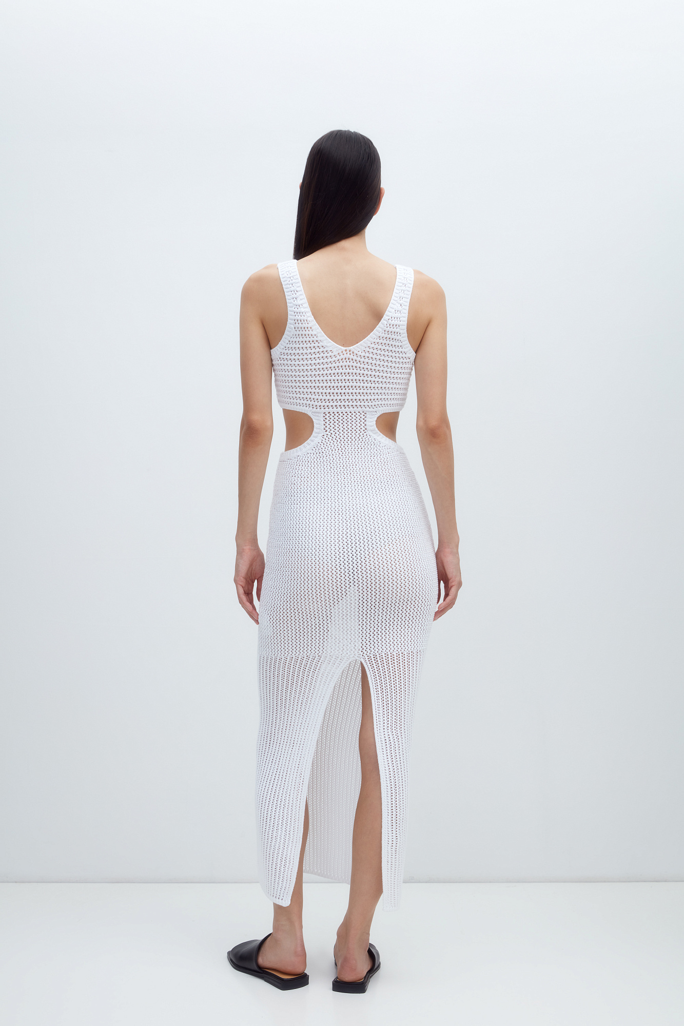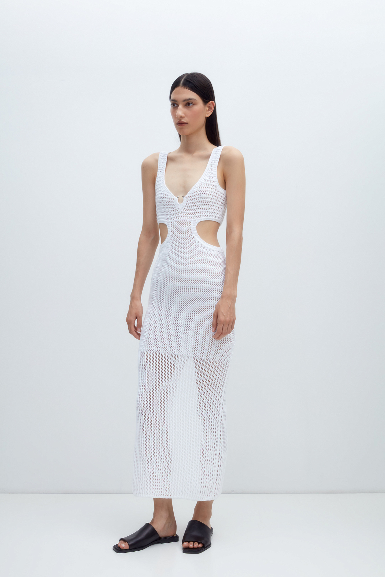 Трикотажный сарафан из 100% хлопка. Модель без рукавов, на широких бретельках, с глубоким вырезом декольте, декорированным металлической фурнитурой. Акцентные вырезы на талии и сзади изделия.
