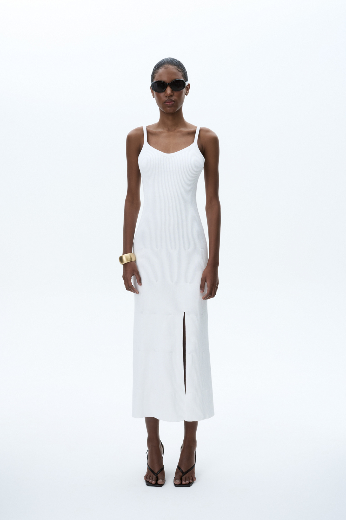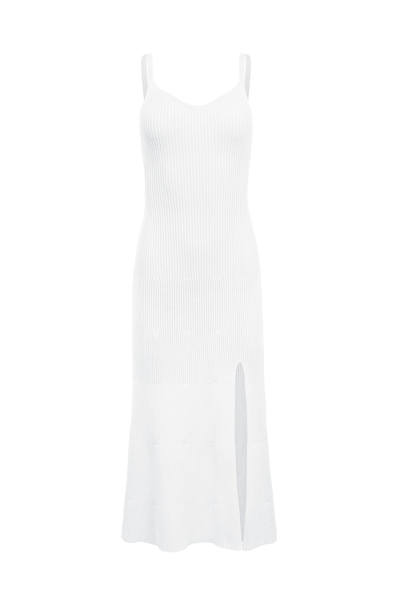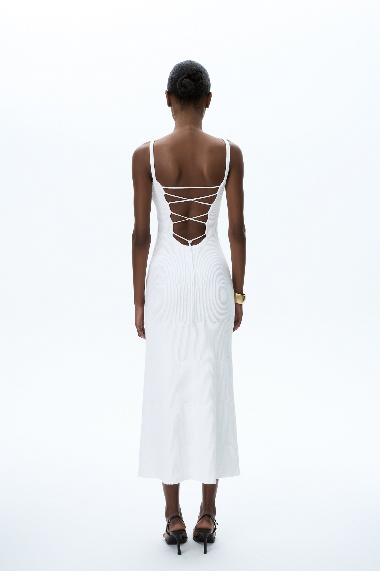 Трикотажный сарафан из 100% хлопка. Модель приталенного силуэта с разрезом сбоку и шнуровкой на спине.