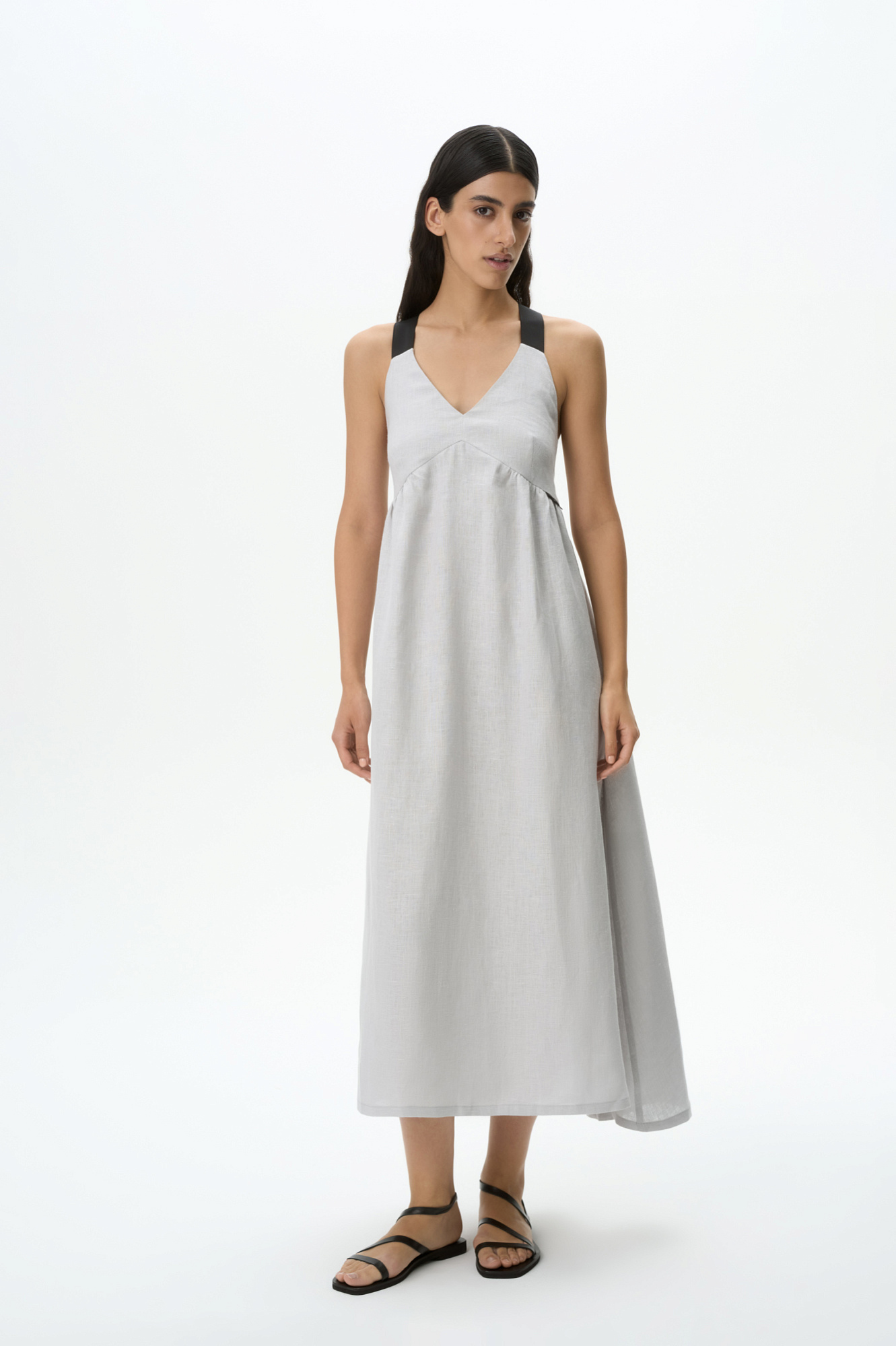 Сарафан из 100% льна длины макси. Модель прямого кроя с акцентным лифом, юбкой А-силуэта и широкими бретелями-лентами контрастного цвета. Вырез на спине.