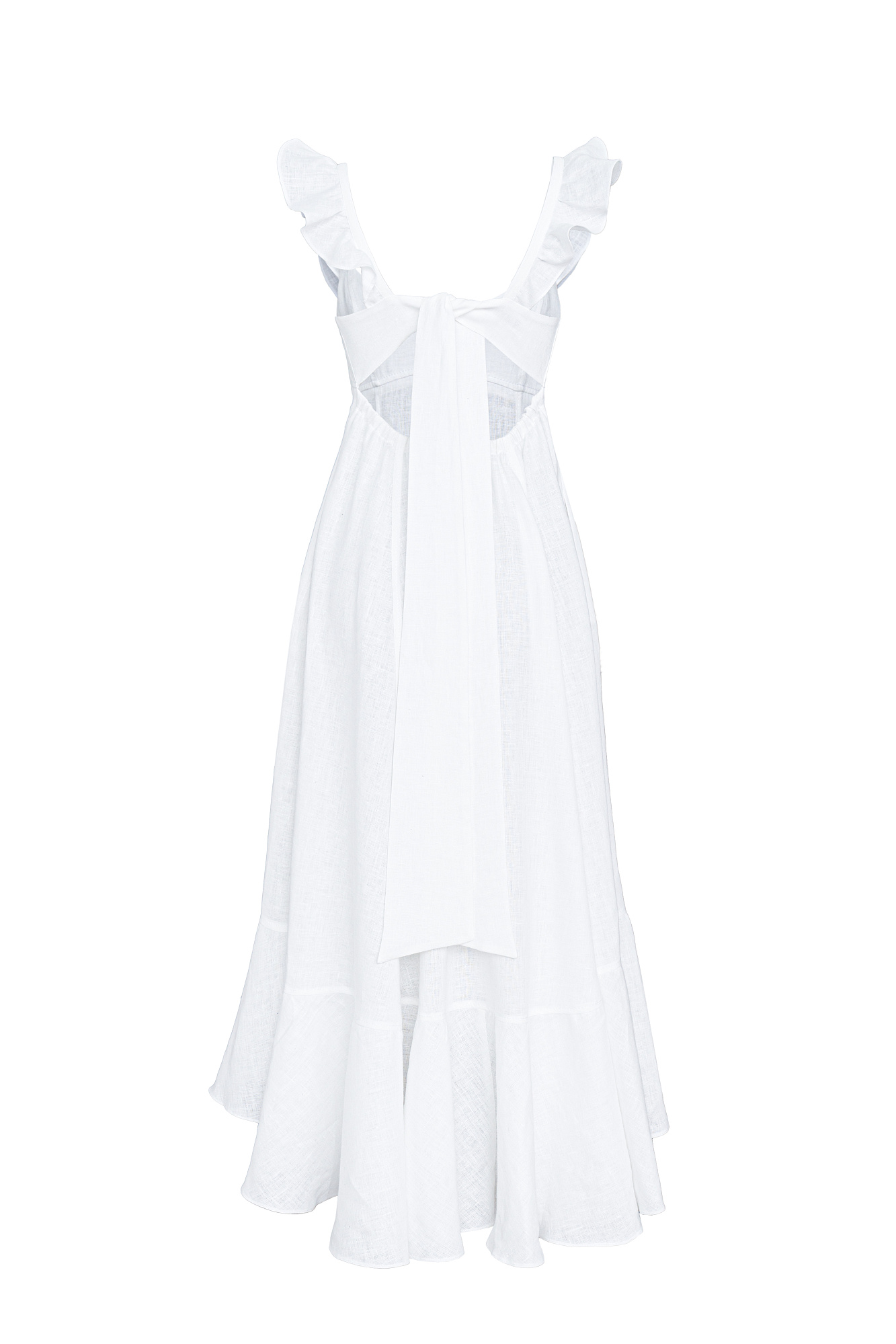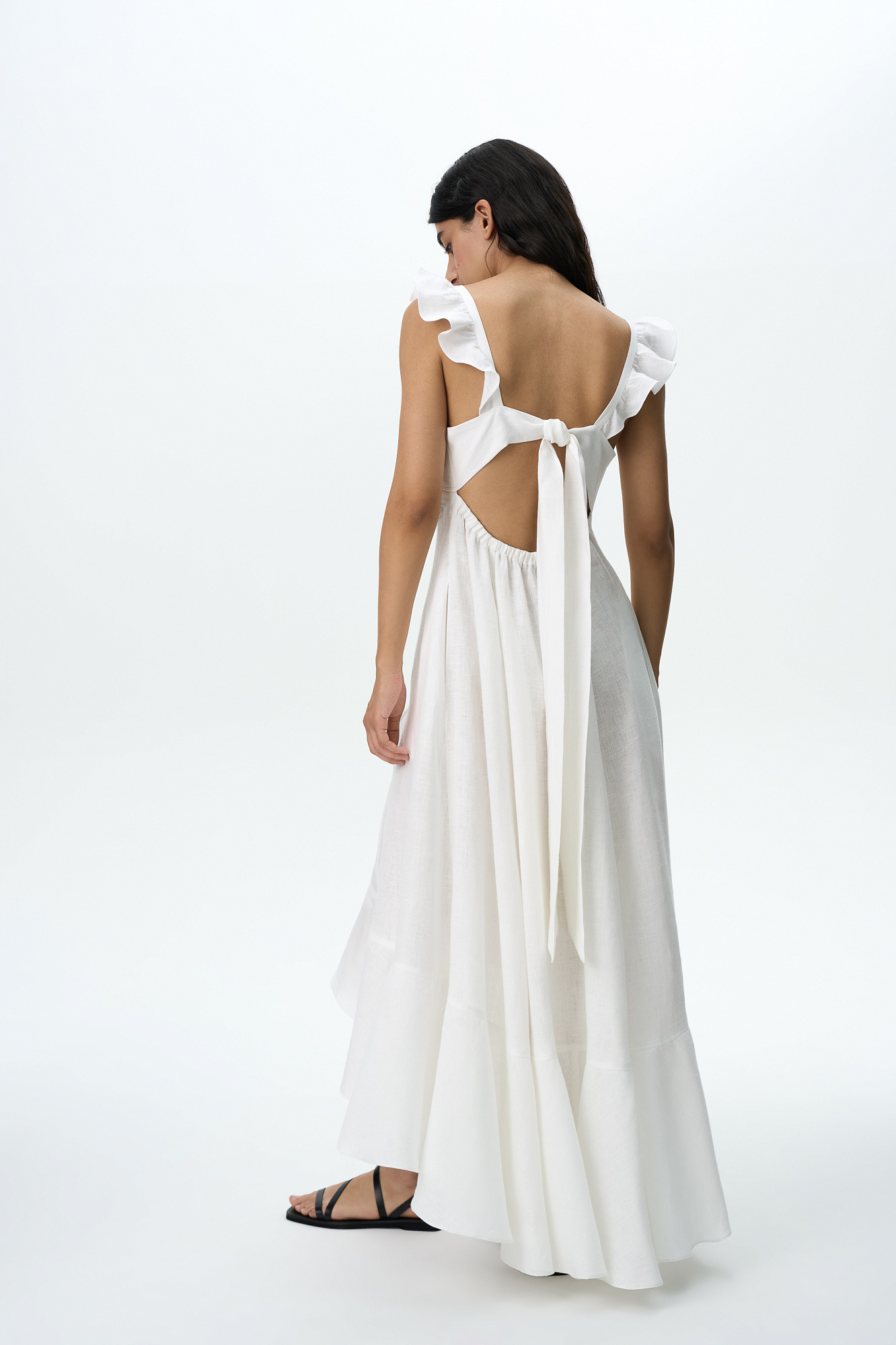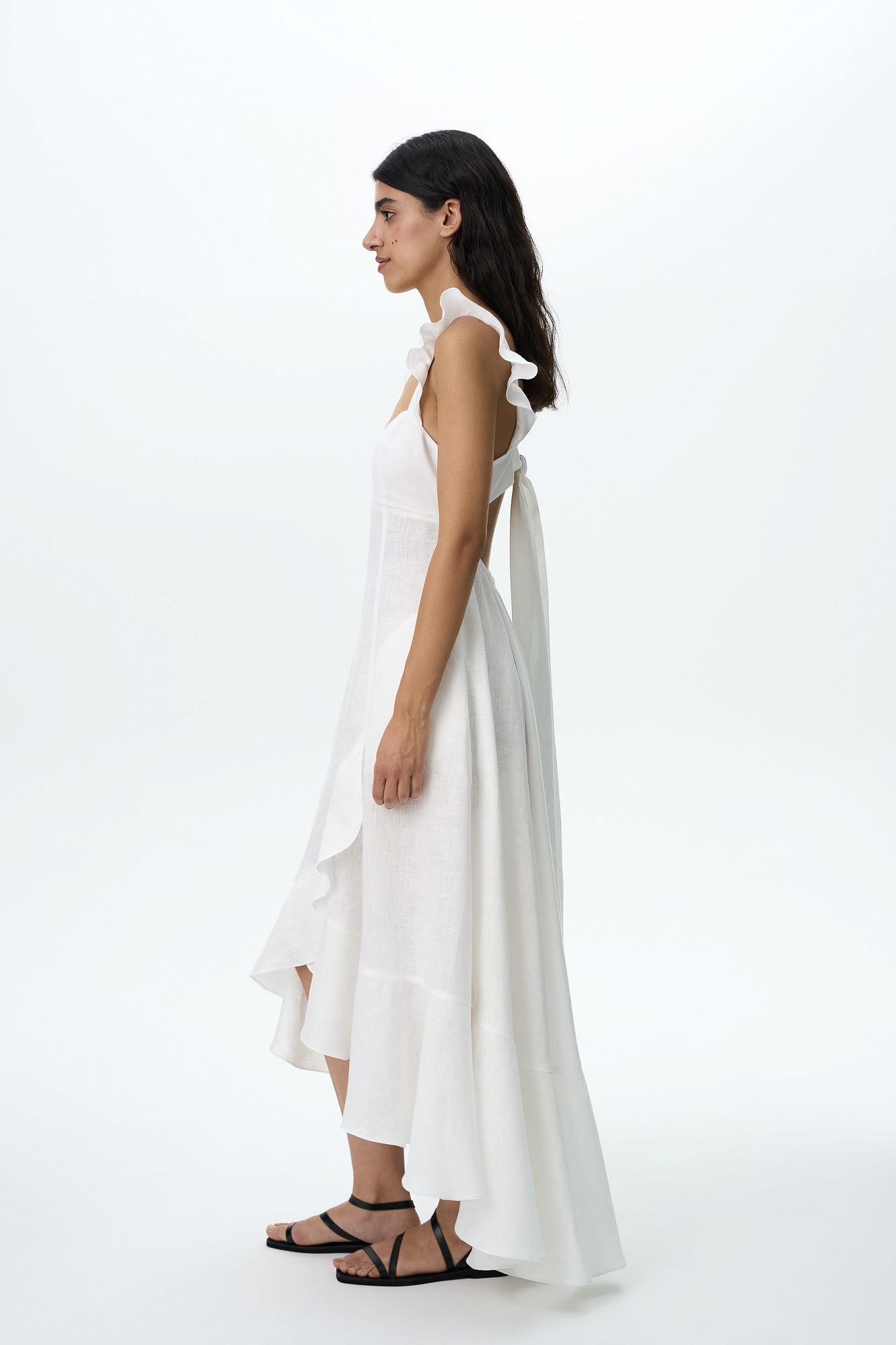 Сарафан длины миди из 100% льна. Модель без рукавов на широкиз лямках с оборками, открытой спиной, асимметричным низом и воланами на юбке.