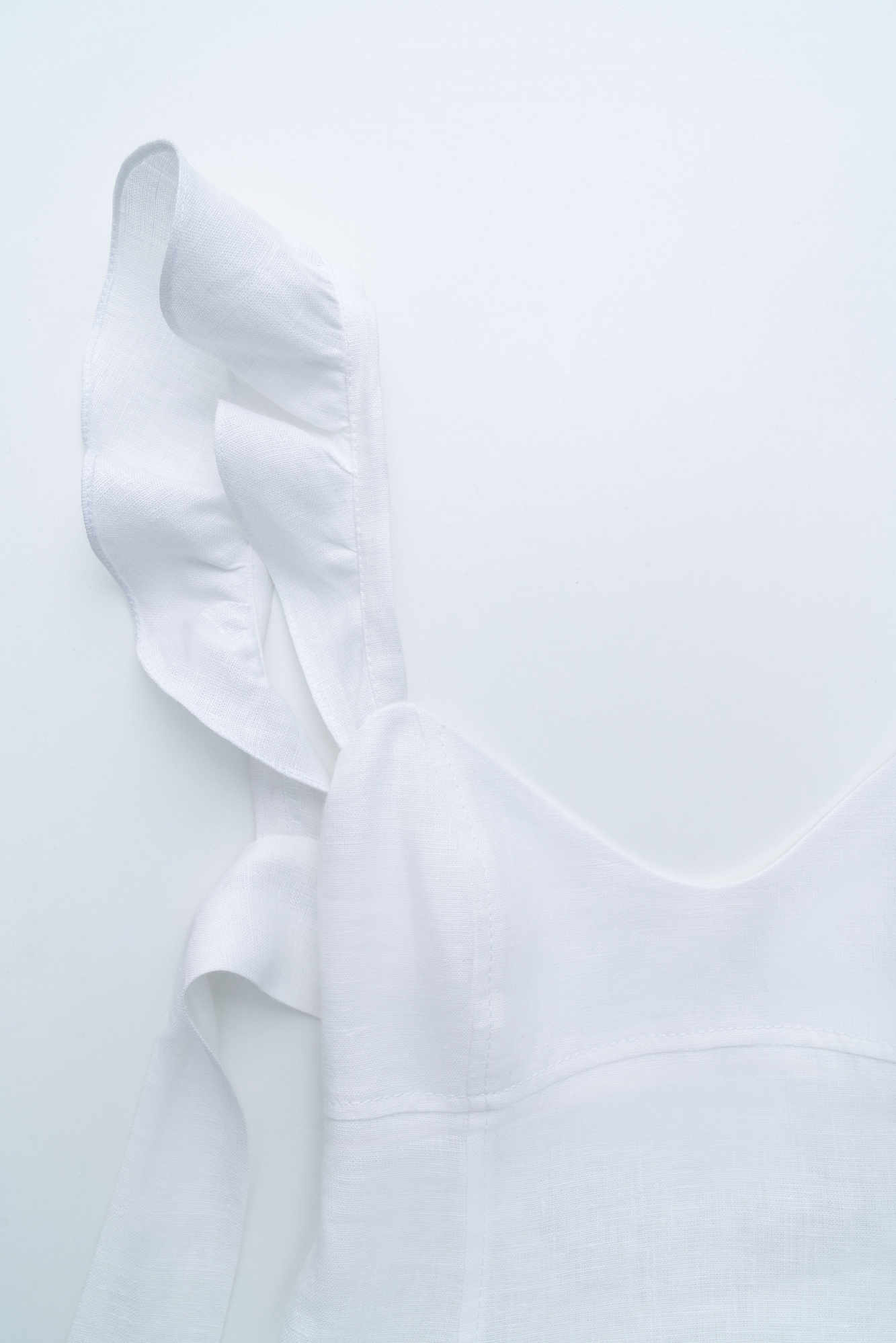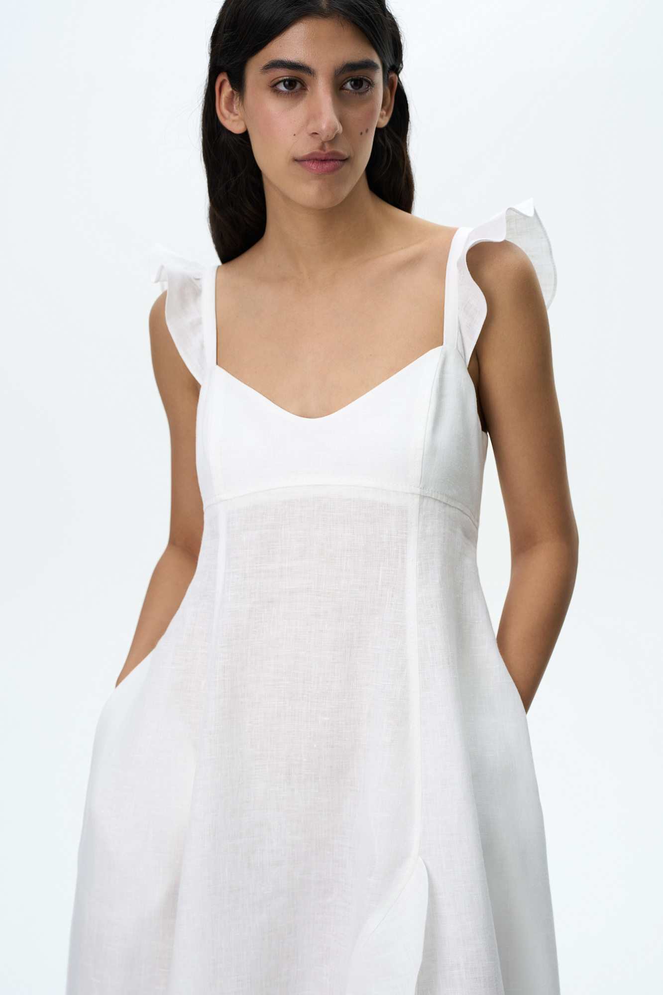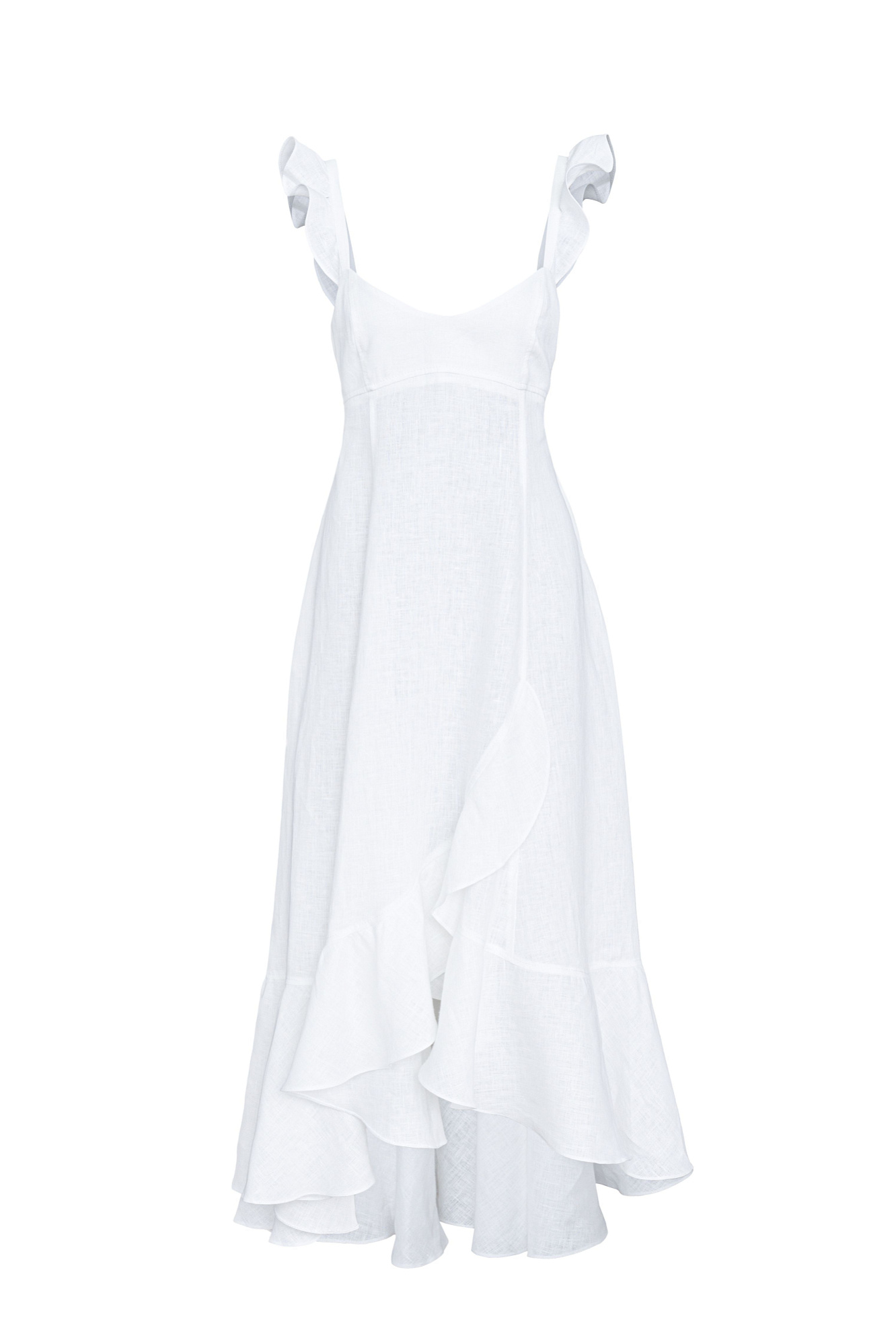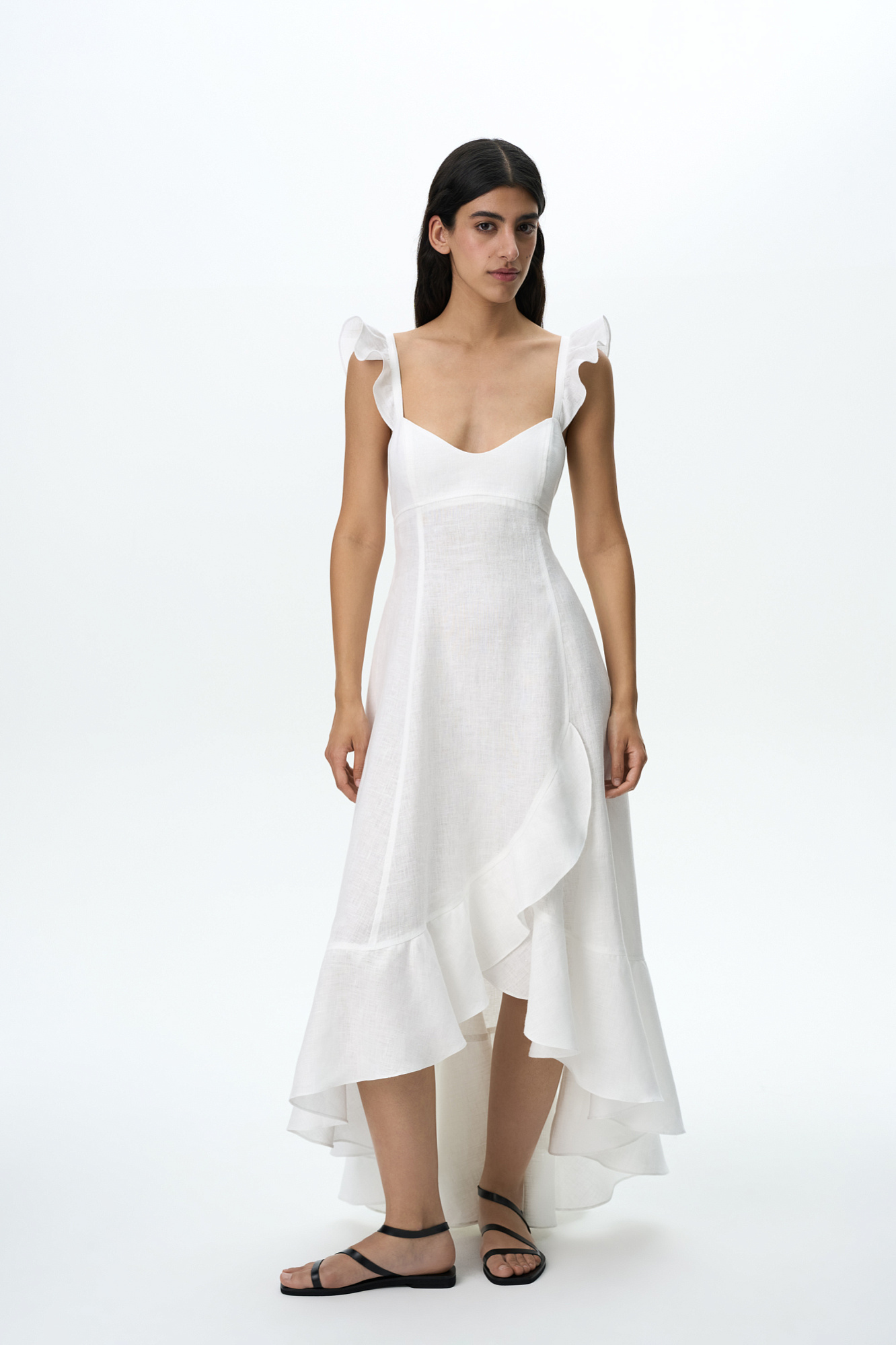 Сарафан длины миди из 100% льна. Модель без рукавов на широкиз лямках с оборками, открытой спиной, асимметричным низом и воланами на юбке.