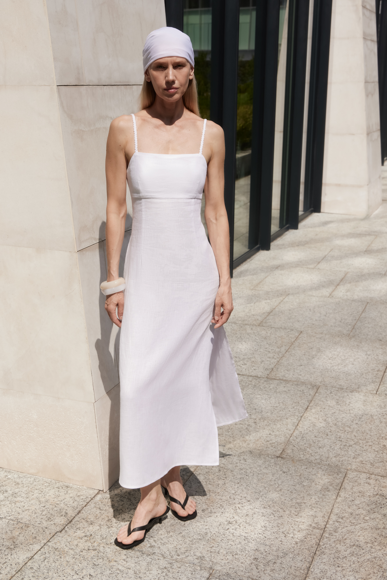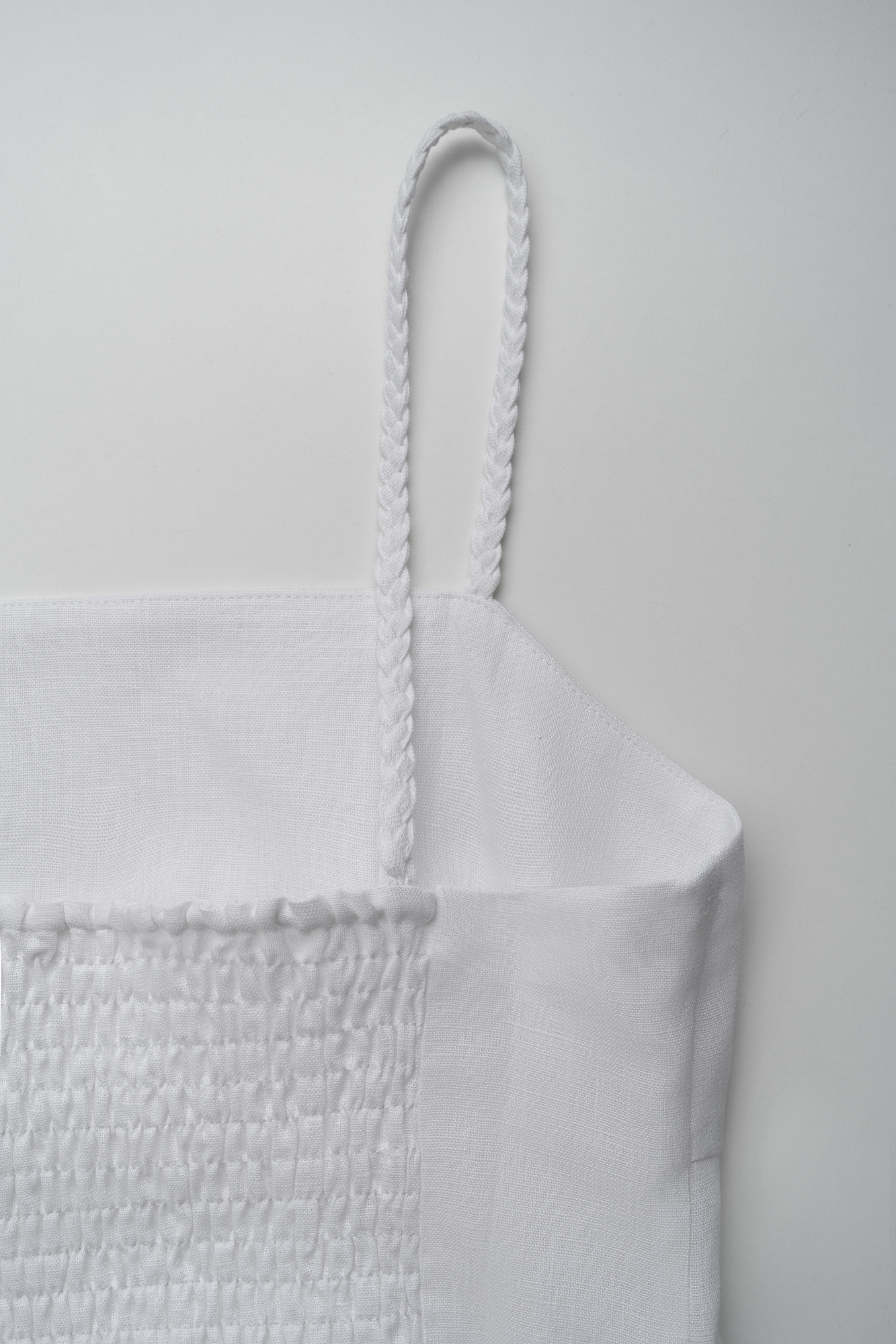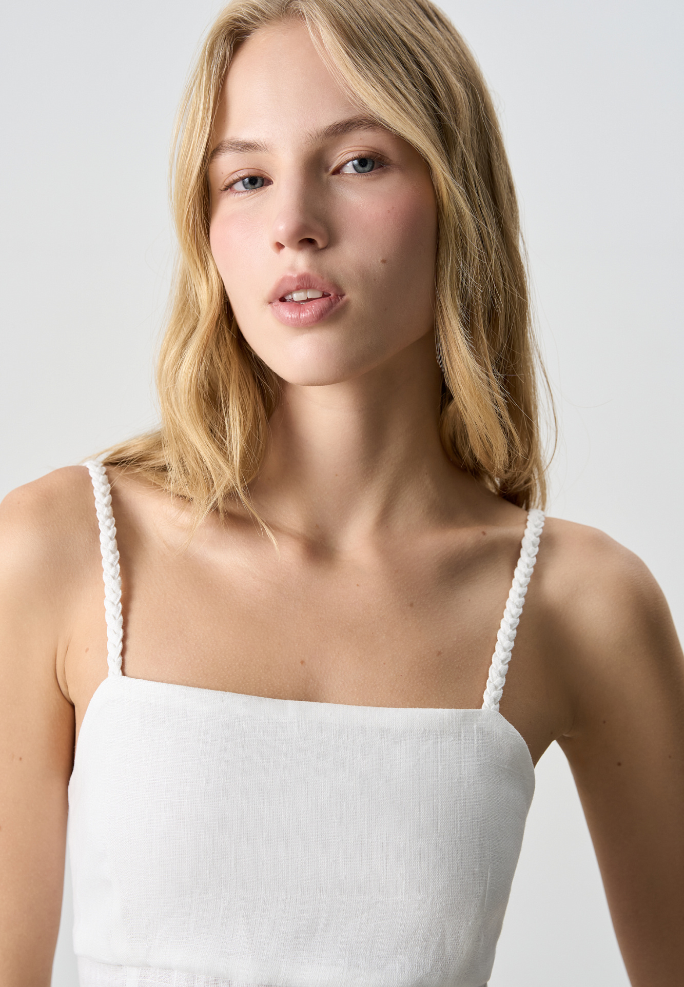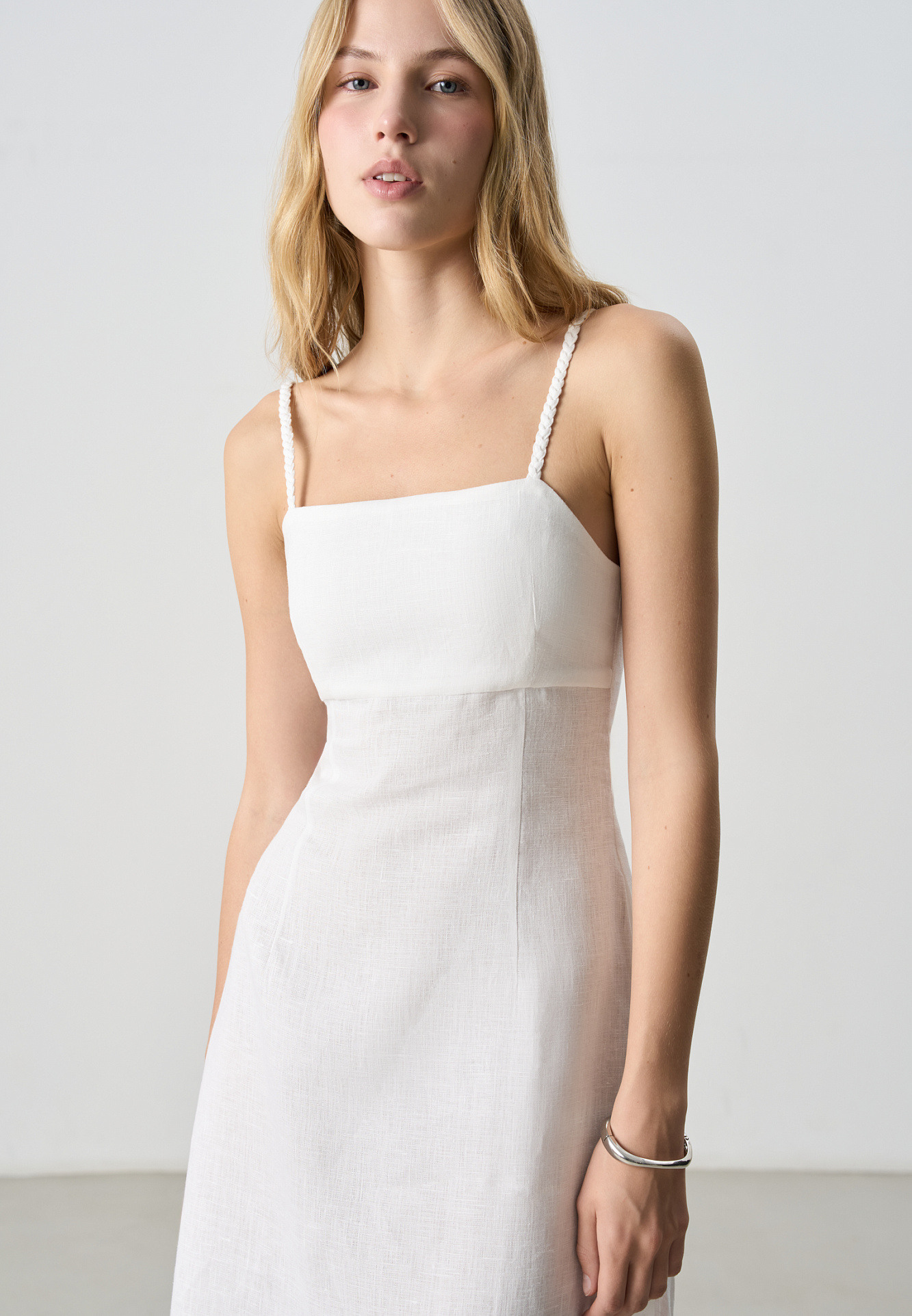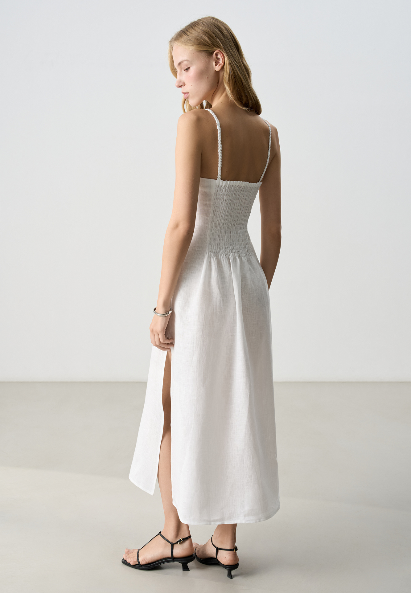 Сарафан длины миди из 100% льна. Модель приталенного силуэта, на тонких бретельках в виде косичек и высоким разрезом сбоку. Спинка изделия выполнена на резинке.