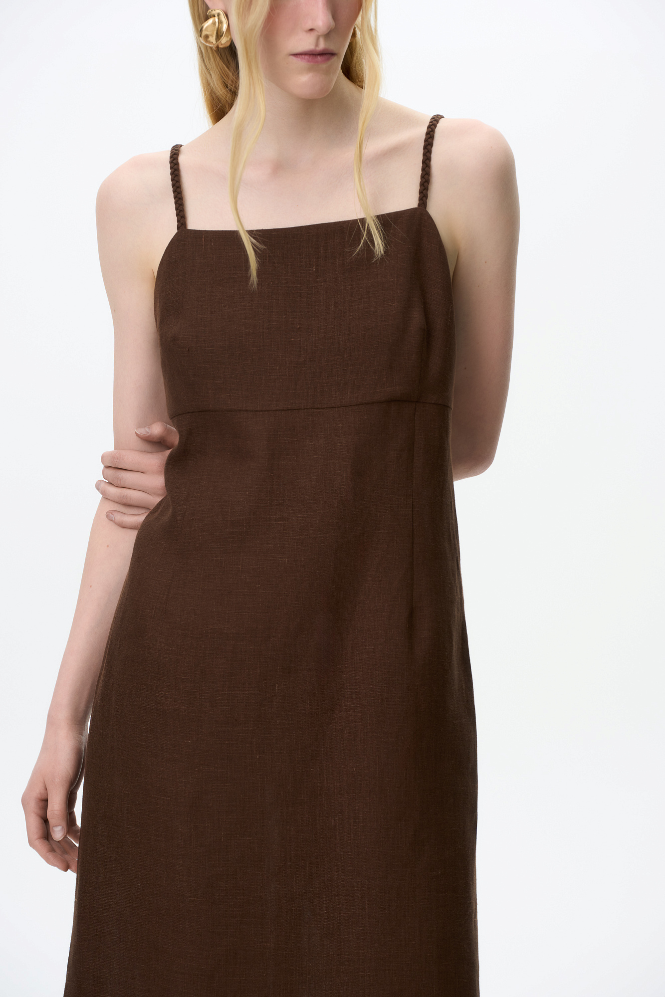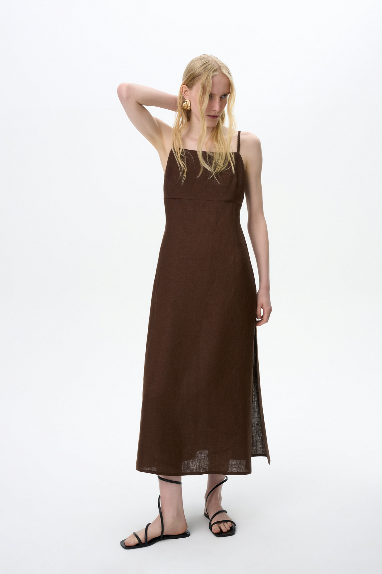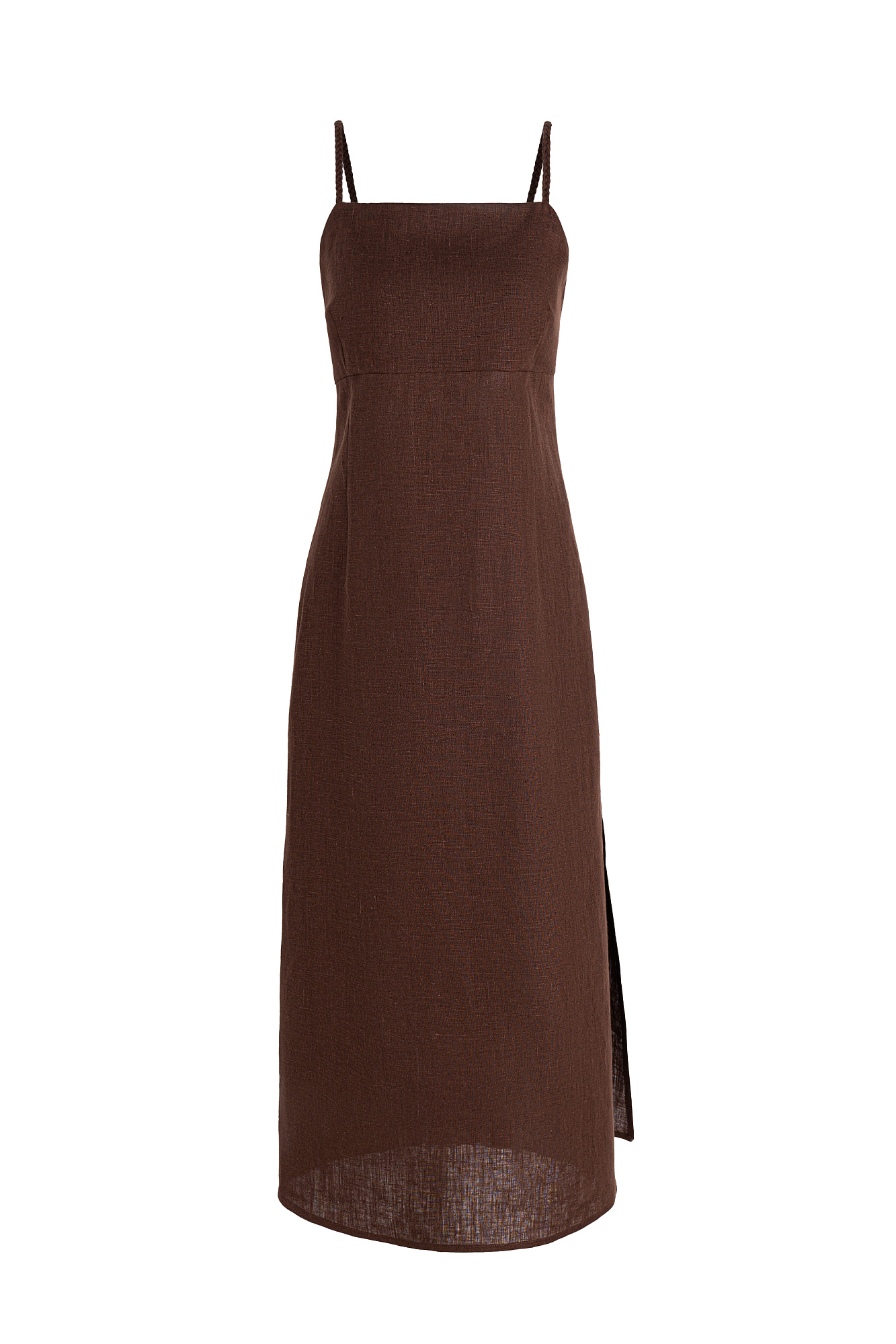 Сарафан длины миди из 100% льна. Модель приталенного силуэта, на тонких бретельках в виде косичек и высоким разрезом сбоку. Спинка изделия выполнена на резинке.