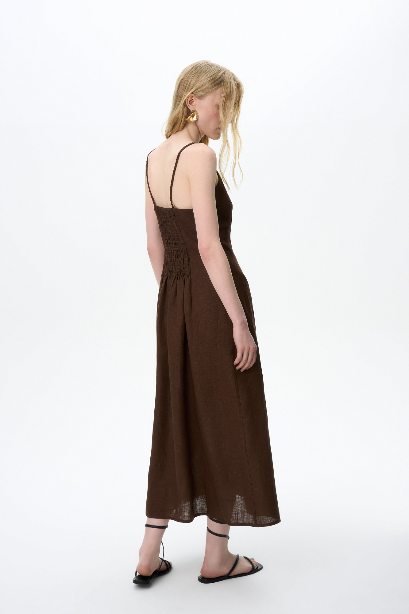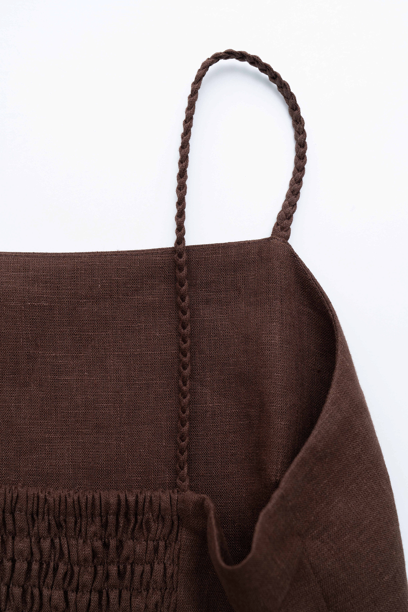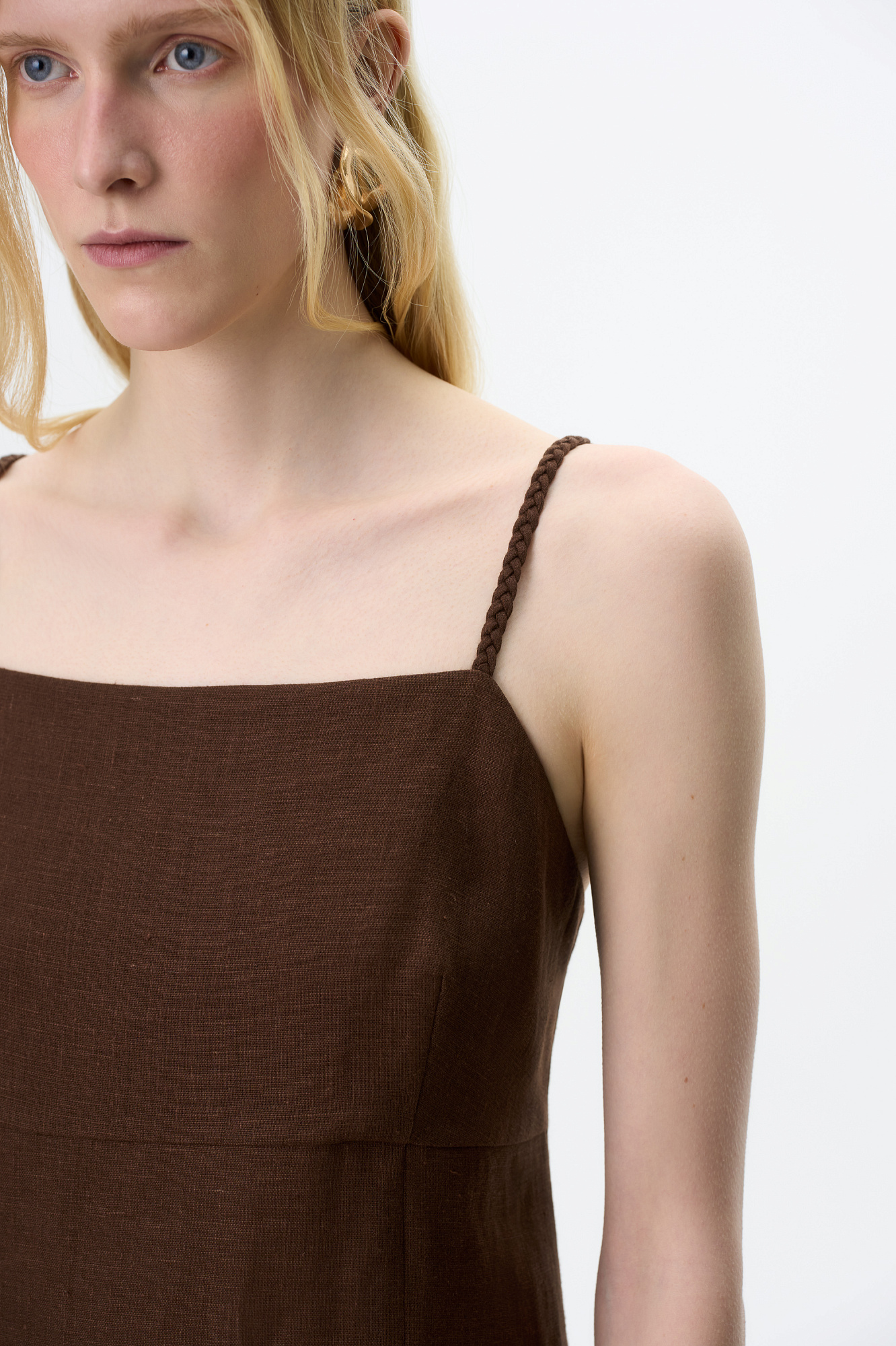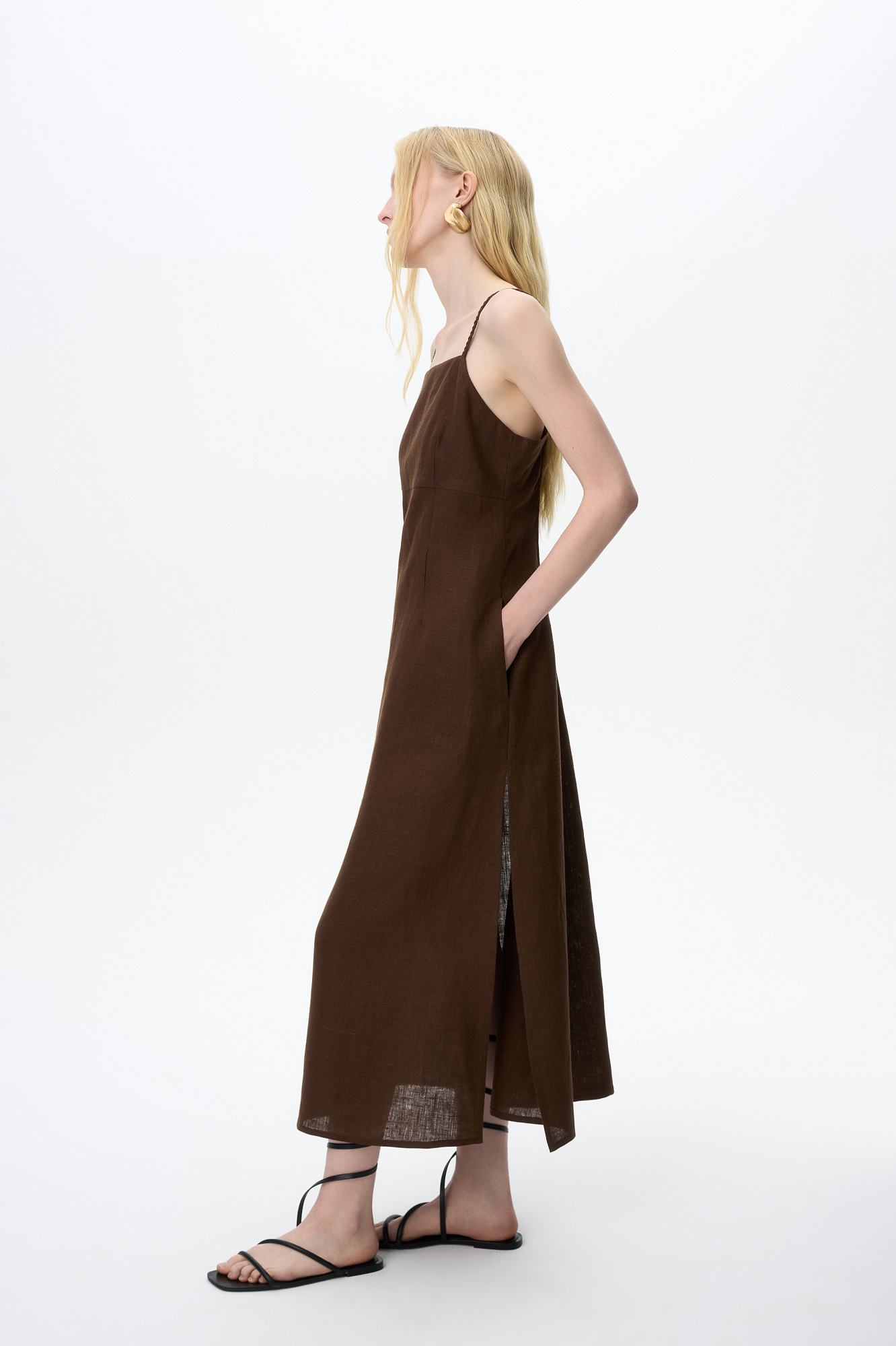 Сарафан длины миди из 100% льна. Модель приталенного силуэта, на тонких бретельках в виде косичек и высоким разрезом сбоку. Спинка изделия выполнена на резинке.