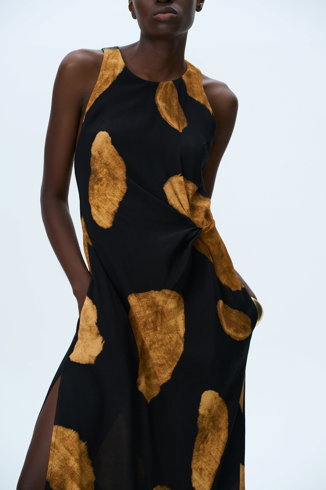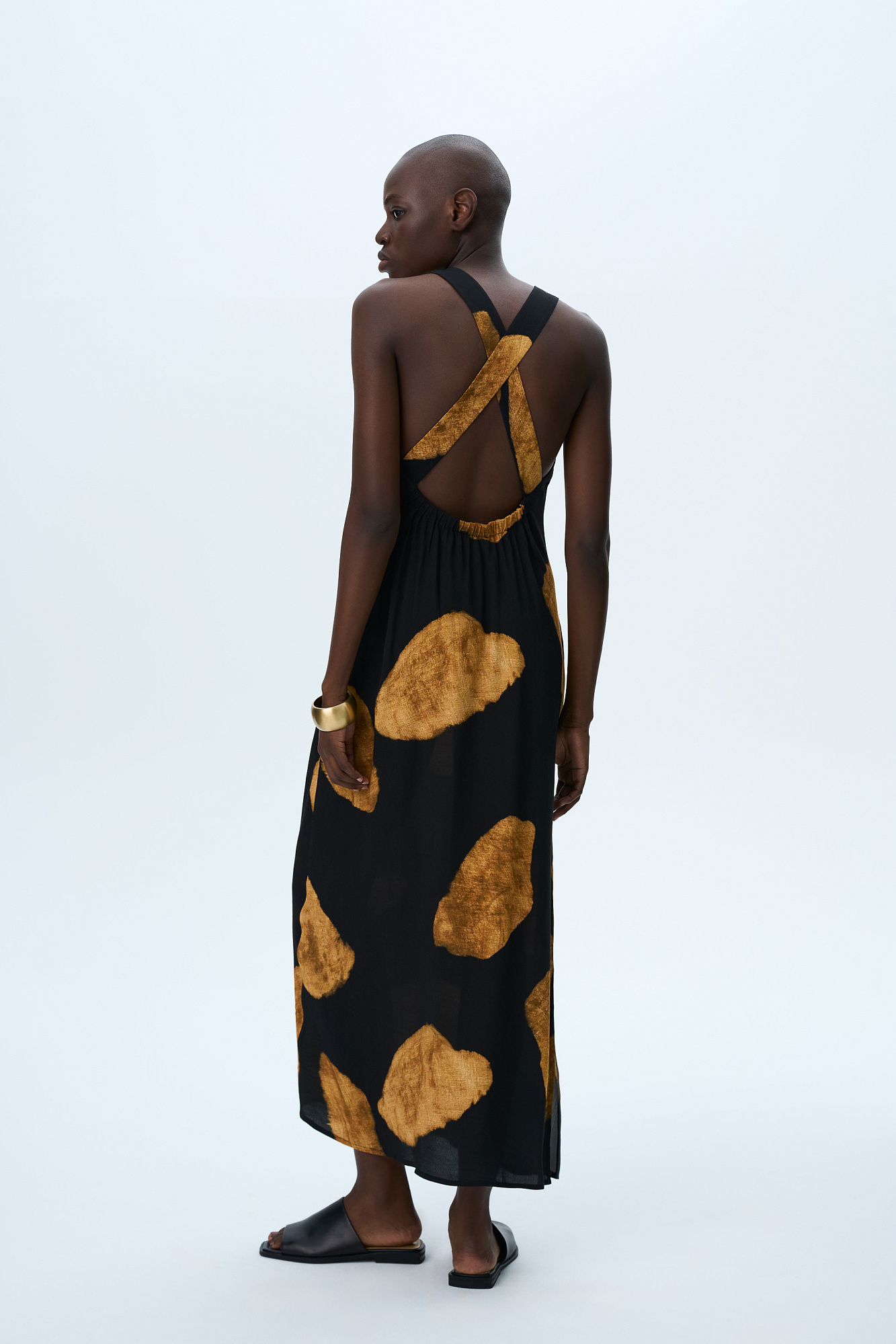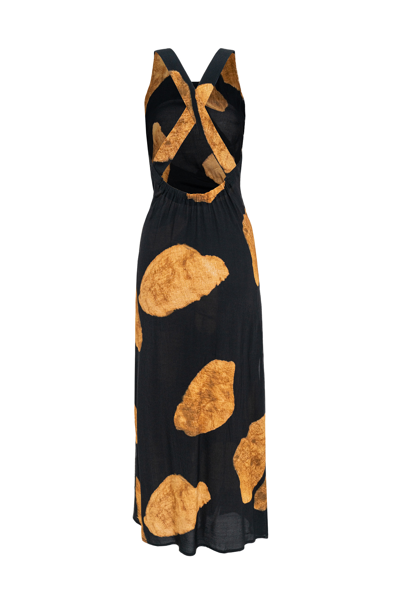 Принтованный сарафан длины миди из 100% вискозы. Модель прямого кроя, с круглым вырезом горловины, без рукавов, на широких бретелях, перекрученных на спине, драпировкой на талии и двумя боковыми карманами.