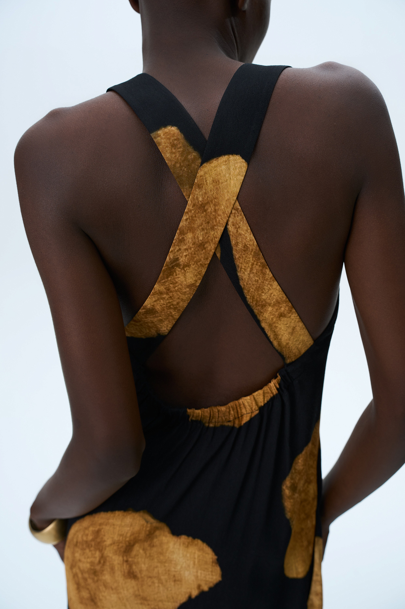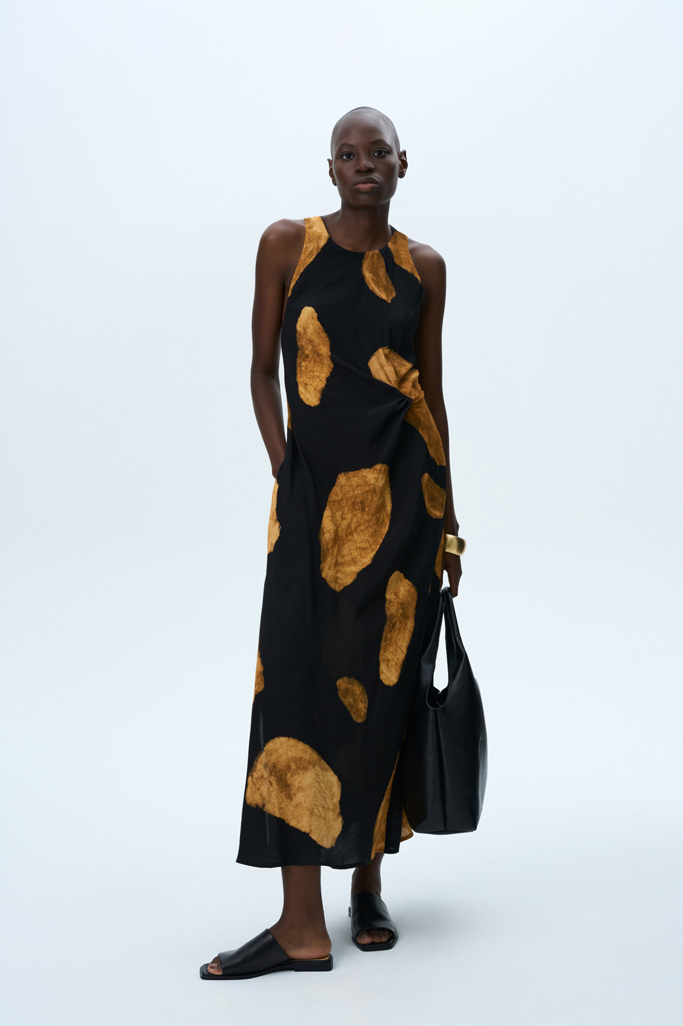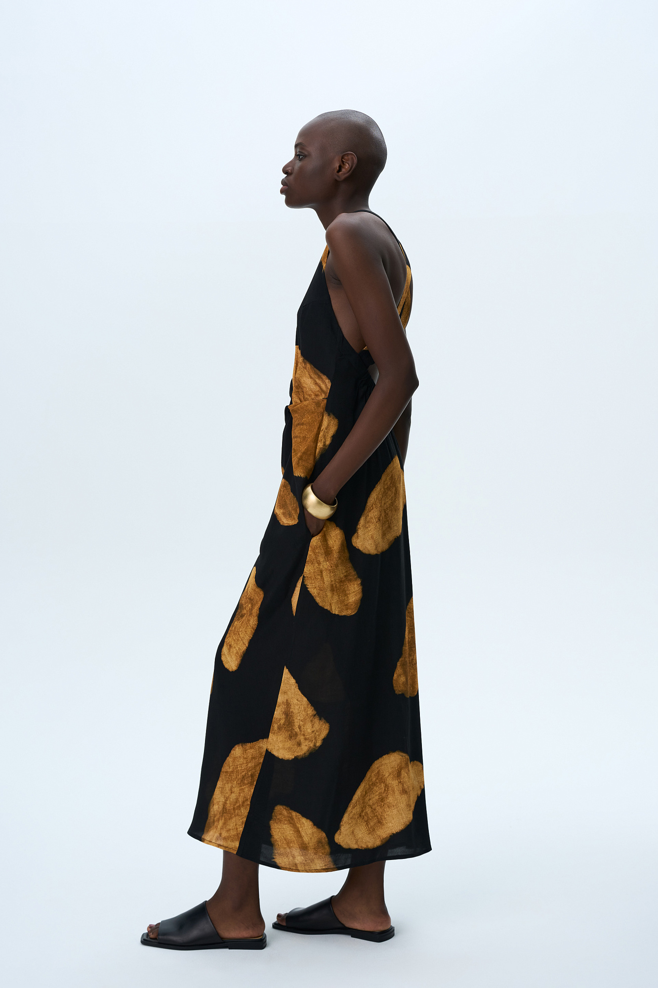 Принтованный сарафан длины миди из 100% вискозы. Модель прямого кроя, с круглым вырезом горловины, без рукавов, на широких бретелях, перекрученных на спине, драпировкой на талии и двумя боковыми карманами.