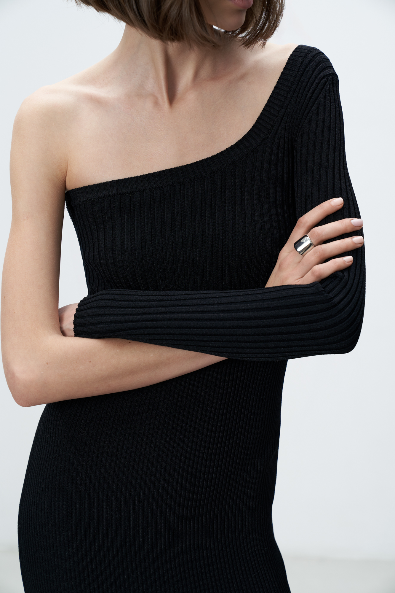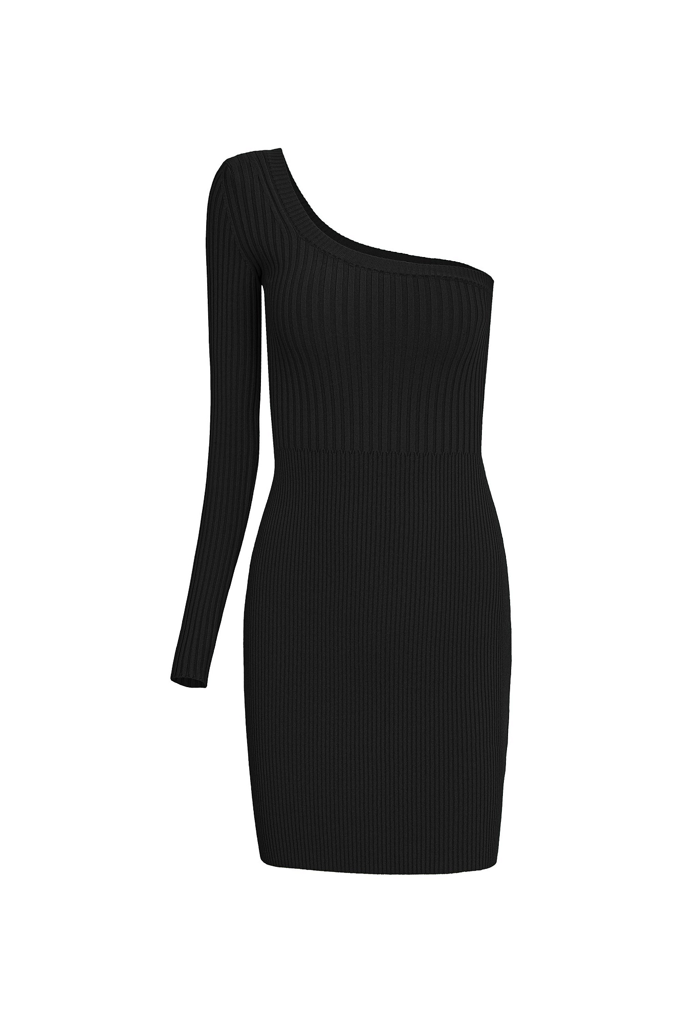Трикотажное платье длины мини из вискозы. Модель приталенного силуэта с одним рукавом и открытым плечом.