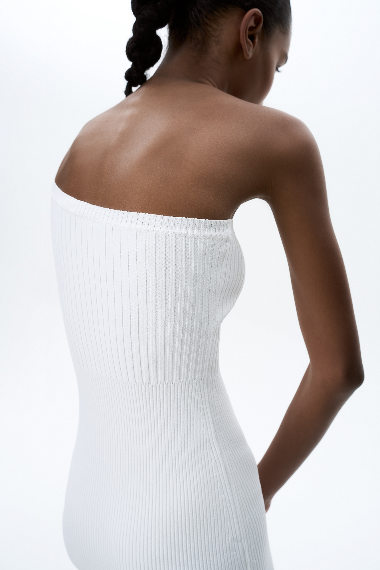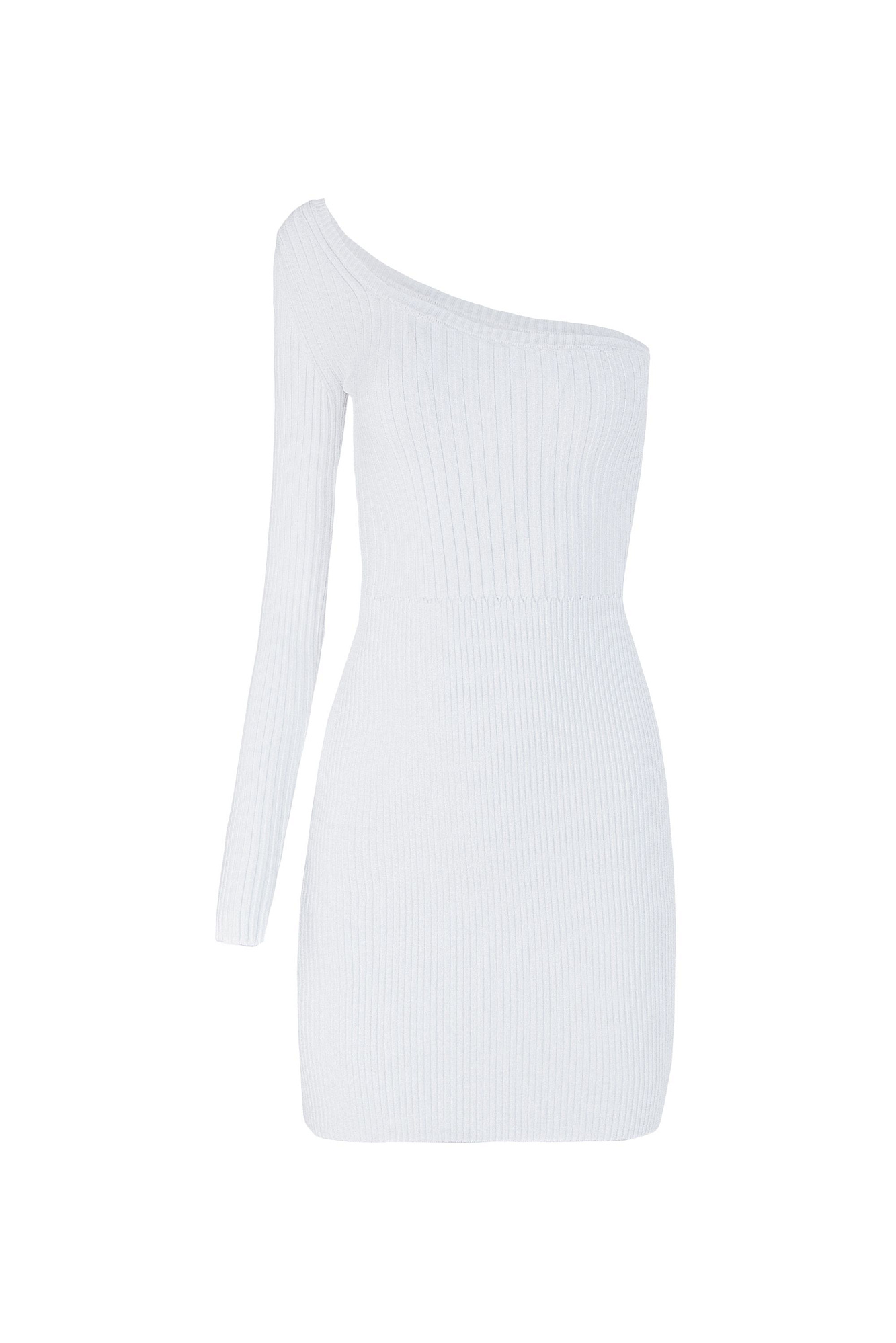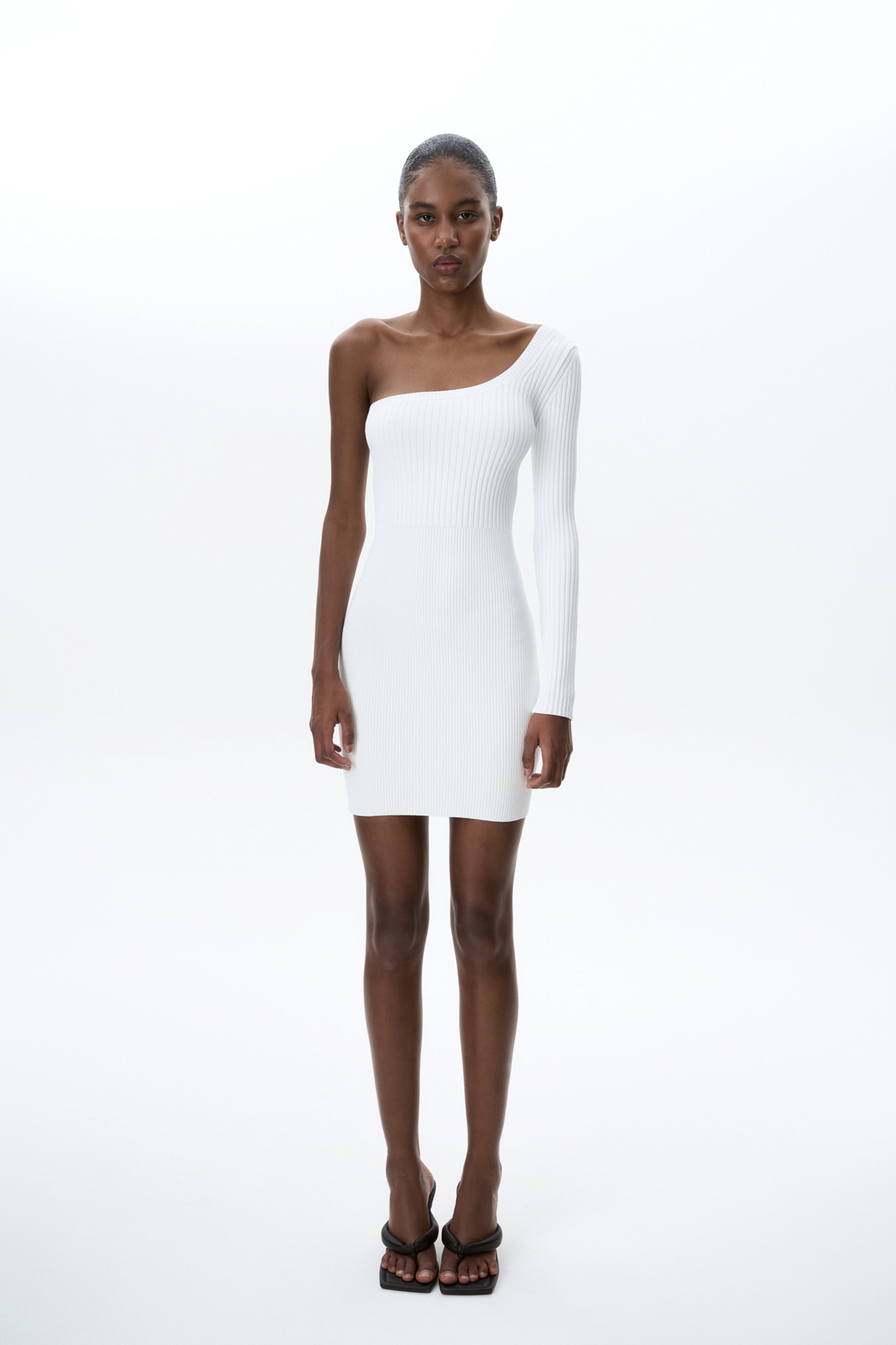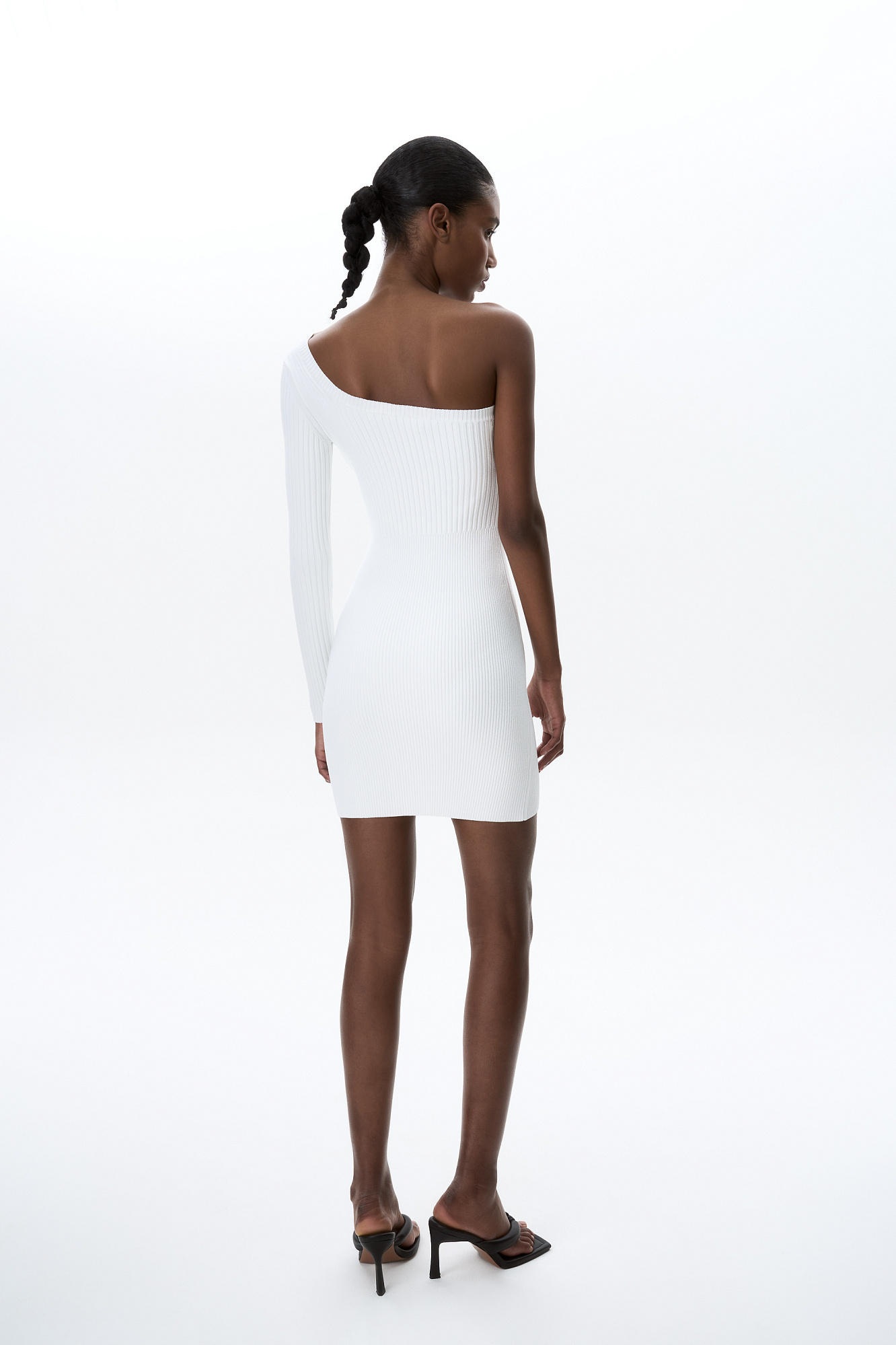 Трикотажное платье длины мини из вискозы. Модель приталенного силуэта с одним рукавом и открытым плечом.