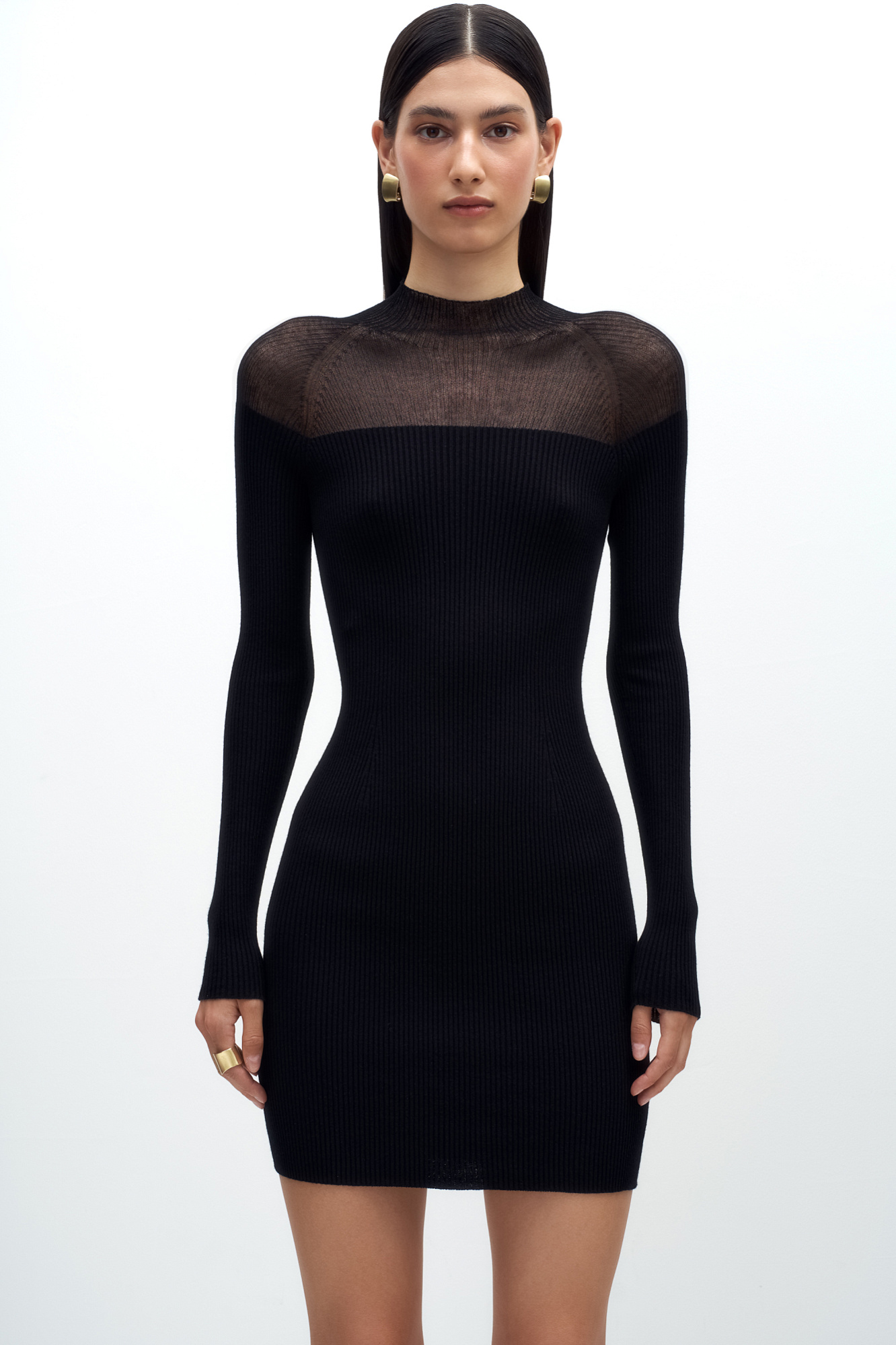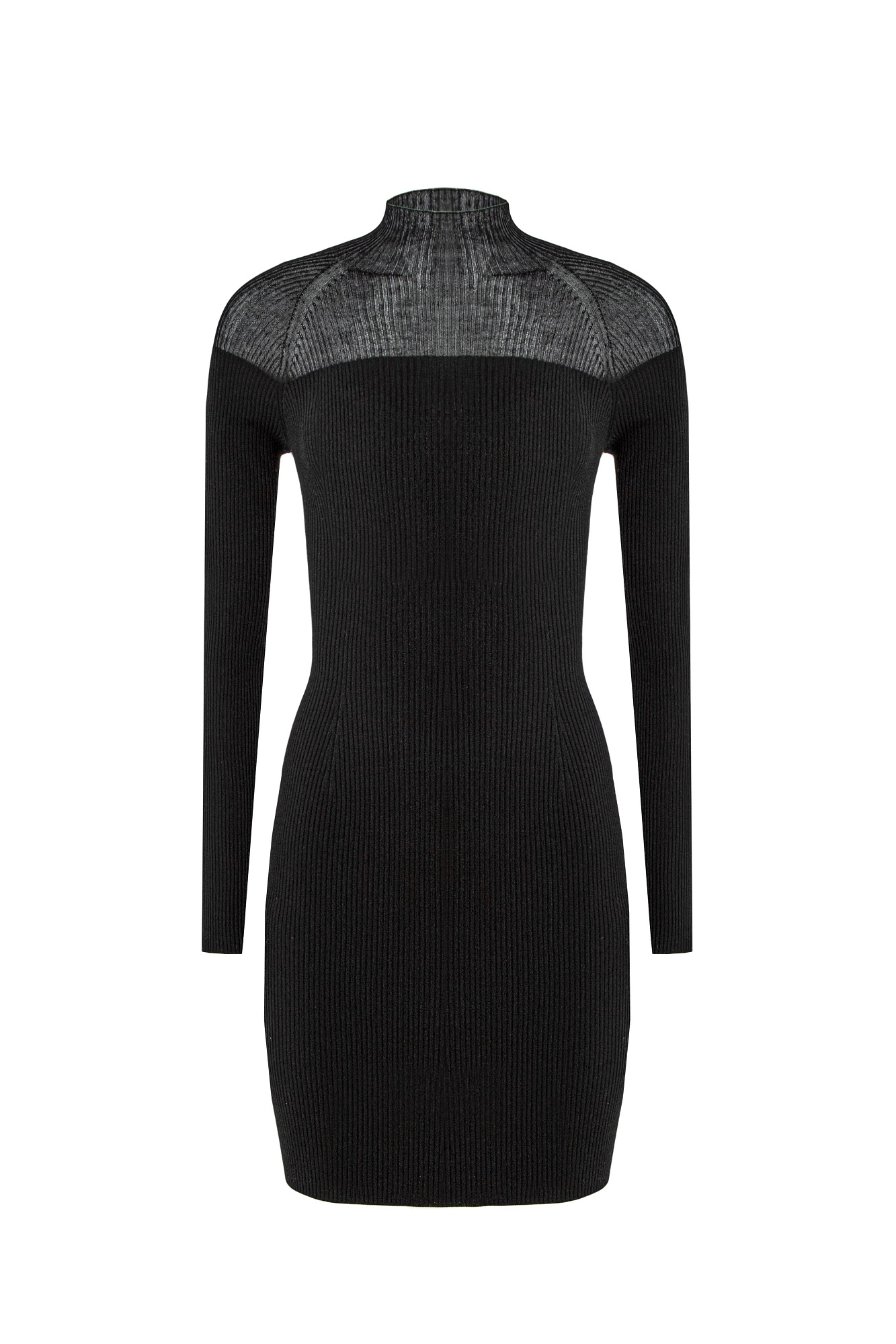 Трикотажное платье длины мини из вискозы в рубчик. Модель приталенного силуэта, с длинными рукавами и воротником-стойкой. Верх изделия выполнен из тонкой пряжи, создавая акцент на зону плеч.