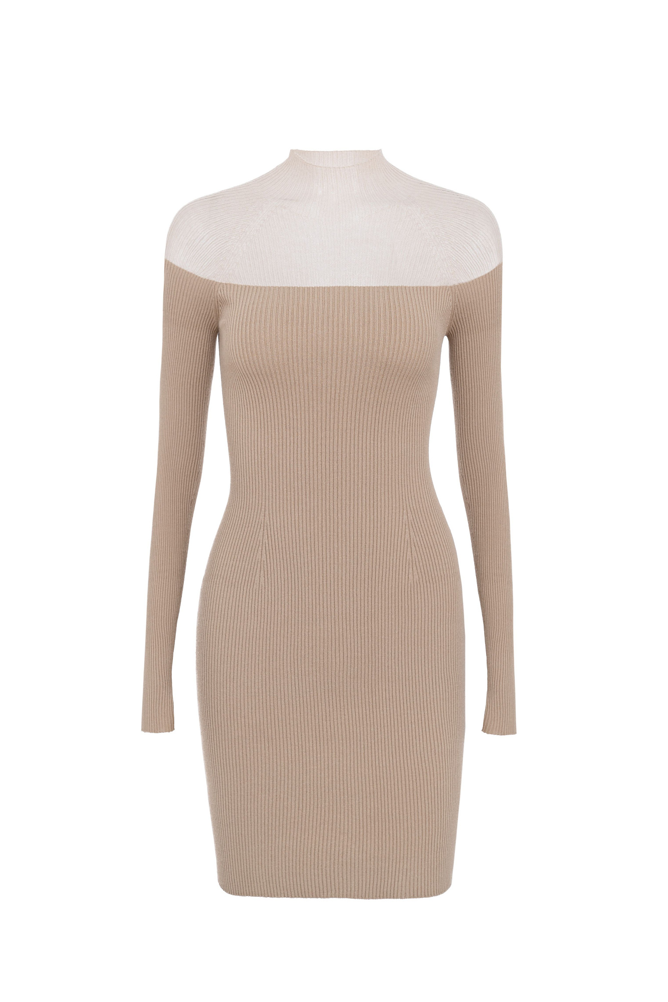Трикотажное платье длины мини из вискозы в рубчик. Модель приталенного силуэта, с длинными рукавами и воротником-стойкой. Верх изделия выполнен из тонкой пряжи, создавая акцент на зону плеч.