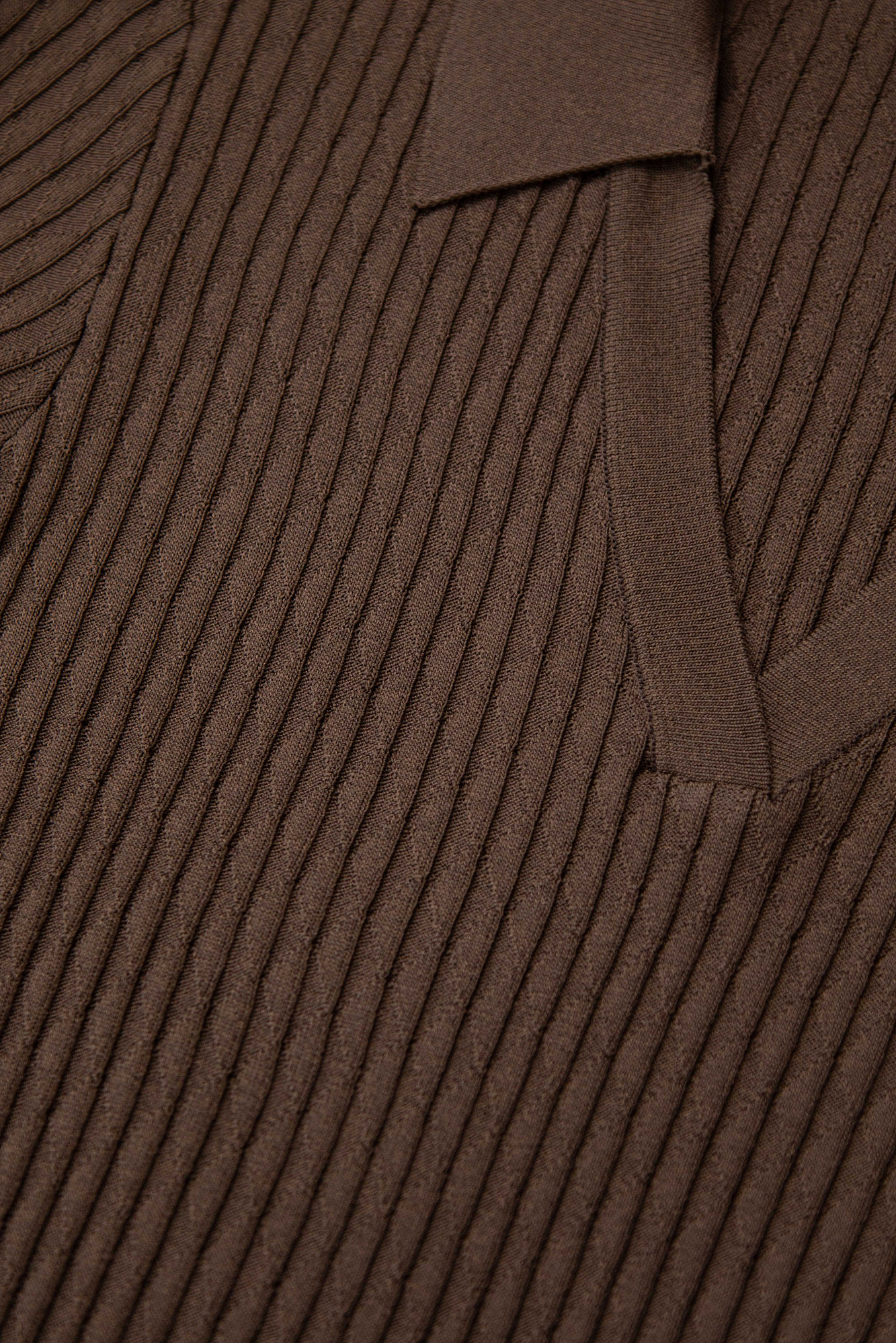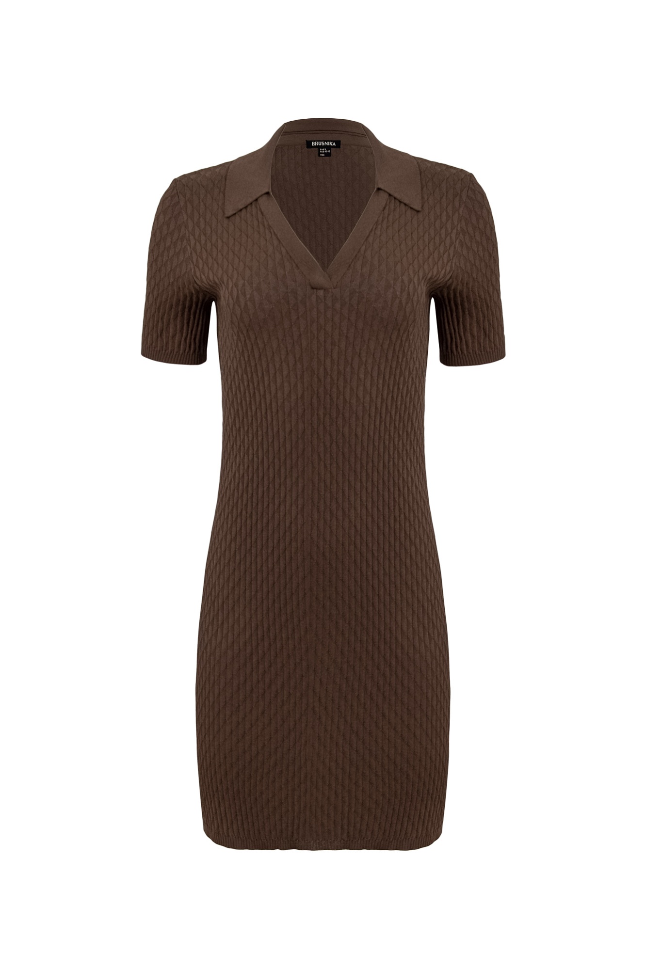 Платье из вискозы, фактурной вязки в широкий ромб, с коротким рукавом и воротником-поло.
