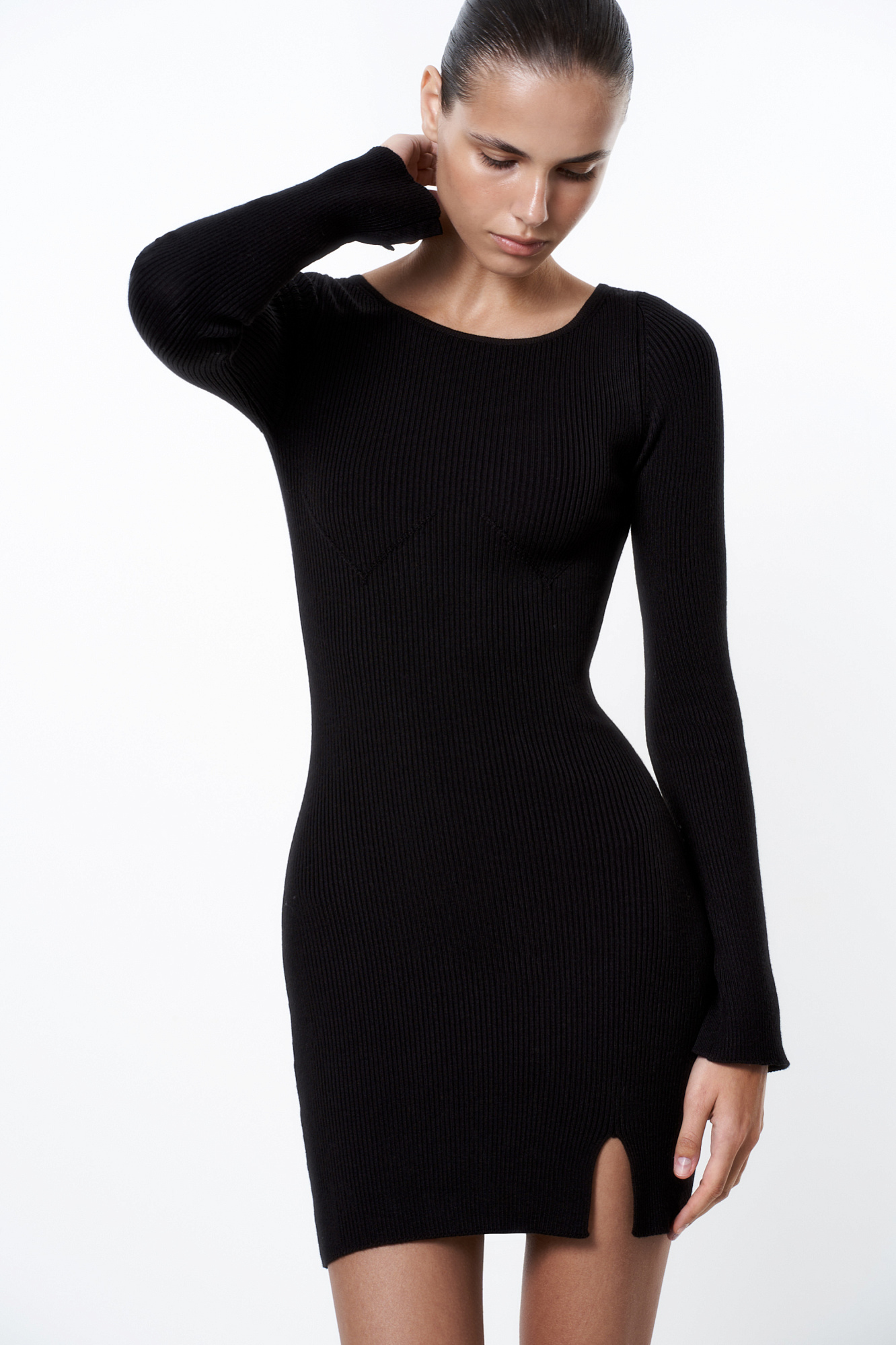 Трикотажное мини платье из шерсти с добавлением вискозы. Модель по фигуре с круглым вырезом горловины, длинными рукавами и невысоким разрезом спереди. Изделие декорировано объемными вытачками, имитирующими бюстье.
