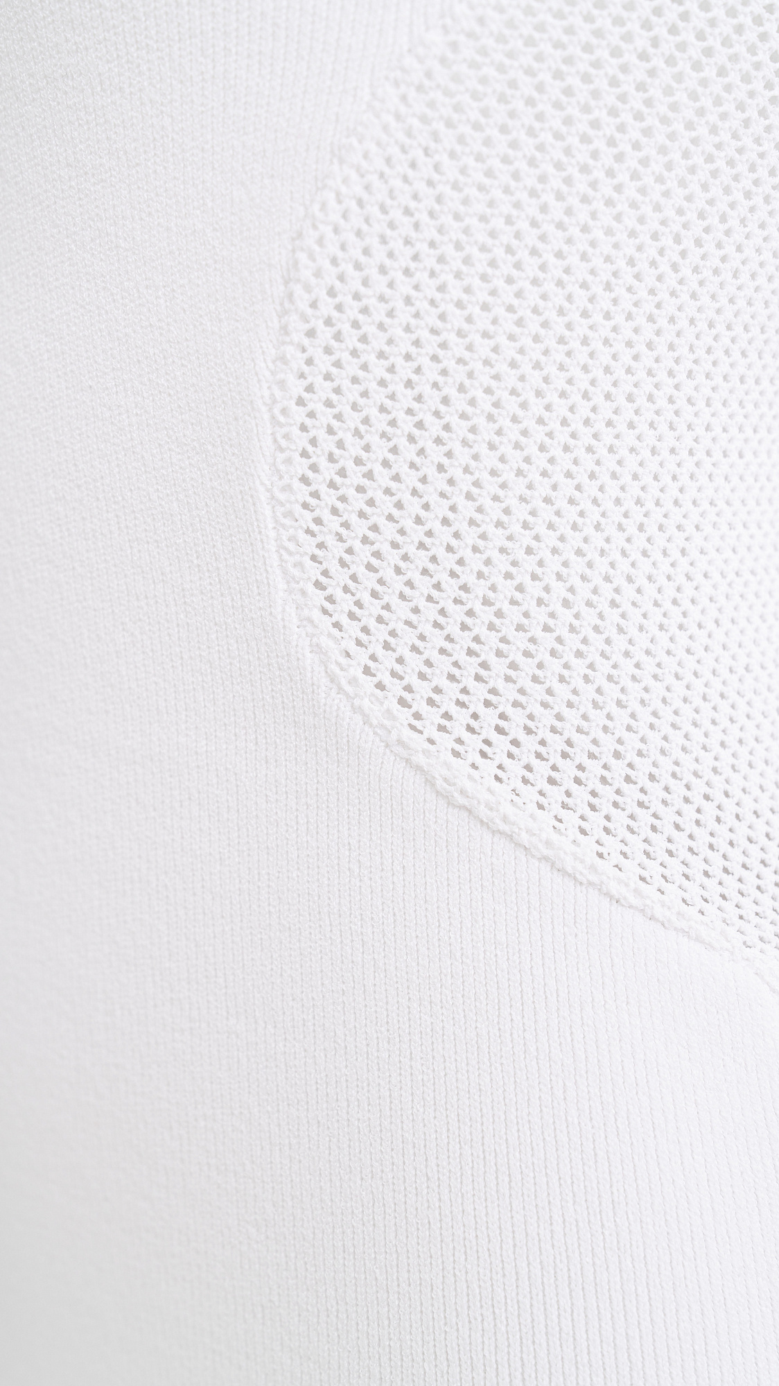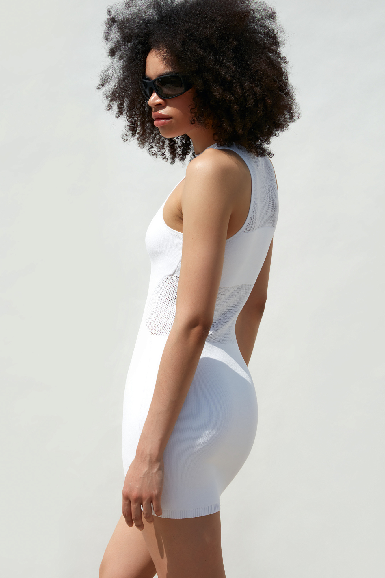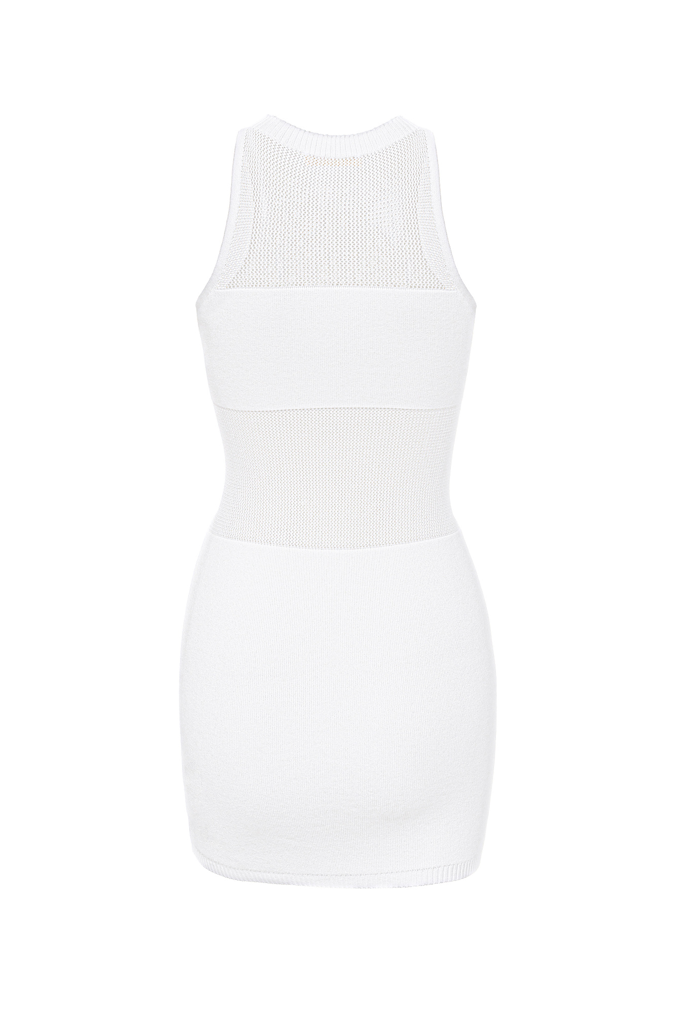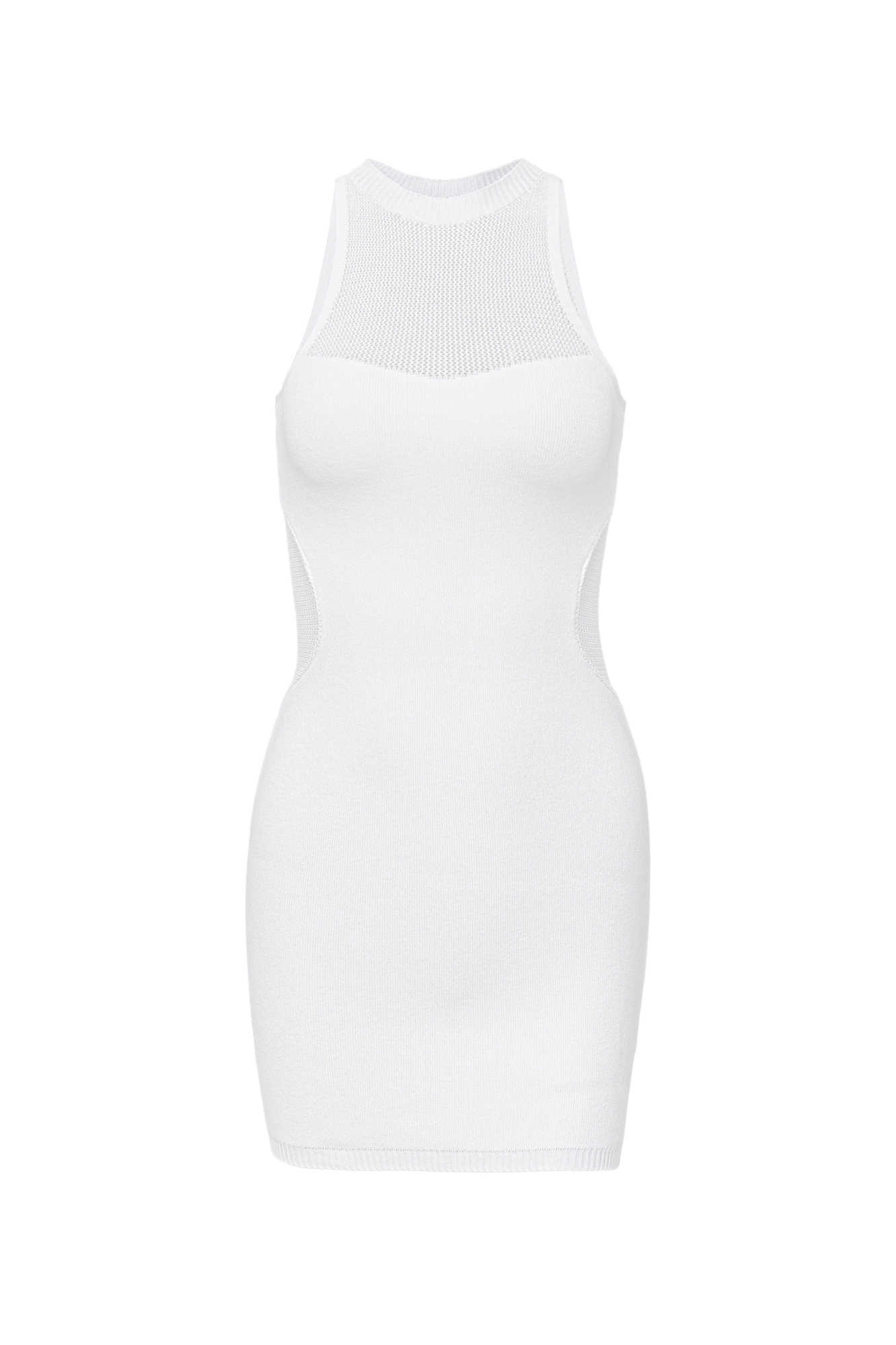 Трикотажное платье из вискозы длины мини. Модель по фигуре с неглубоким вырезом горловины, американской проймой и открытыми плечами. Изделие декорировано вставкой из сетки на груди.